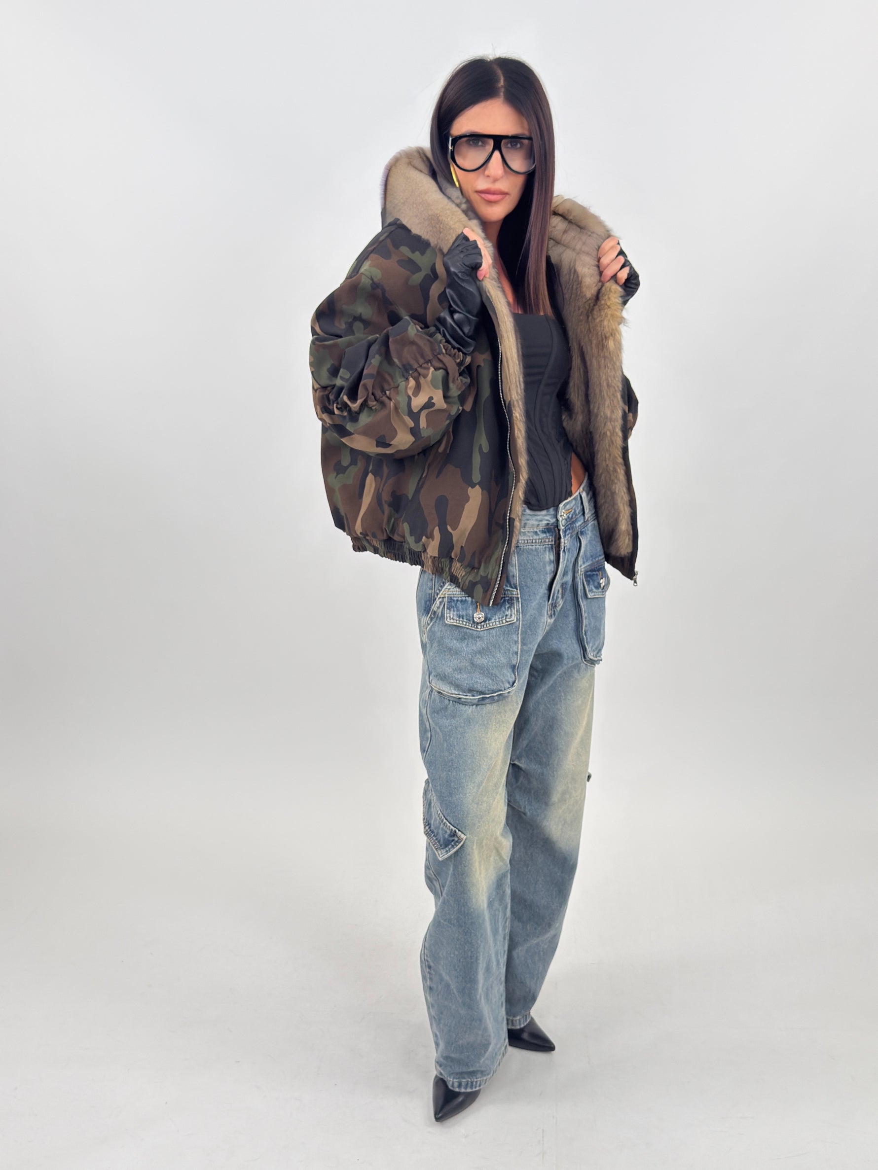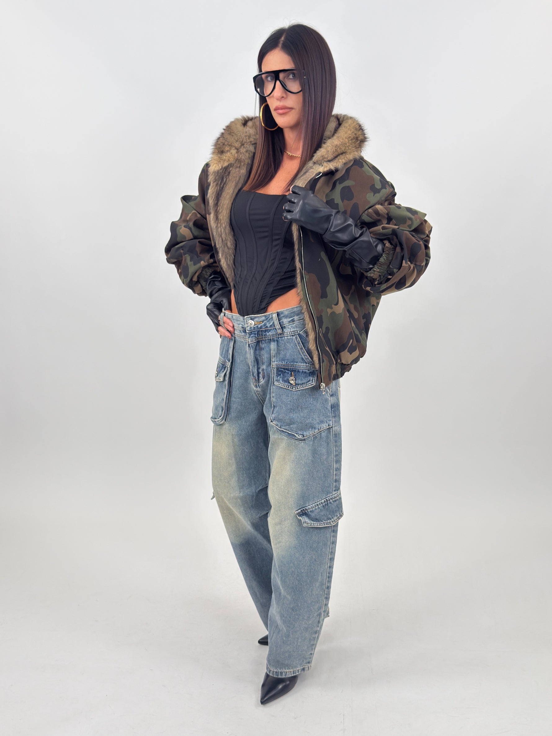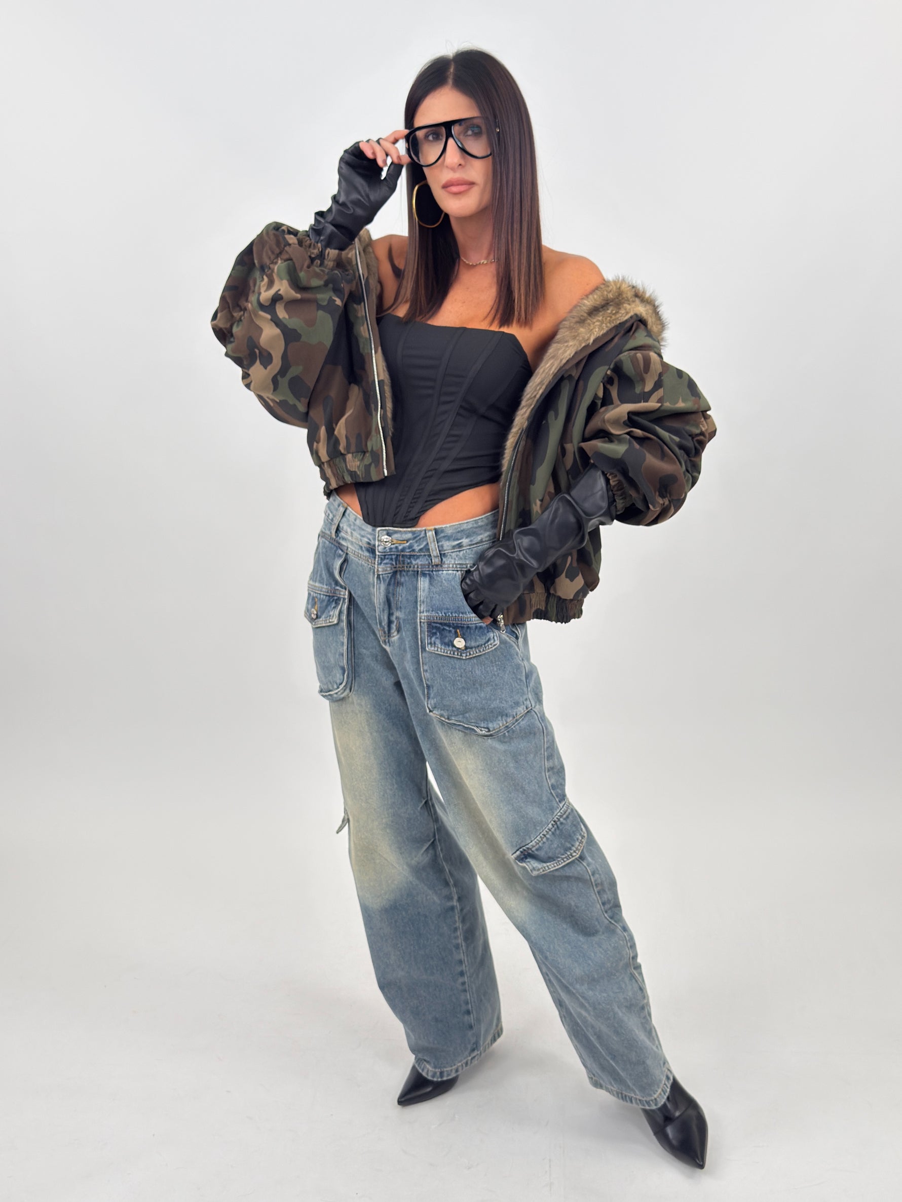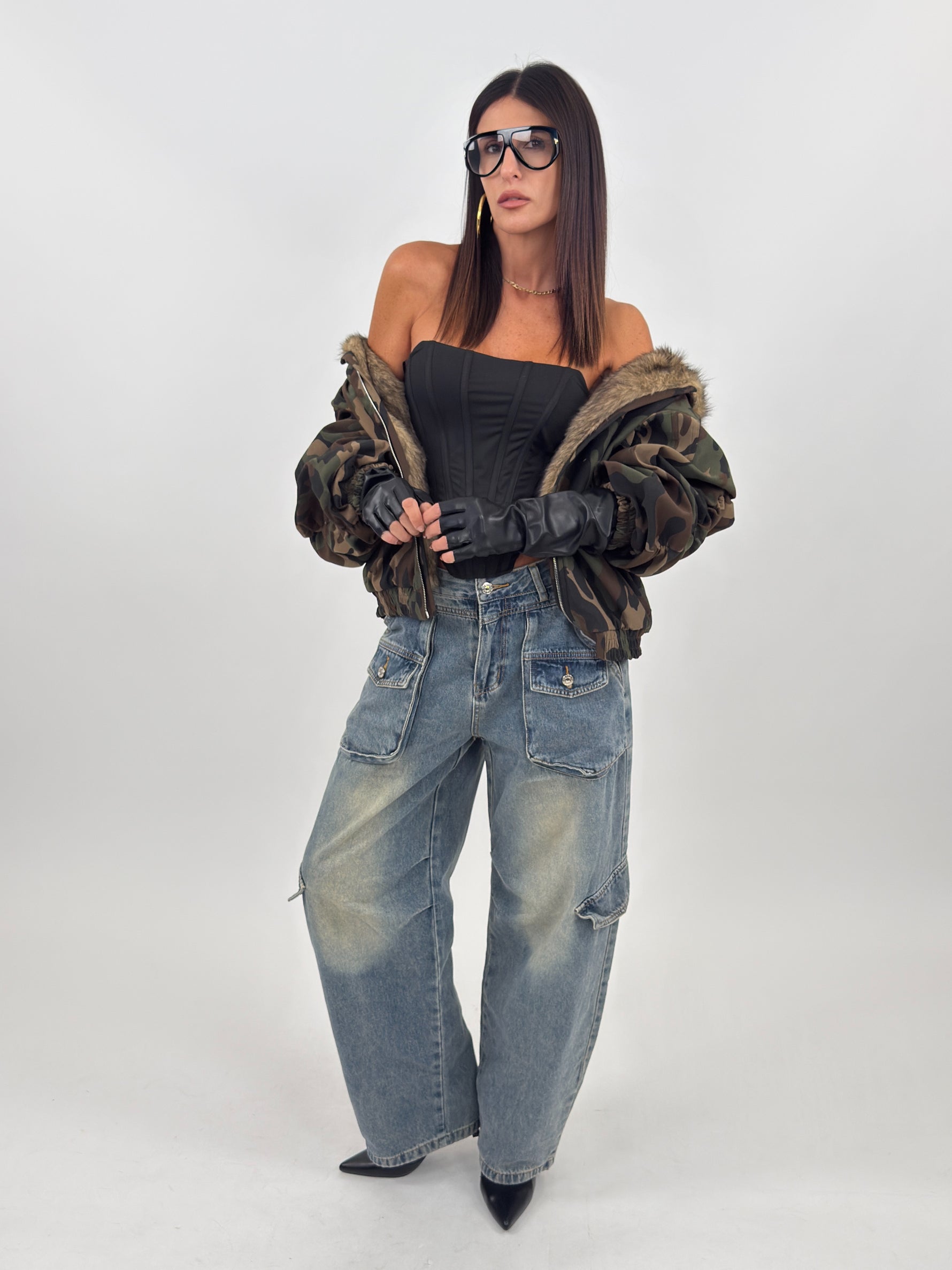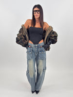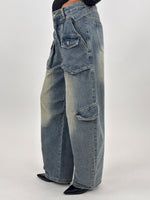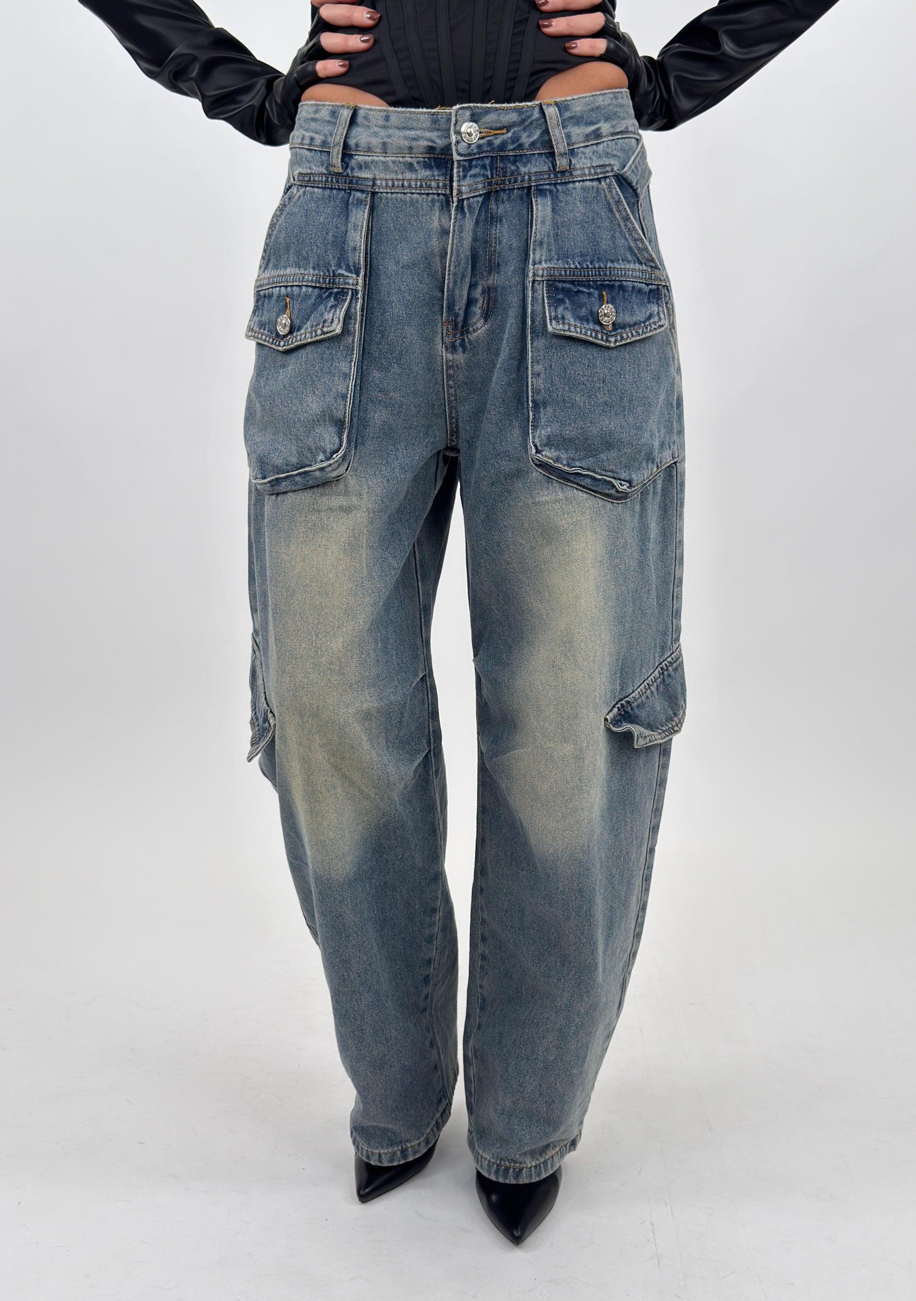 Jeans in denim sabbiato modello cargo. Presenta tasconi frontali e laterali. Chiusura con zip e bottone.