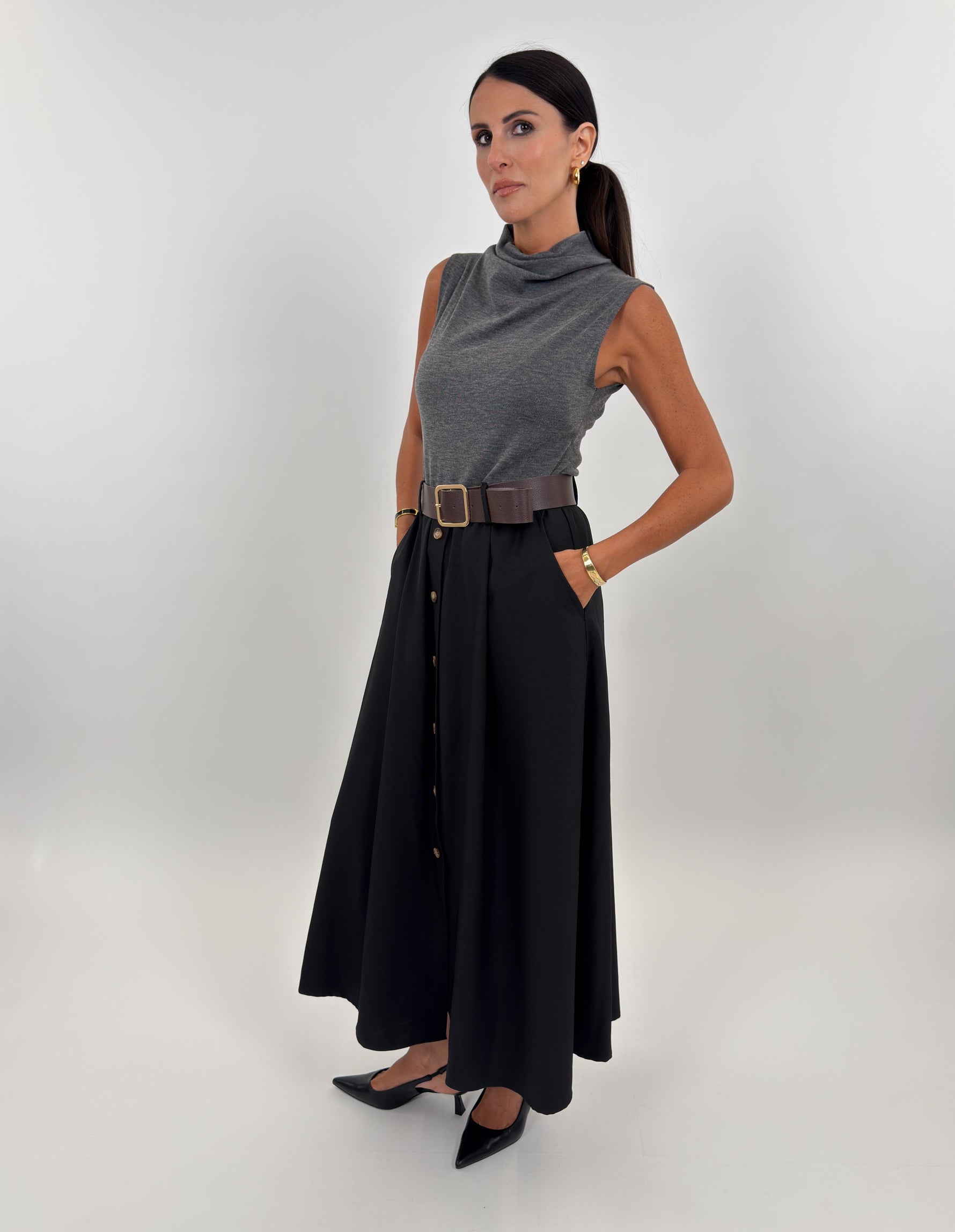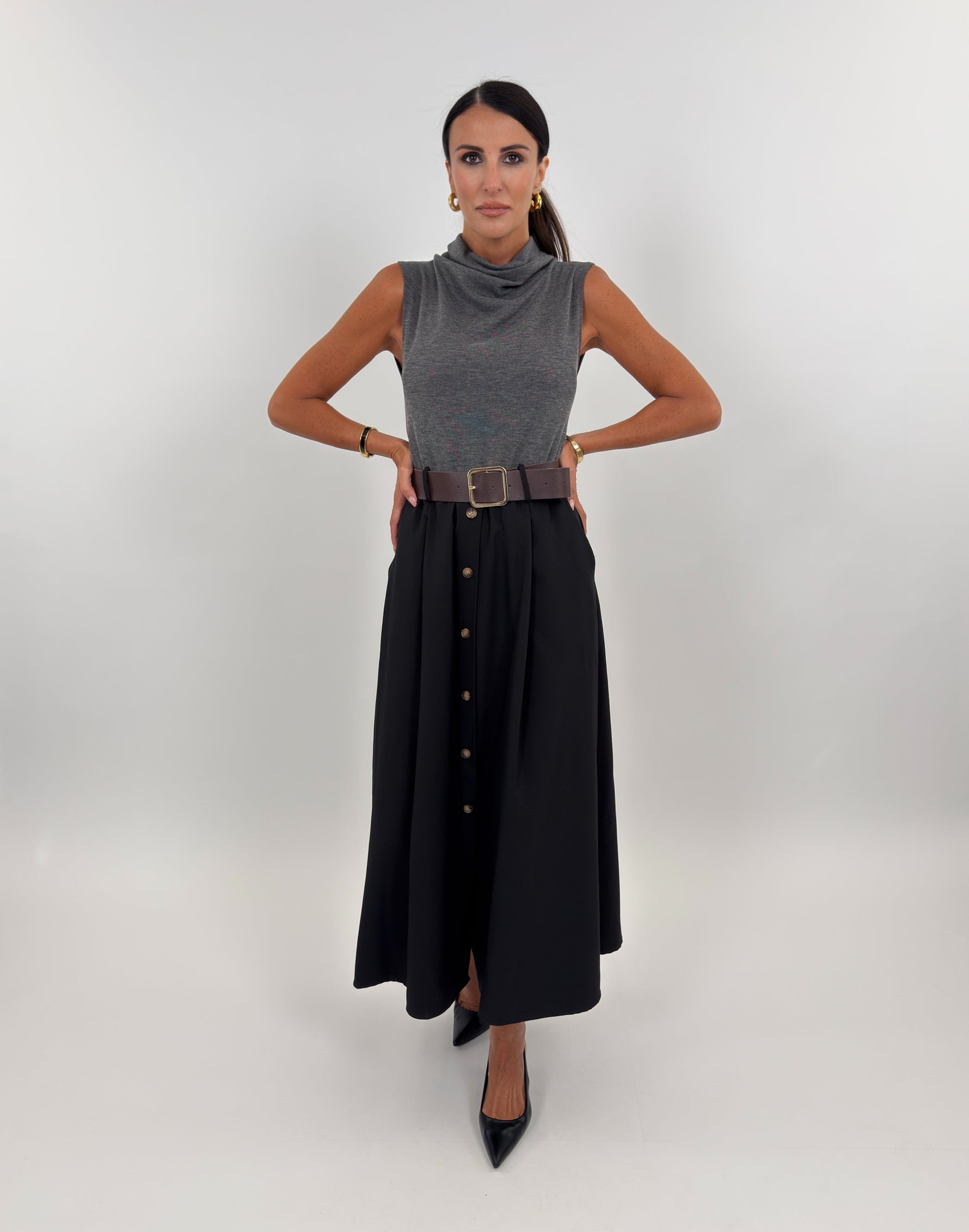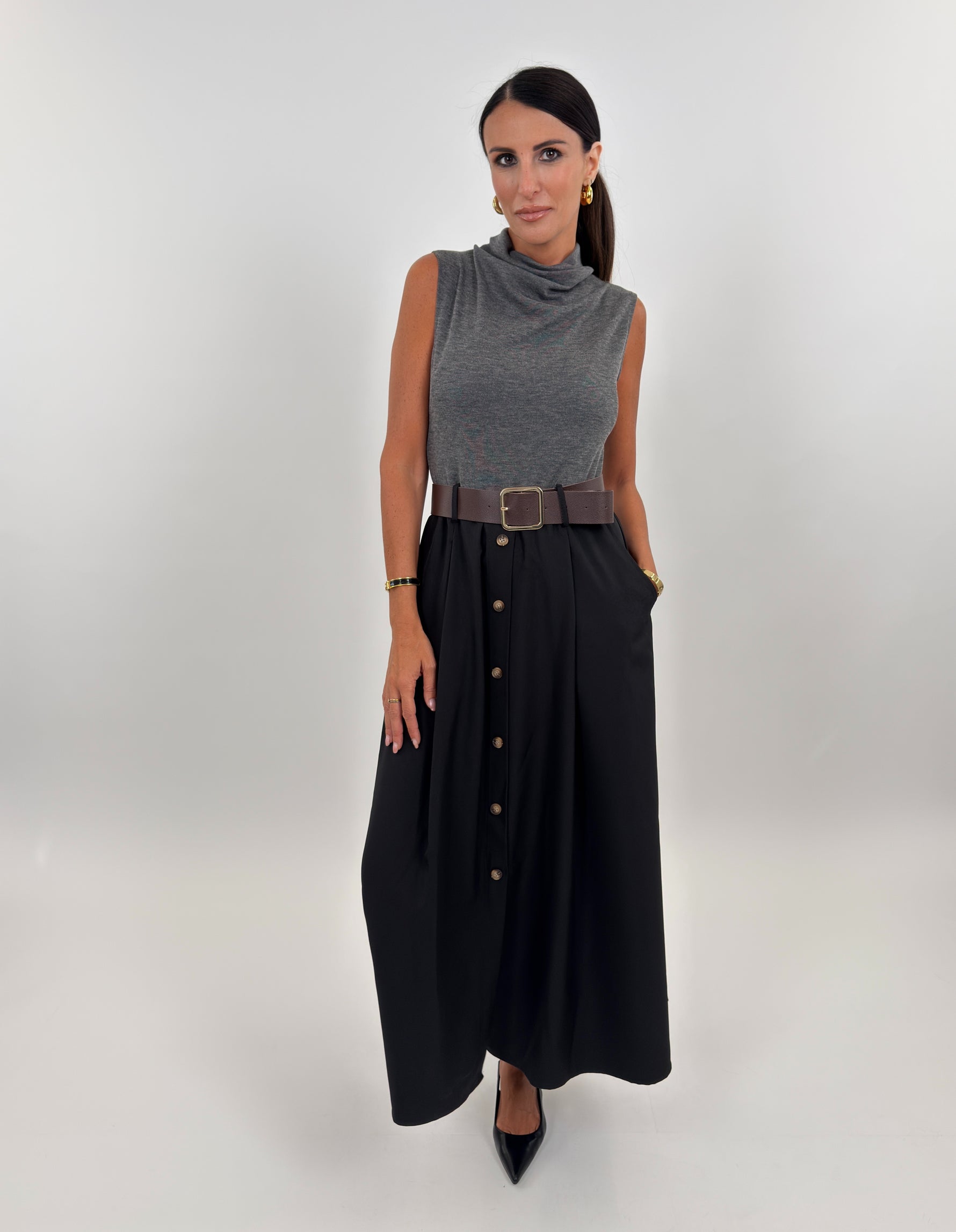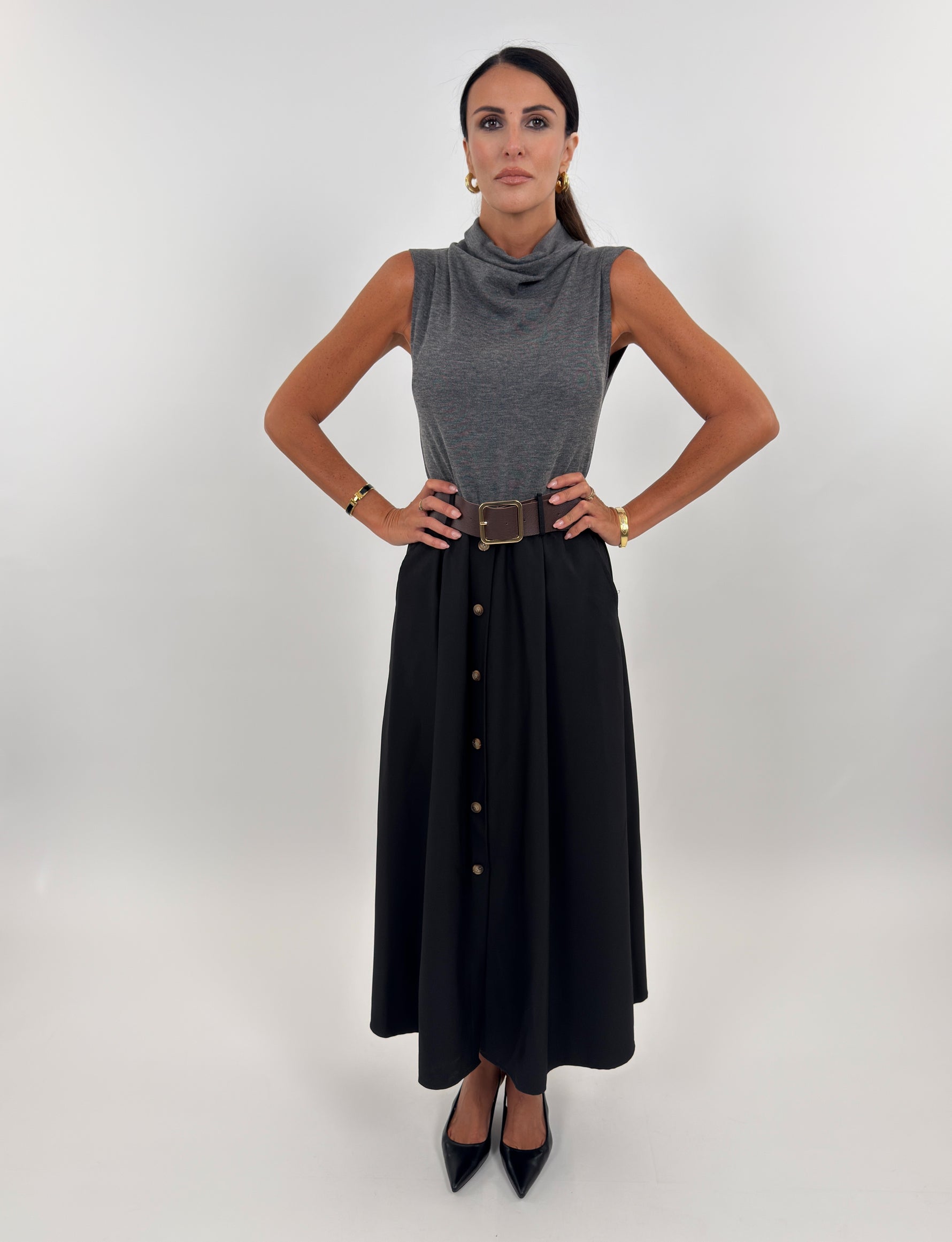 Abito modello lungo a mezzo collo e giromanica. Presenta gonna morbida a contrasto di colore e tessuto con finti bottoncini e tasche laterali. Incluso di cintura in ecopelle con fibbia.