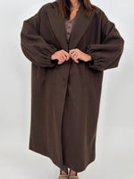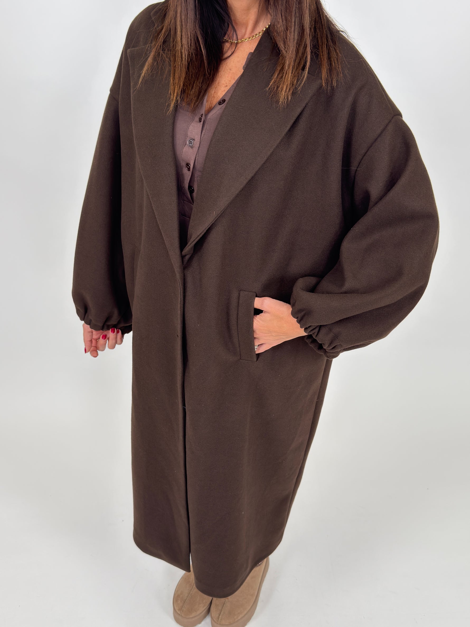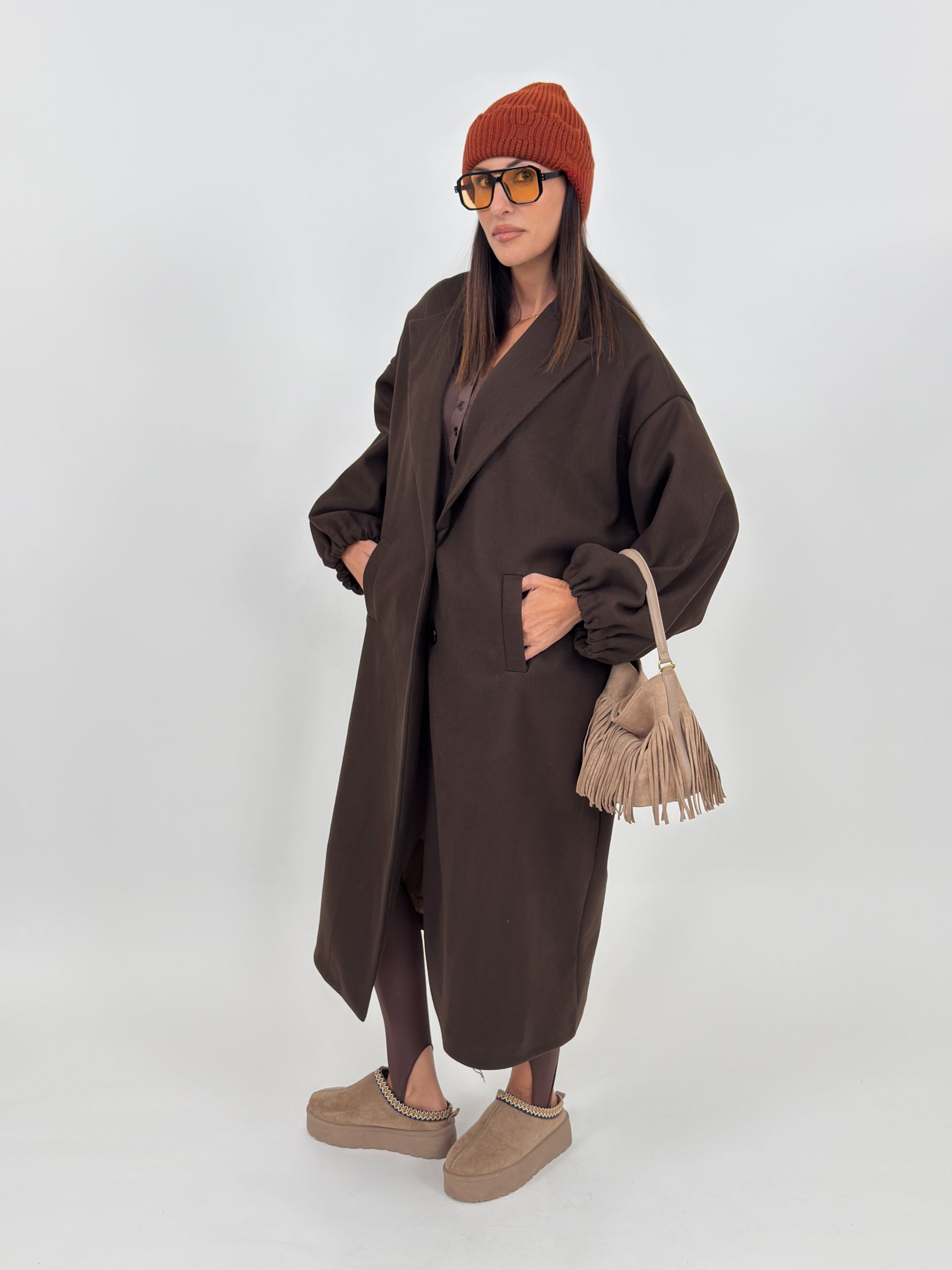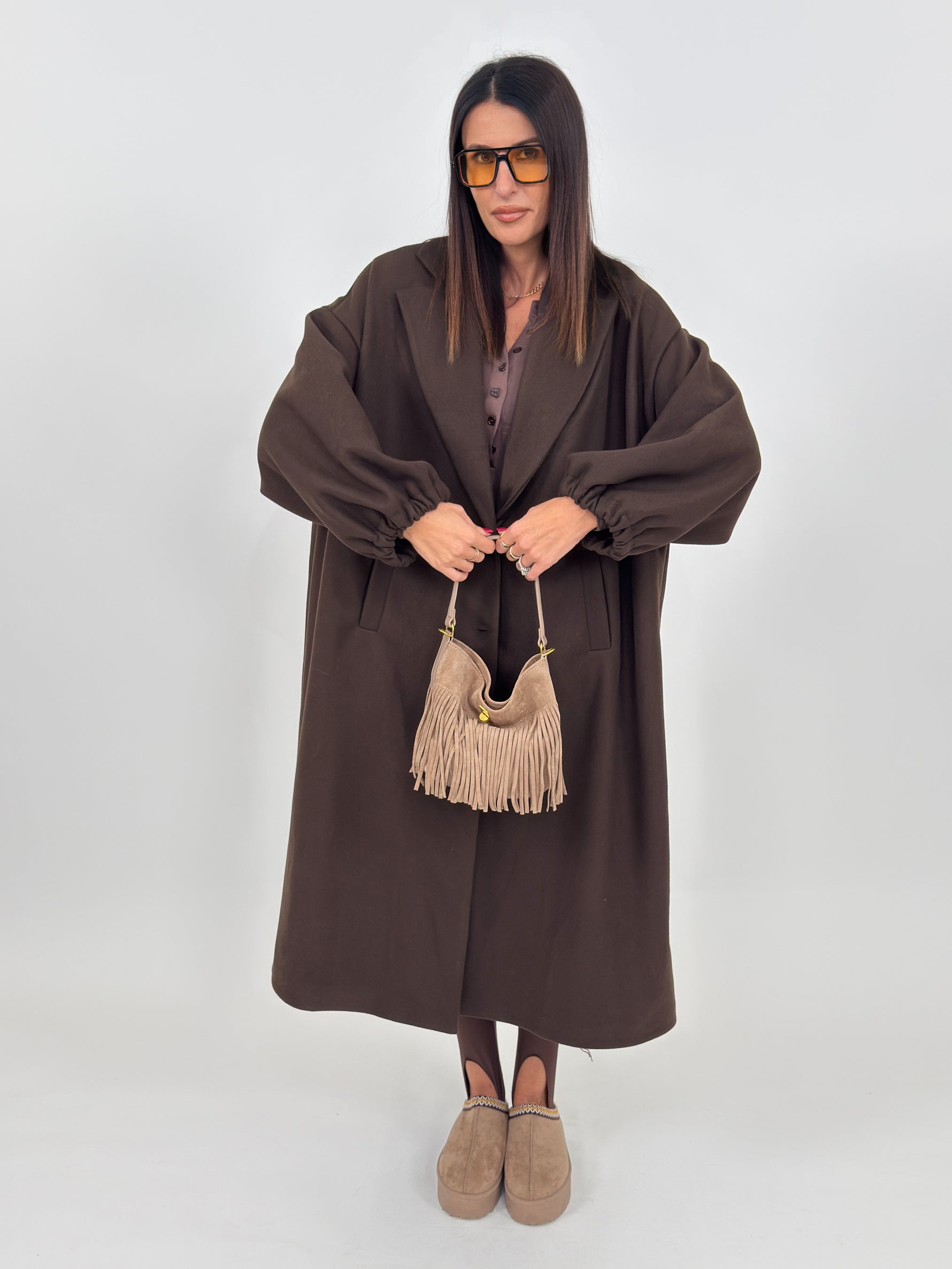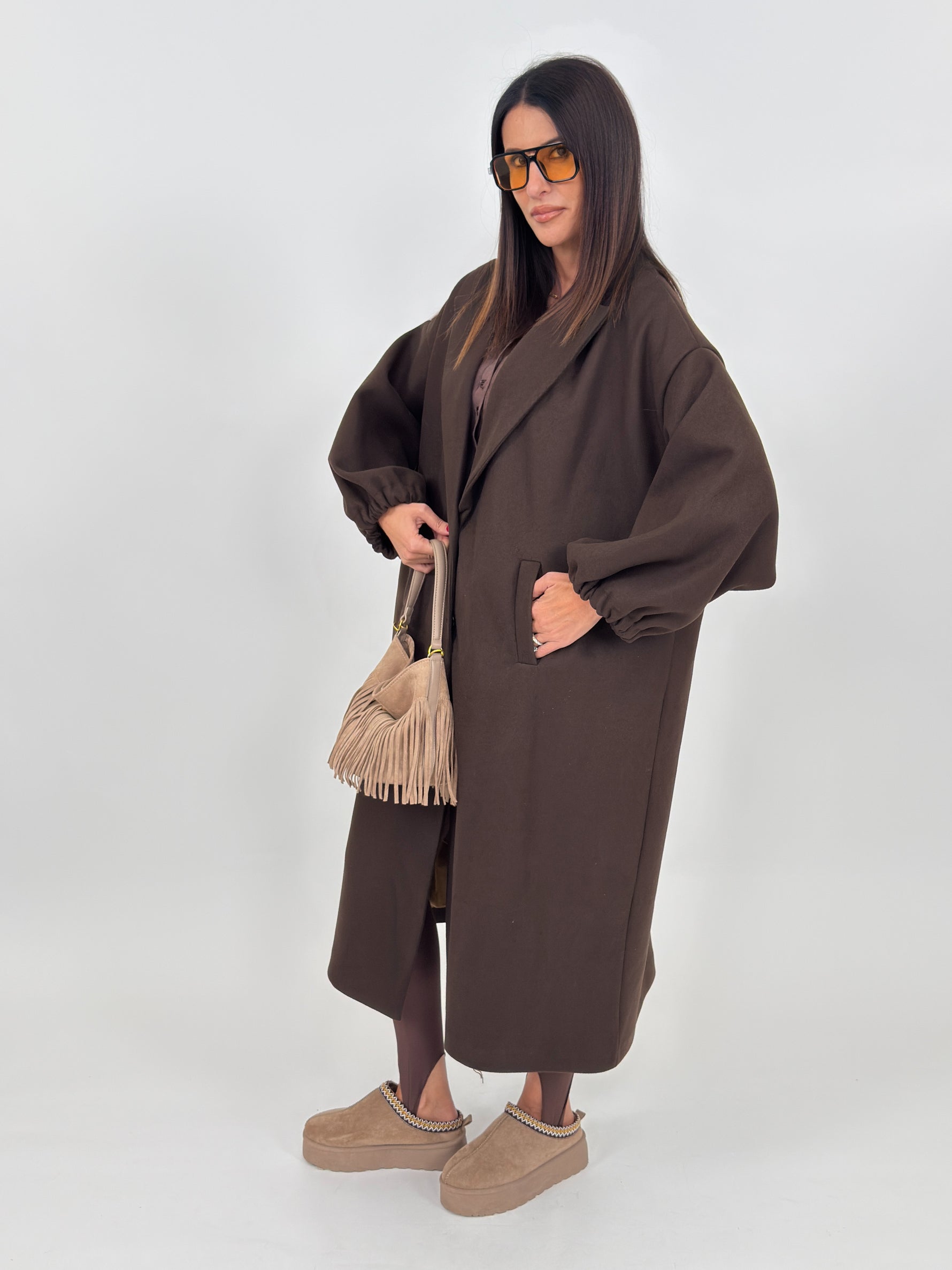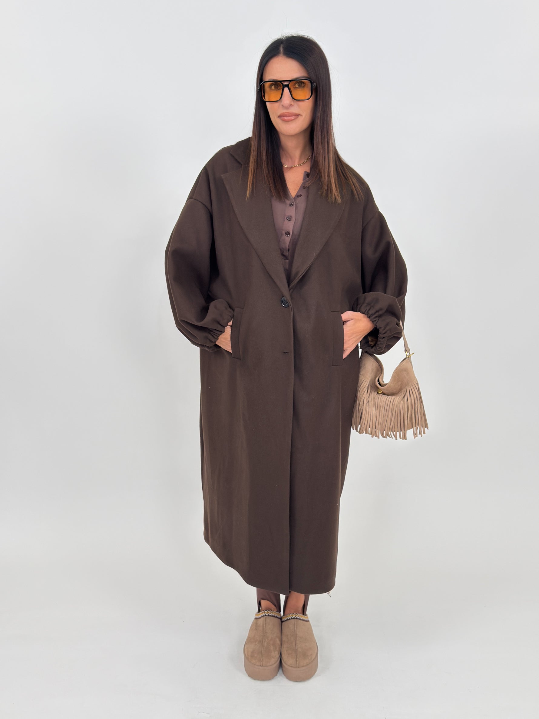 Cappotto modello lungo monopetto, manica lunga con orlo arricciato. Chiusura con due bottoni frontali e tasche laterali. Fodera interna.