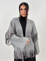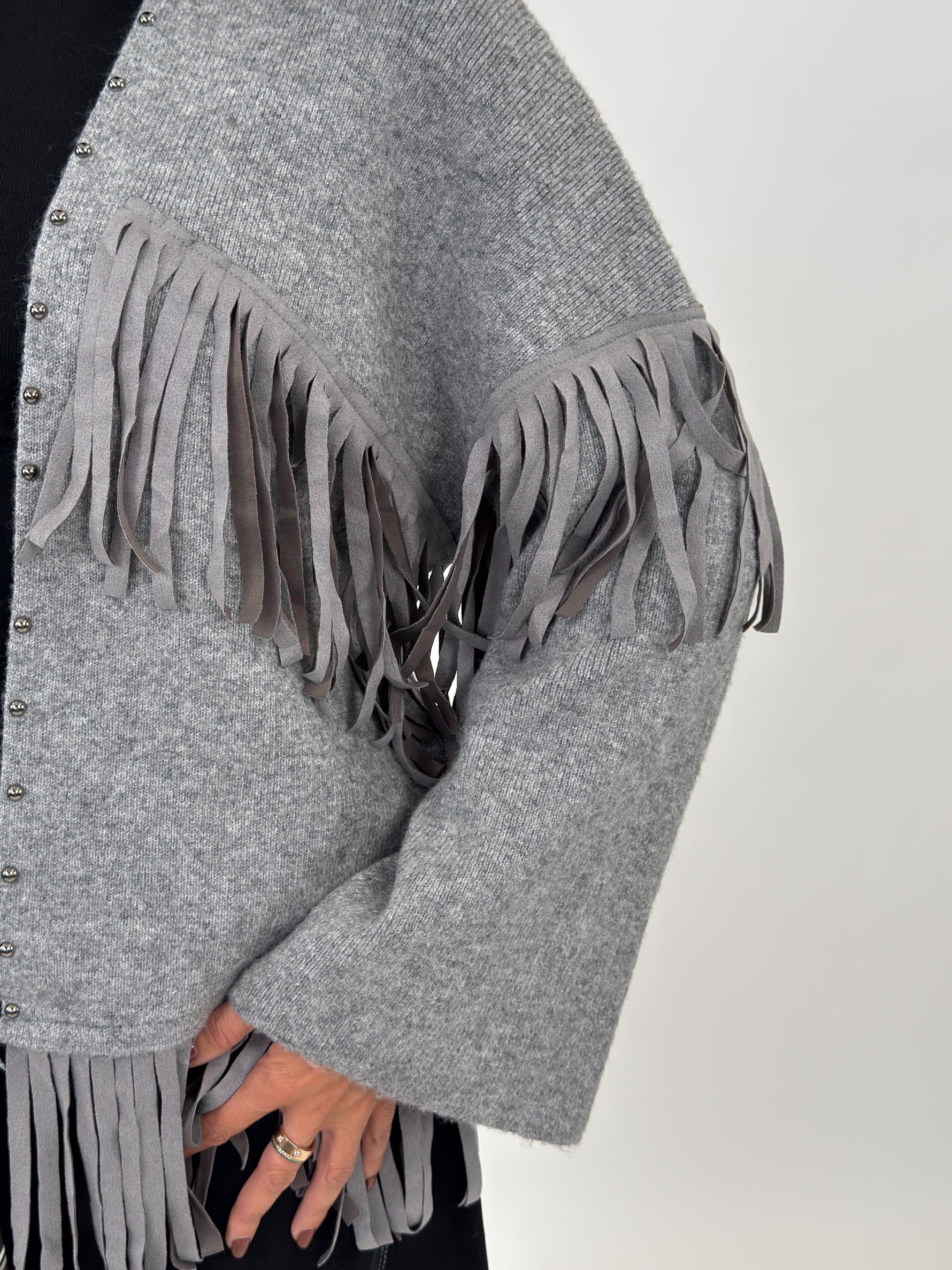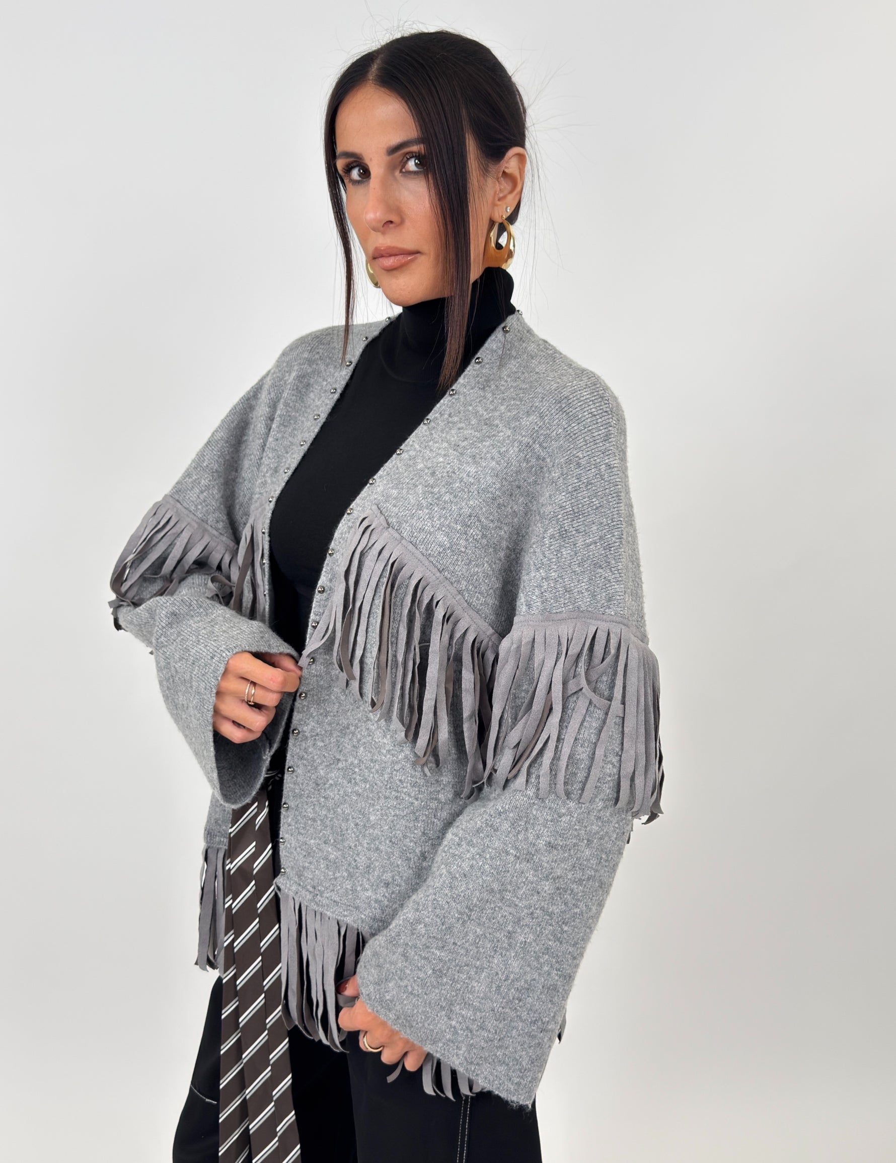 Cardigan modello lungo con scollo a V. Dettaglio frange e borchie. Senza allacciatura.