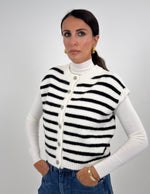 Cardigan modello smanicato nella trama a righe. Chiusura con bottoni frontali.