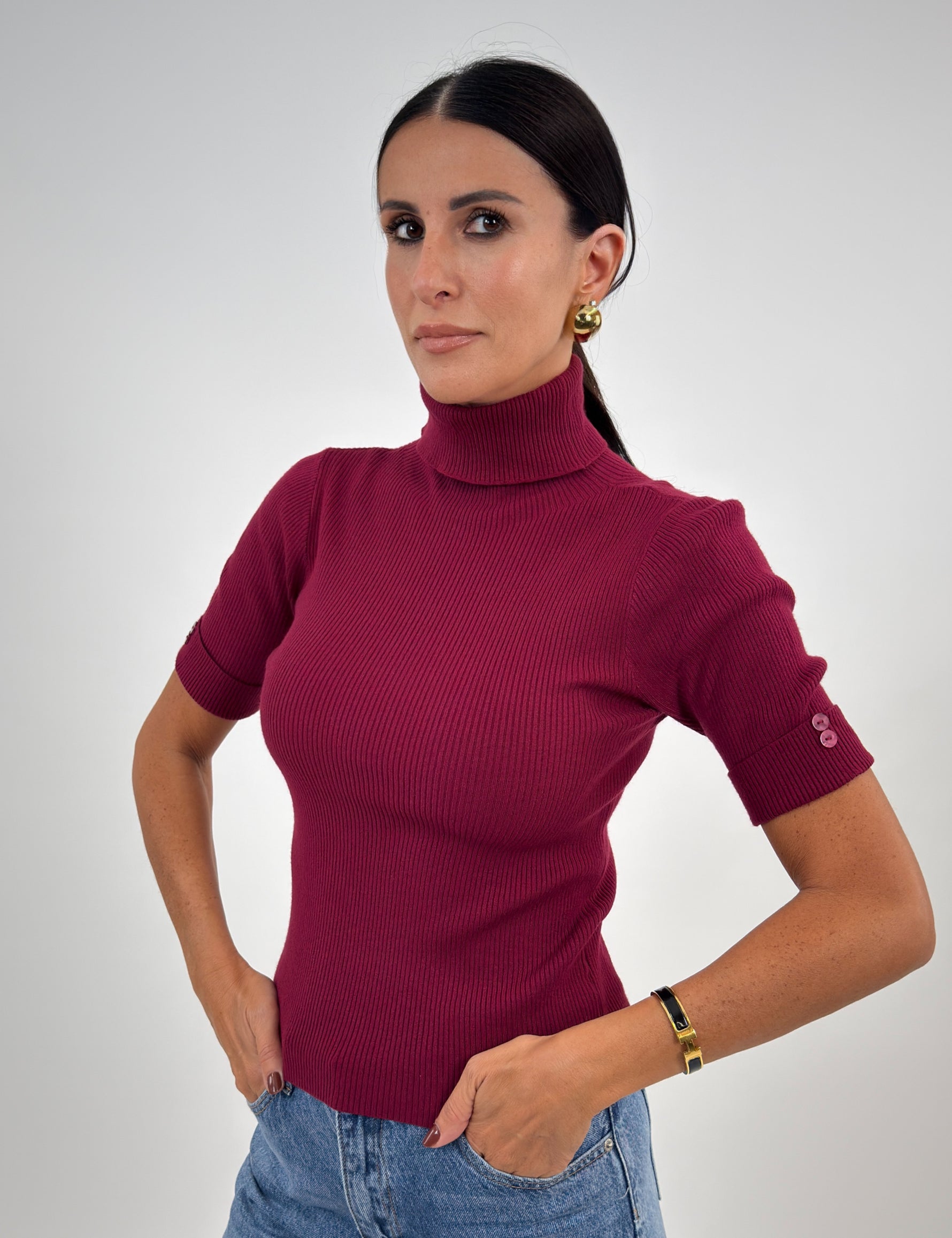 Dolcevita modello lungo, trama a coste, mezza manica con bottoncini finti laterali.
