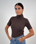 Dolcevita modello lungo, trama a coste, mezza manica con bottoncini finti laterali.