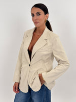 Giacca modello monopetto in effetto velluto a coste. Presenta tasche frontali con patta e tasca sul petto. Manica lunga con spallina imbottita. Chiusura con bottone.