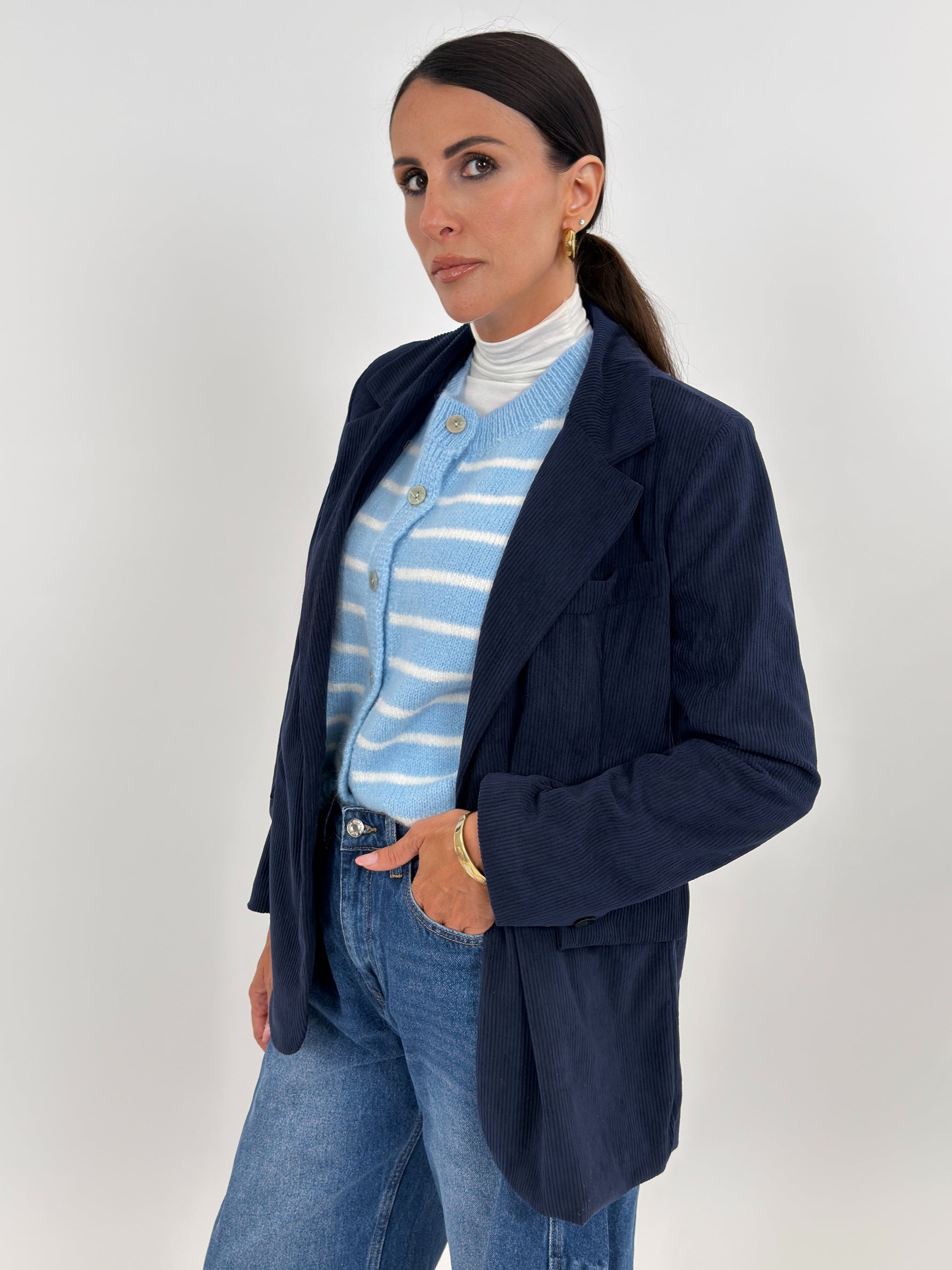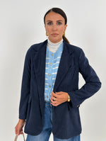 Giacca modello monopetto in effetto velluto a coste. Presenta tasche frontali con patta e tasca sul petto. Manica lunga con spallina imbottita. Chiusura con bottone.