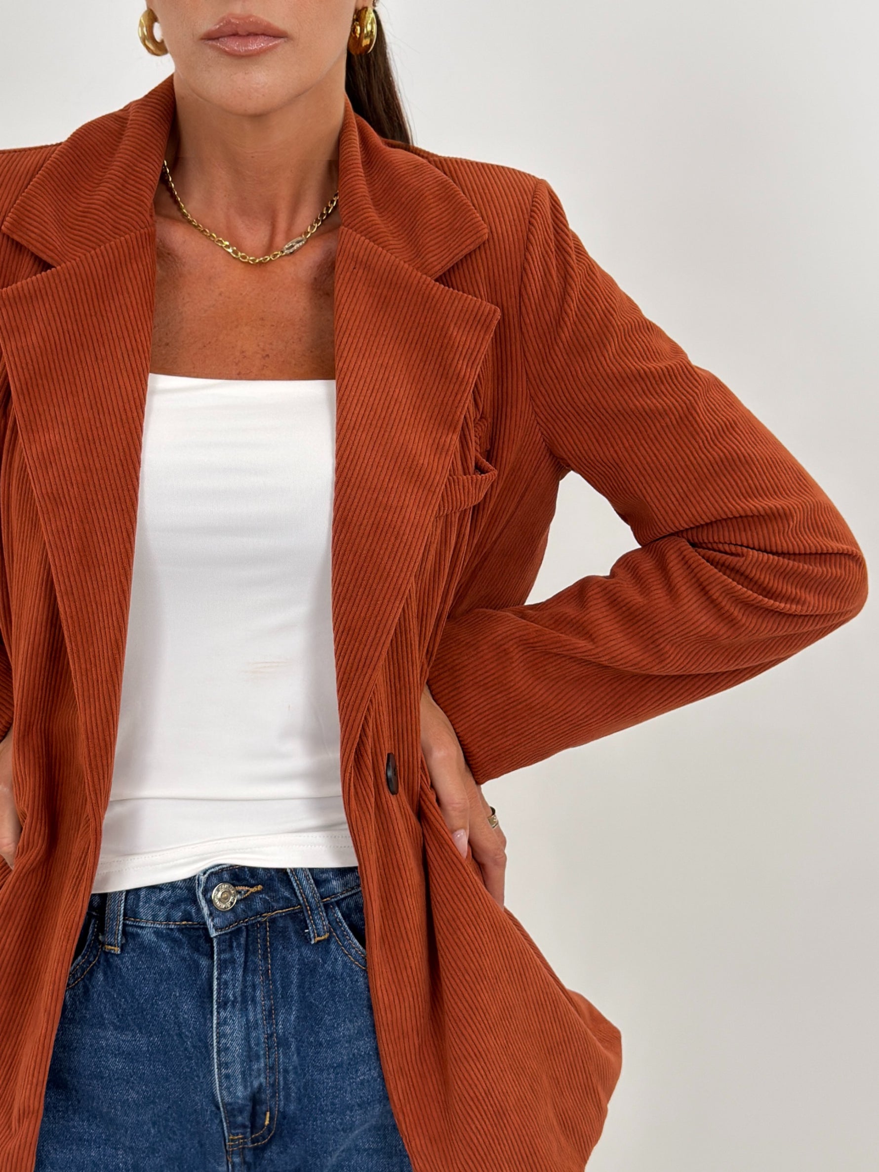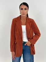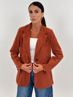 Giacca modello monopetto in effetto velluto a coste. Presenta tasche frontali con patta e tasca sul petto. Manica lunga con spallina imbottita. Chiusura con bottone.