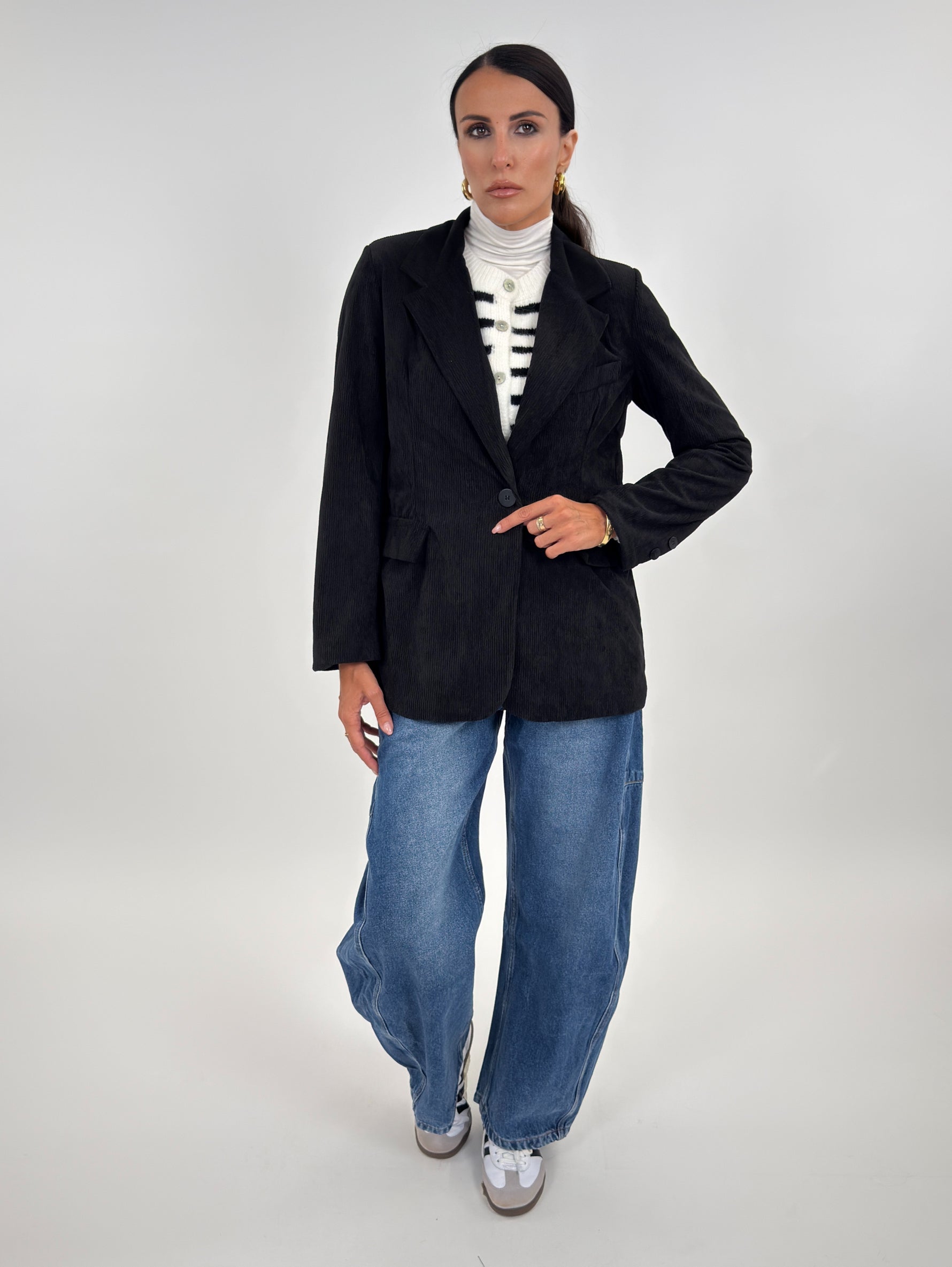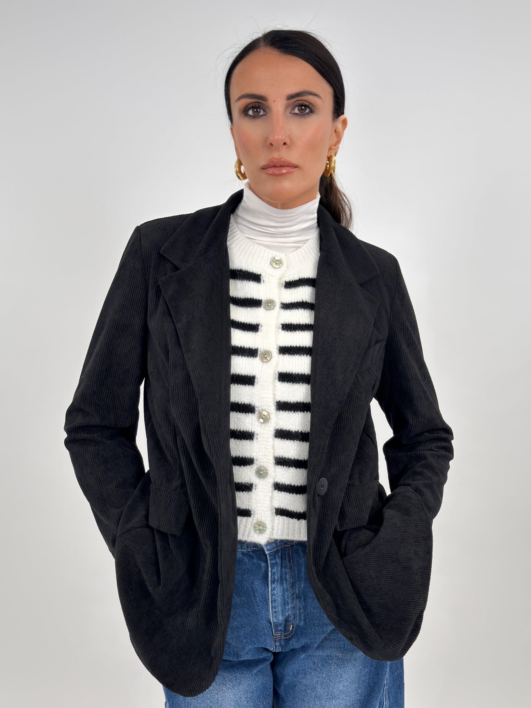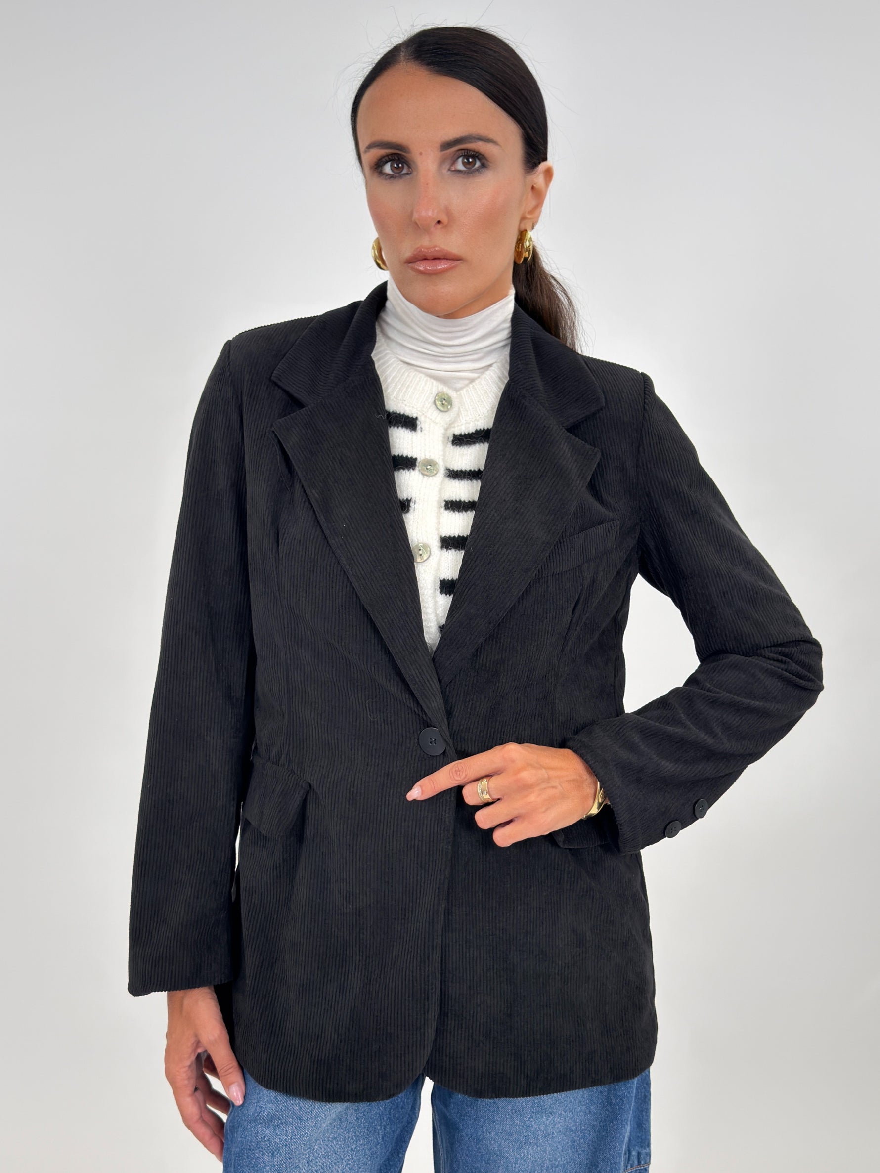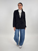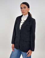 Giacca modello monopetto in effetto velluto a coste. Presenta tasche frontali con patta e tasca sul petto. Manica lunga con spallina imbottita. Chiusura con bottone.