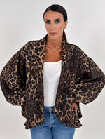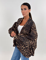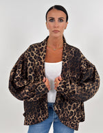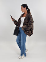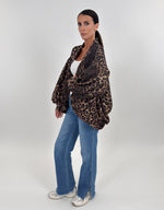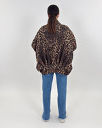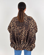 Giubbotto foderato modello a uovo con collo a scialle nella stampa animalier. Tasche laterali e maniche lunghe ampie con polsino finale.