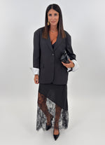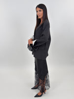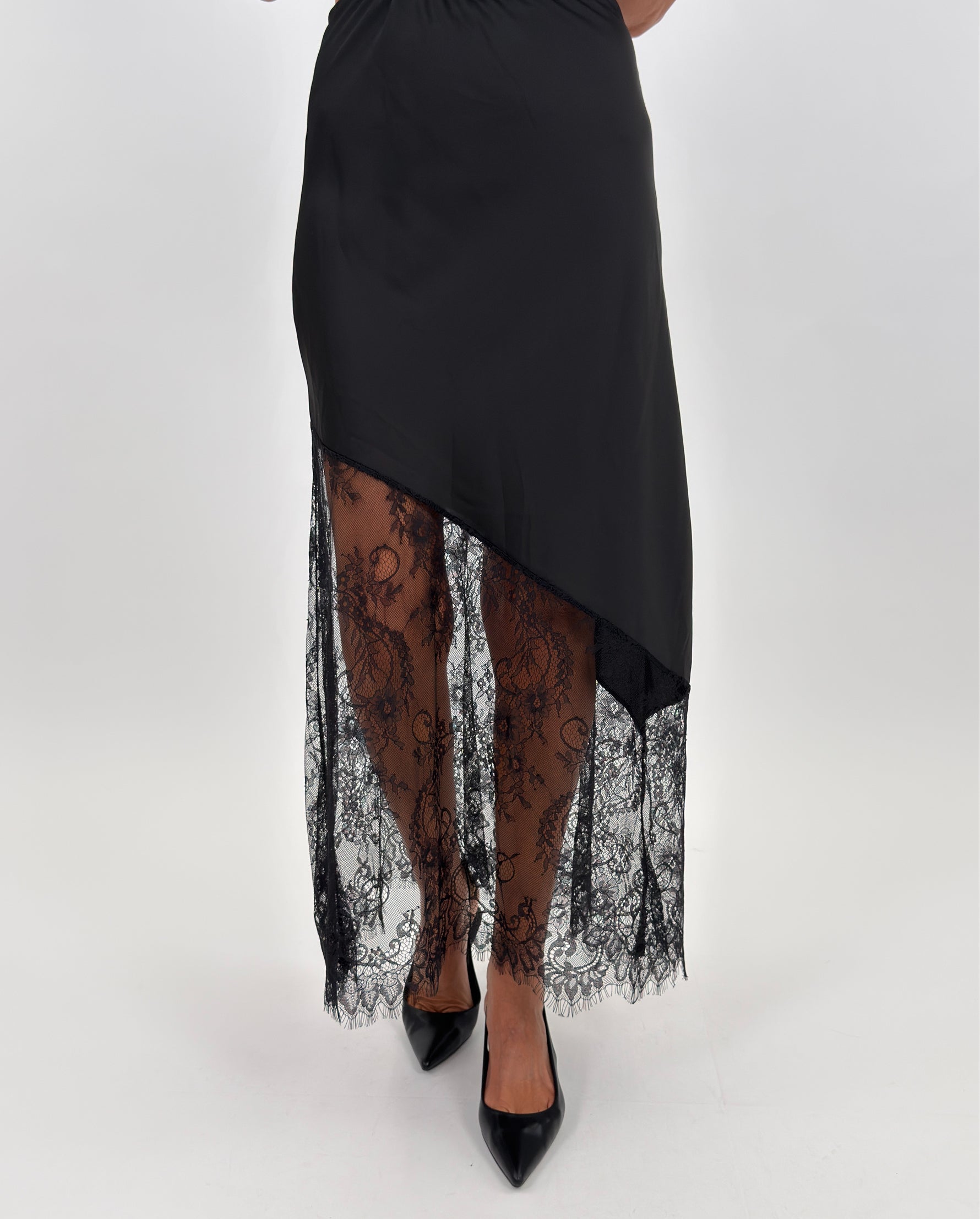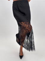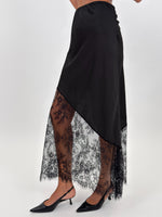 Gonna modello lungo in satin con parte basse realizzata in pizzo trasparente con motivo floreale. Elasticizzata in vita.