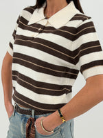 Maglia modello polo a mezza manica con colletto e bottoncini sul davanti. Motivo a righe orizzontali a contrasto di colore.