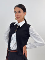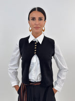 Maglia/gilet con bottoncini frontali nel colore dorato e apertura sul davanti, integrata alla camicia a contrasto di colore a manica lunga e chiusura con bottoncini frontali.