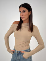 Maglia modello lungo, con scollo asimmetrico e manica lunga con foro per pollice, in lycra.