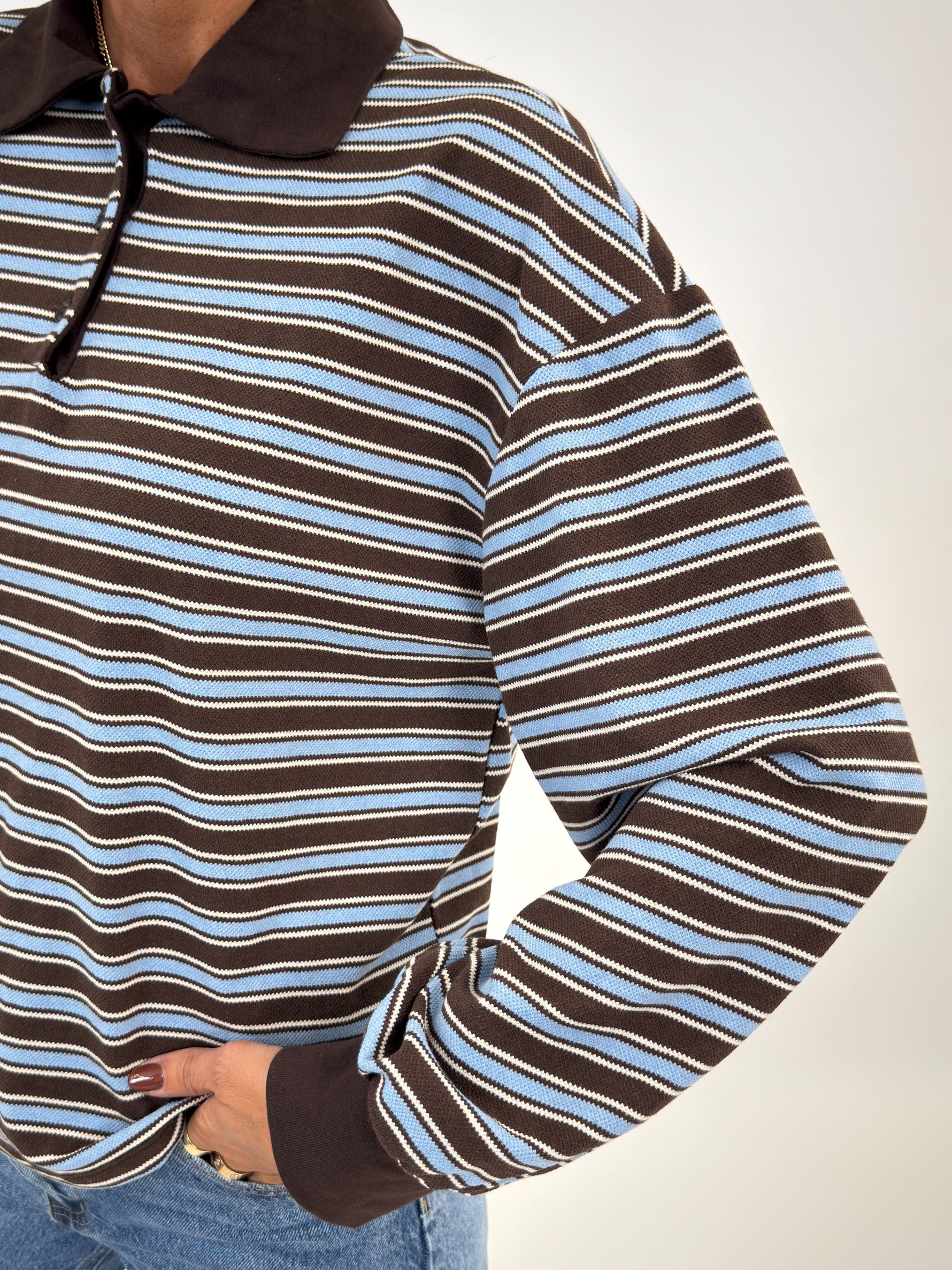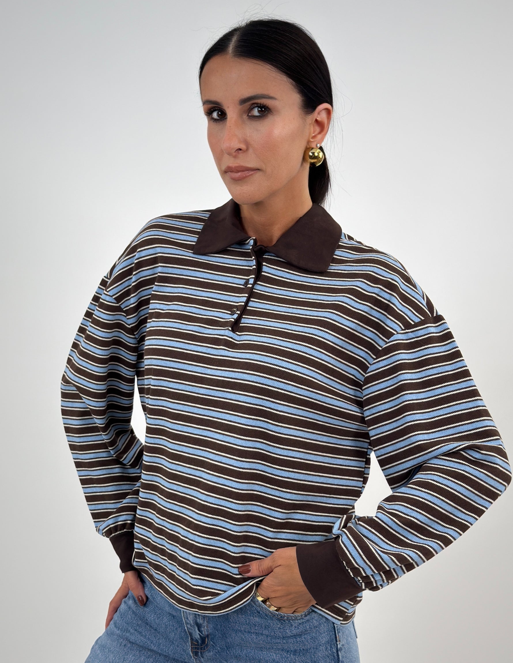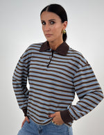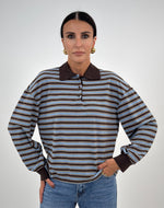 Maglia modello polo con colletto e bottoncini frontali nella trama a righe. Maniche lunghe con polsino finale a contrasto.