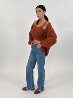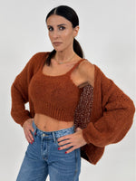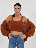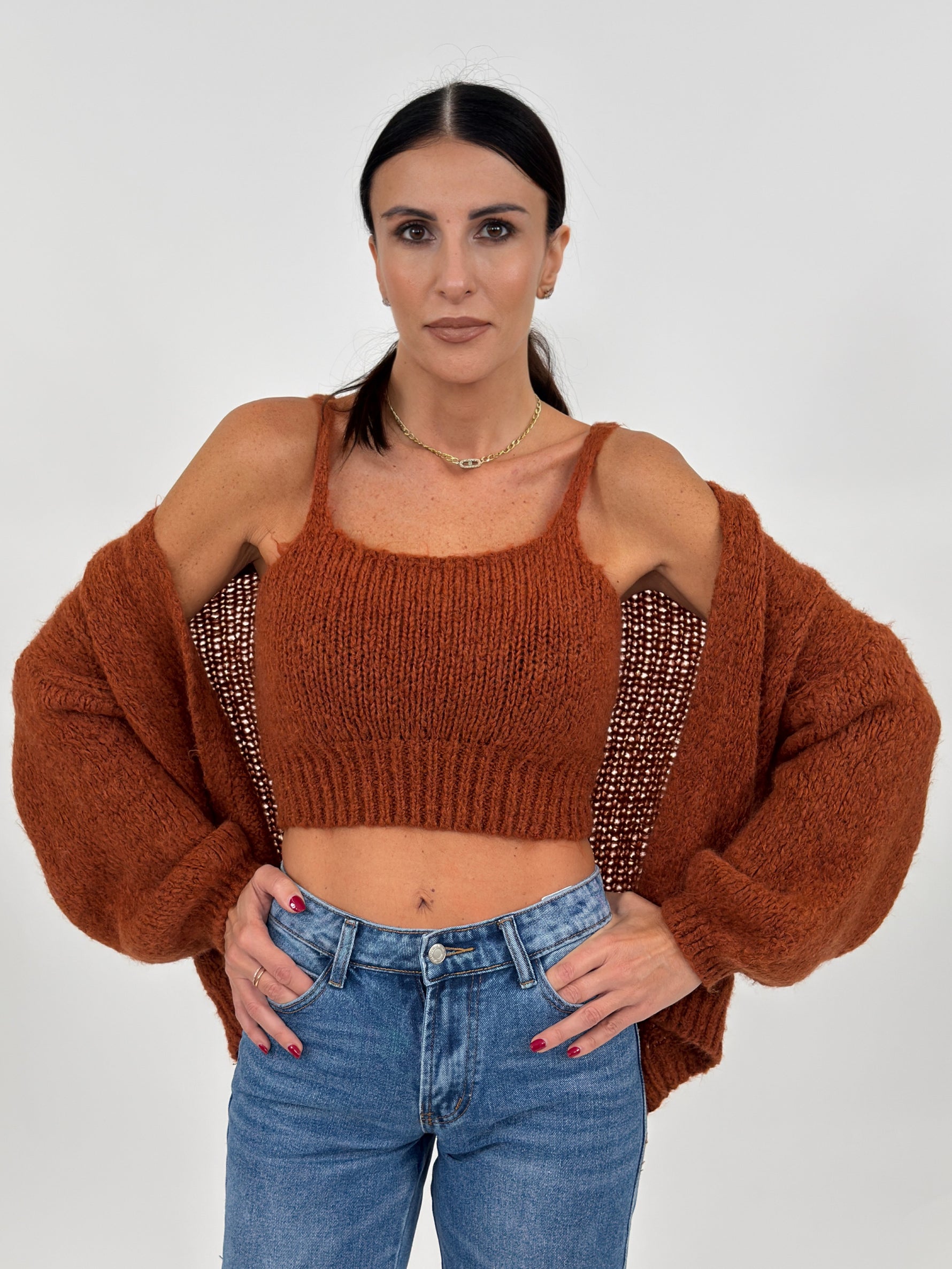 Maglia modello twinset, composto da cardigan modello sciallato, maniche lunghe con polsino finale. Top modello crop giromanica con bretelle sottili.
