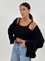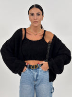 Maglia modello twinset, composto da cardigan modello sciallato, maniche lunghe con polsino finale. Top modello crop giromanica con bretelle sottili.