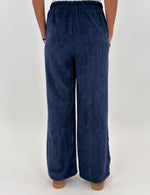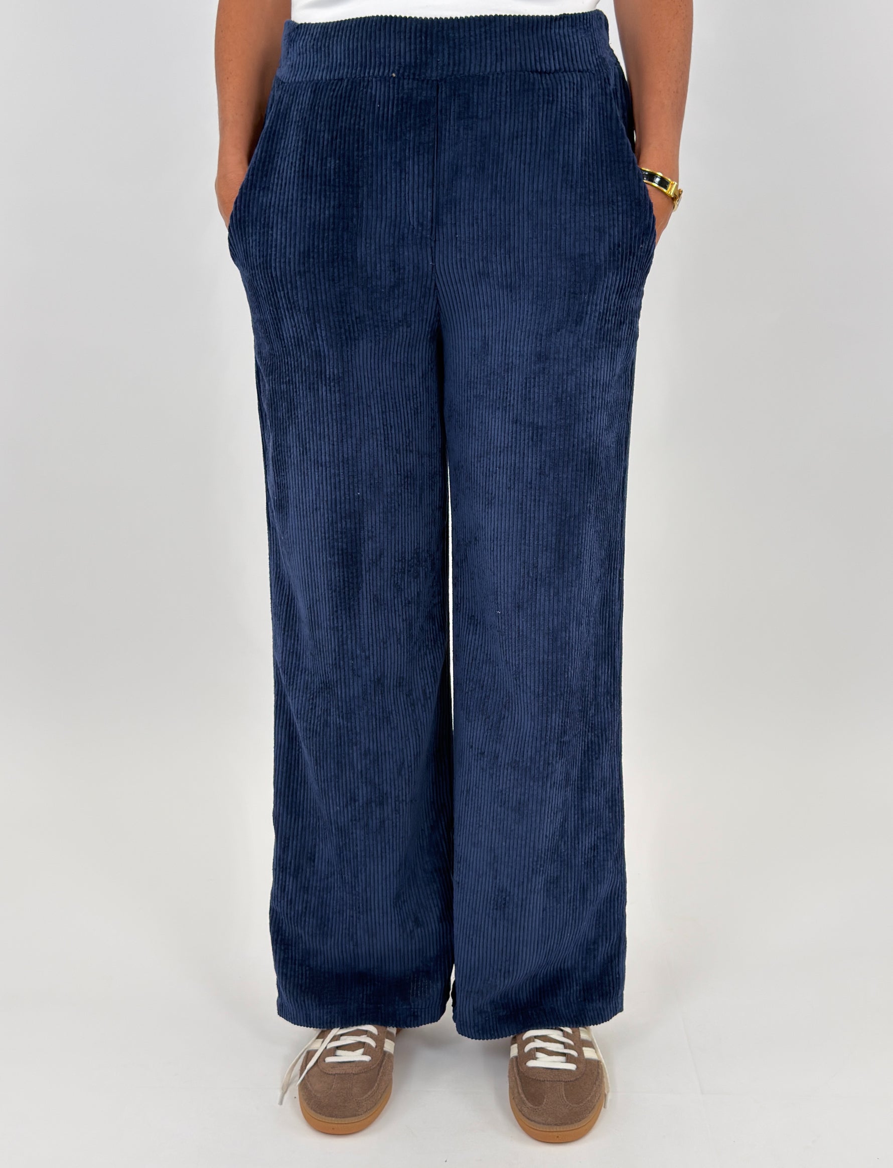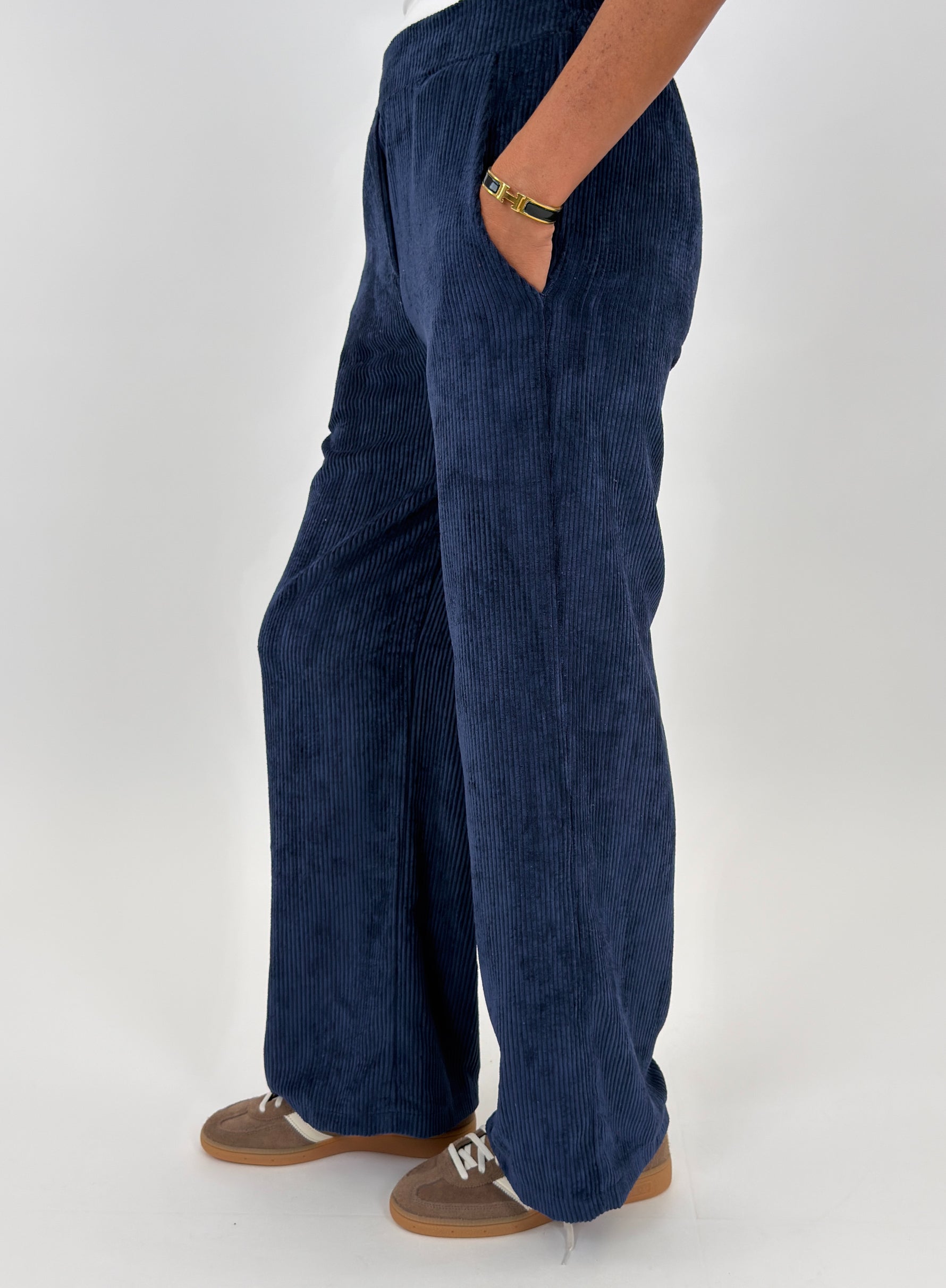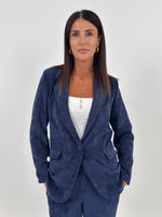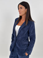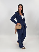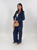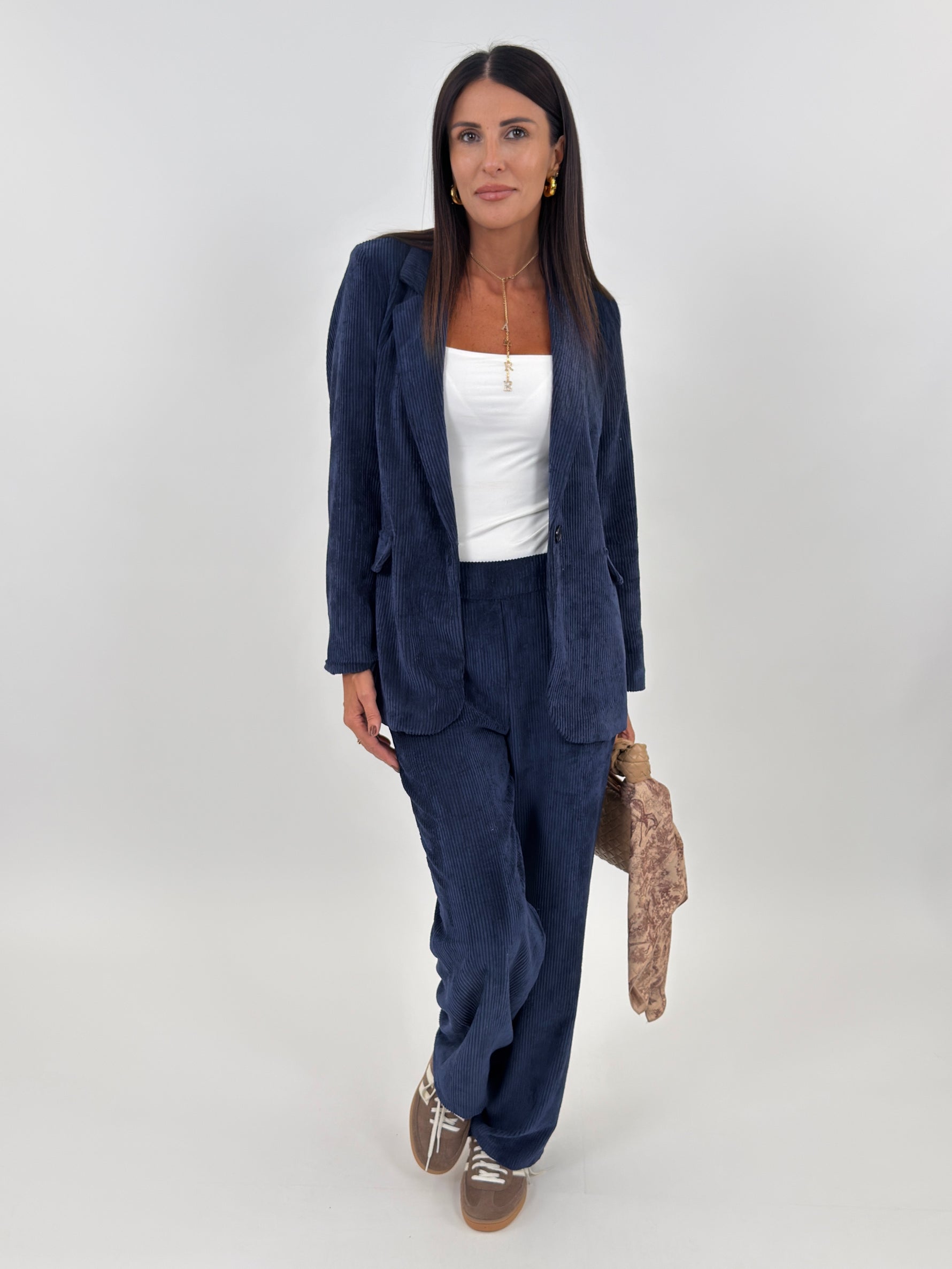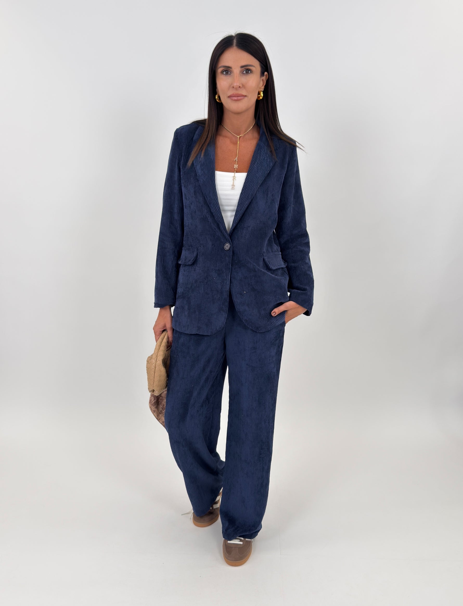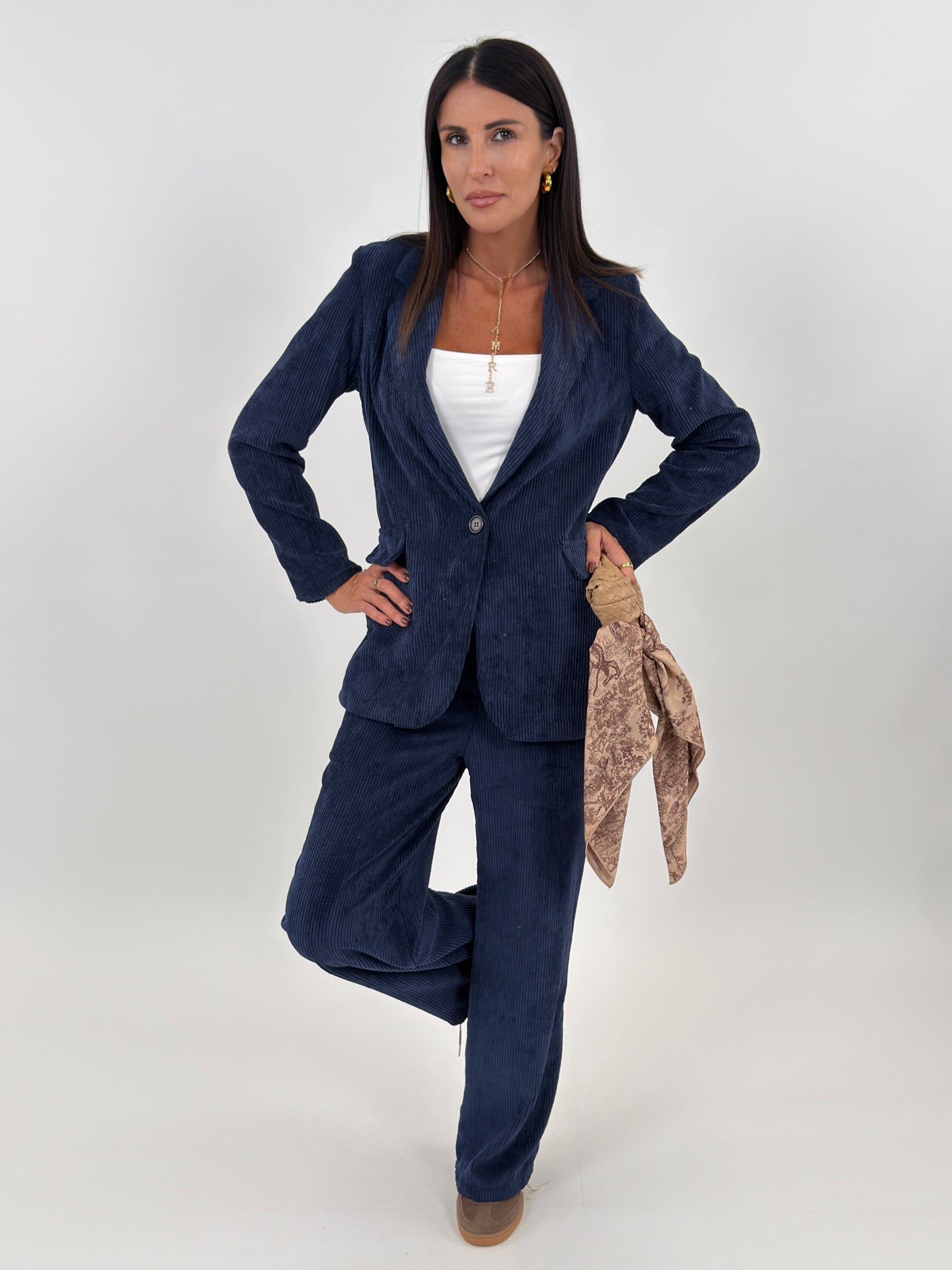 Tailleur in effetto velluto a coste, composto da giacca modello monopetto, tasche frontali con patta e maniche lunghe con spalline imbottite. Pantalone a gamba larga con tasche laterali. Bustino con elastico sul retro.