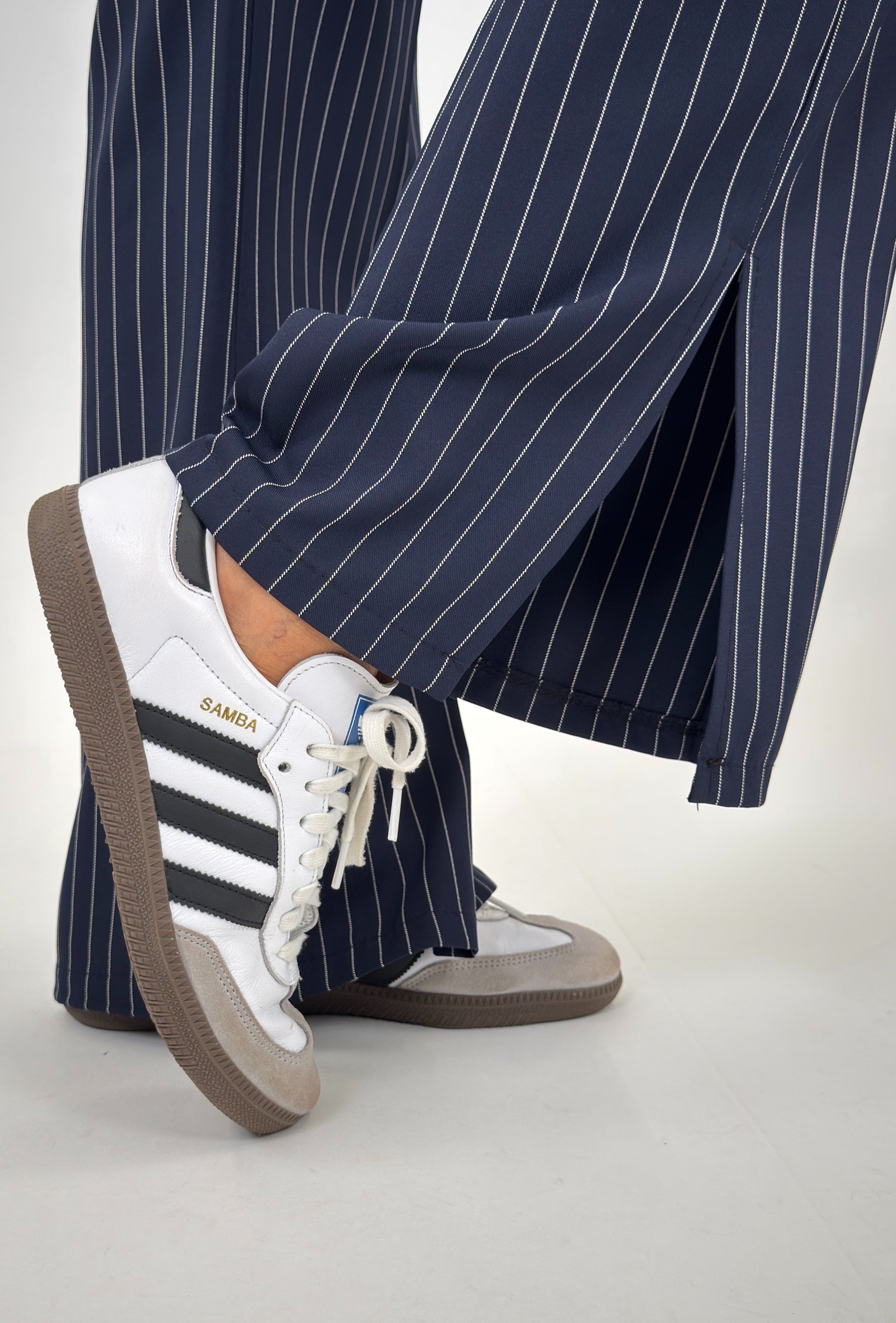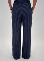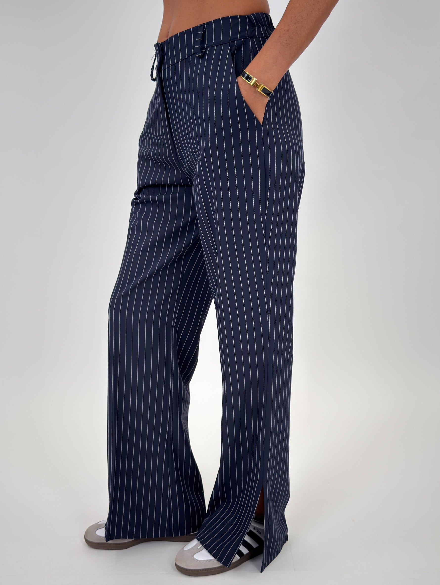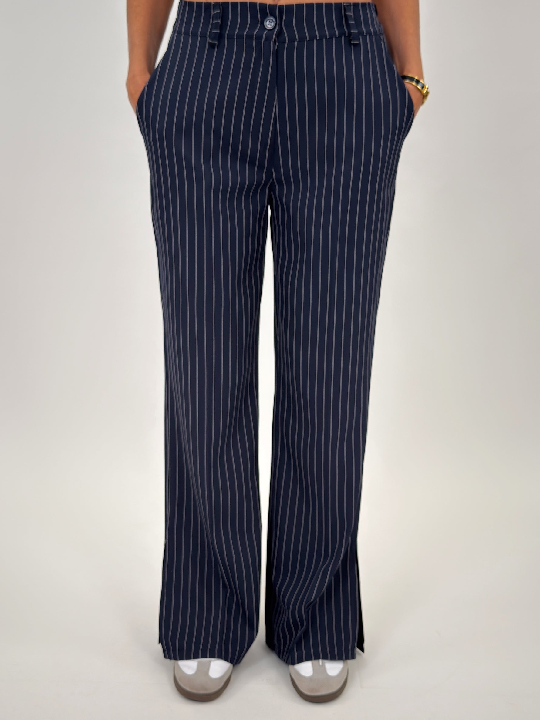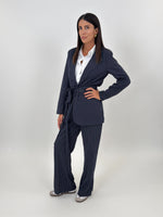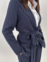Tailleur nella trama gessata composto da giacca modello monopetto, tasche frontali con patta e maniche lunghe con spalline imbottite. Cintura da annodare in vita. Pantalone con fondo a zampa con spacchetti laterali. Bustino con elastico sul retro e chiusura con zip e bottone.