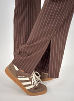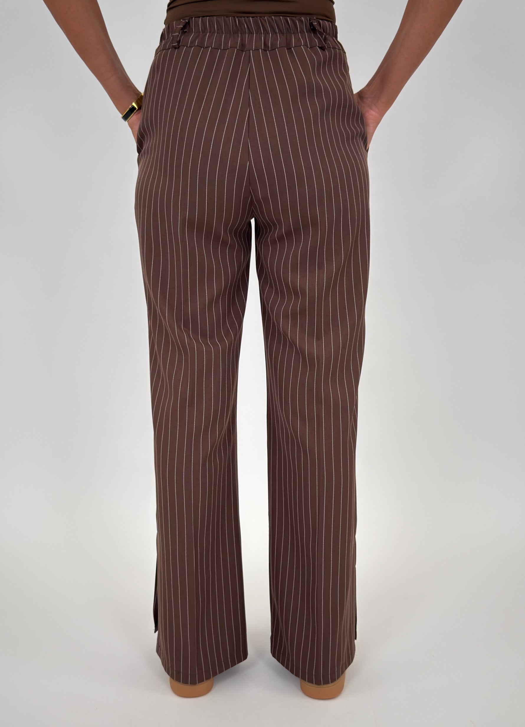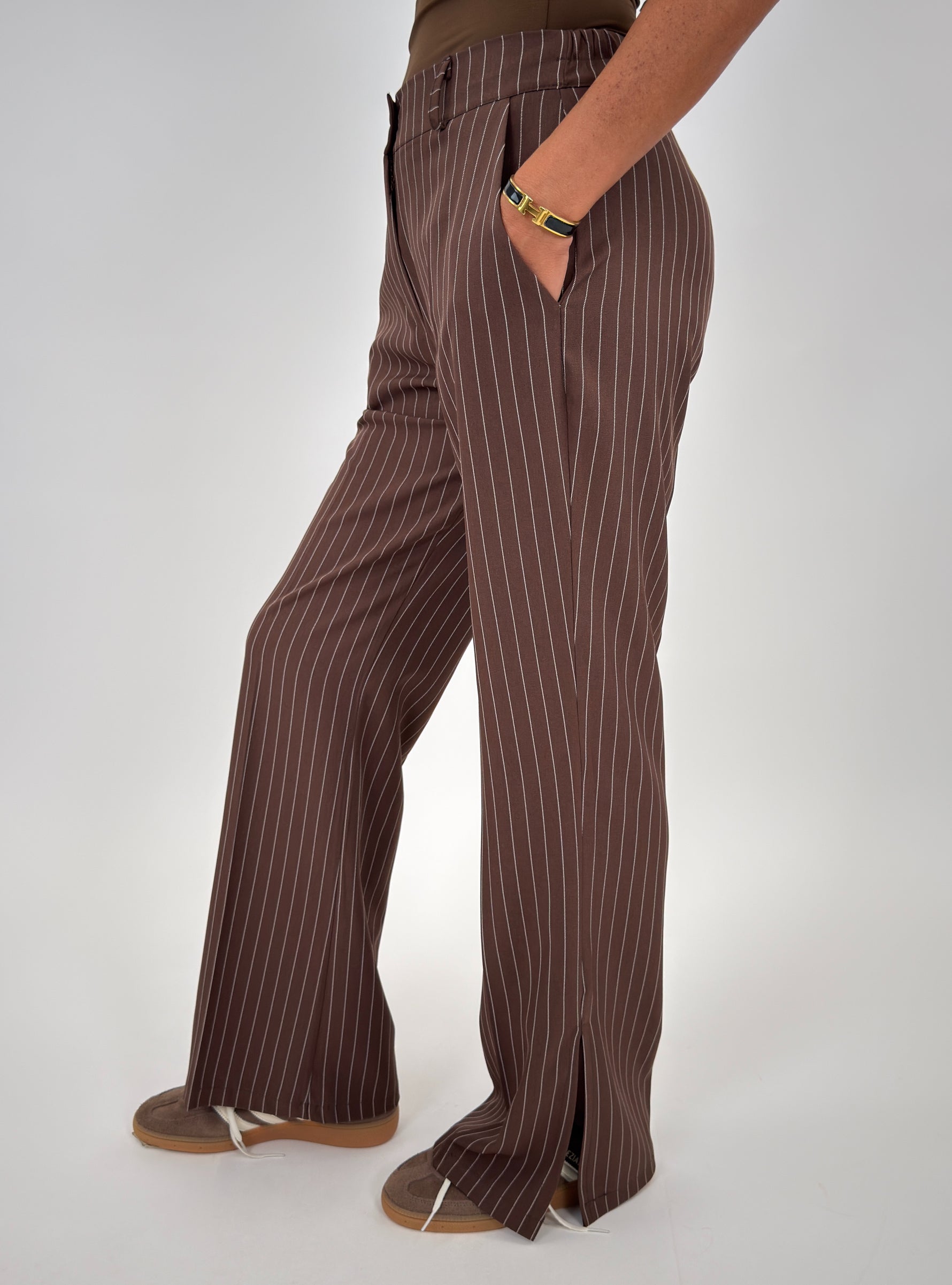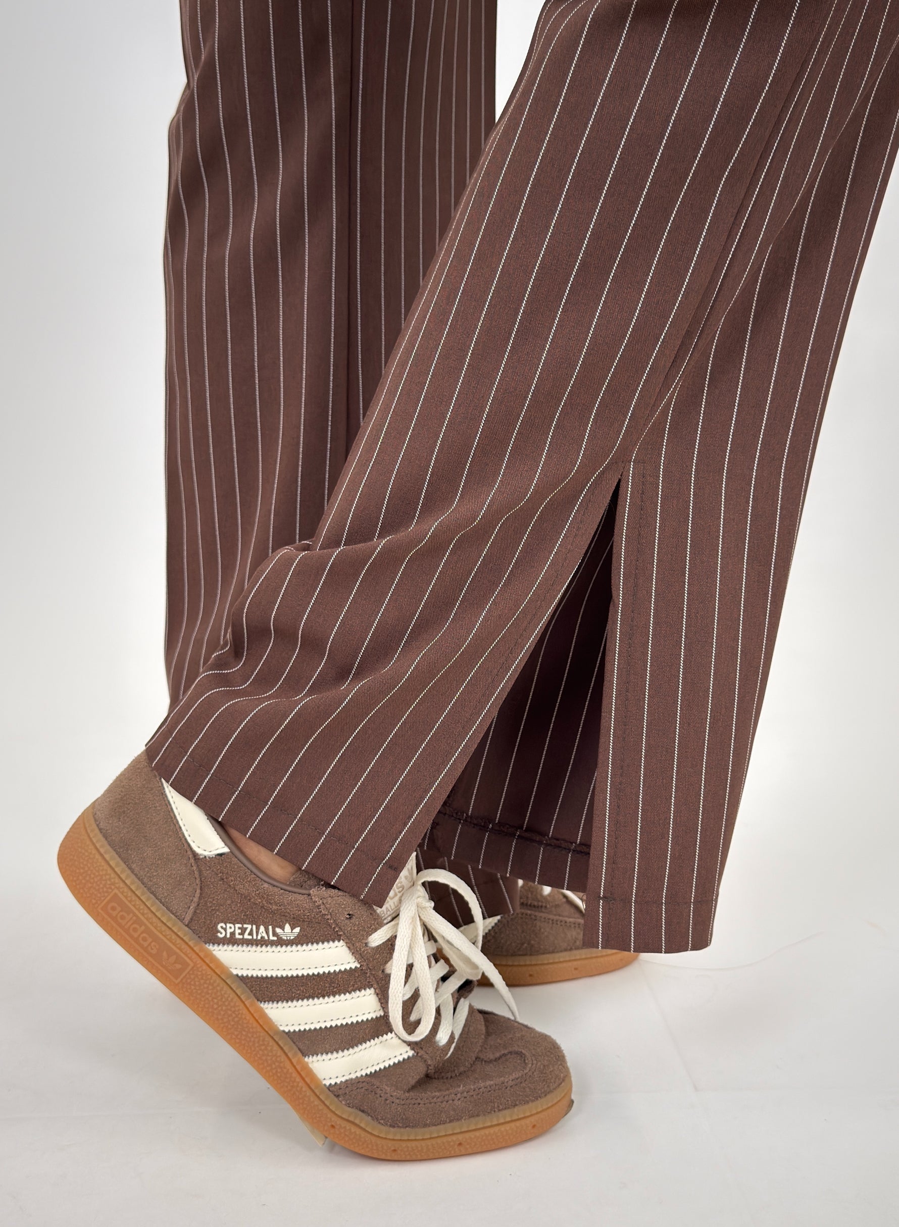 Tailleur nella trama gessata composto da giacca modello monopetto, tasche frontali con patta e maniche lunghe con spalline imbottite. Cintura da annodare in vita. Pantalone con fondo a zampa con spacchetti laterali. Bustino con elastico sul retro e chiusura con zip e bottone.