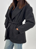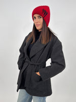 Cappotto corto con collo a scialle, maniche lunghe e tasche a toppa frontali. Chiusura con cintura da annodare in vita.