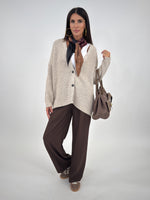 Cardigan targato LUMINA, modello lungo con scollo a V, maniche lunghe con spalle cadenti. Chiusura con bottoni frontali. Dotato di Foulard.
