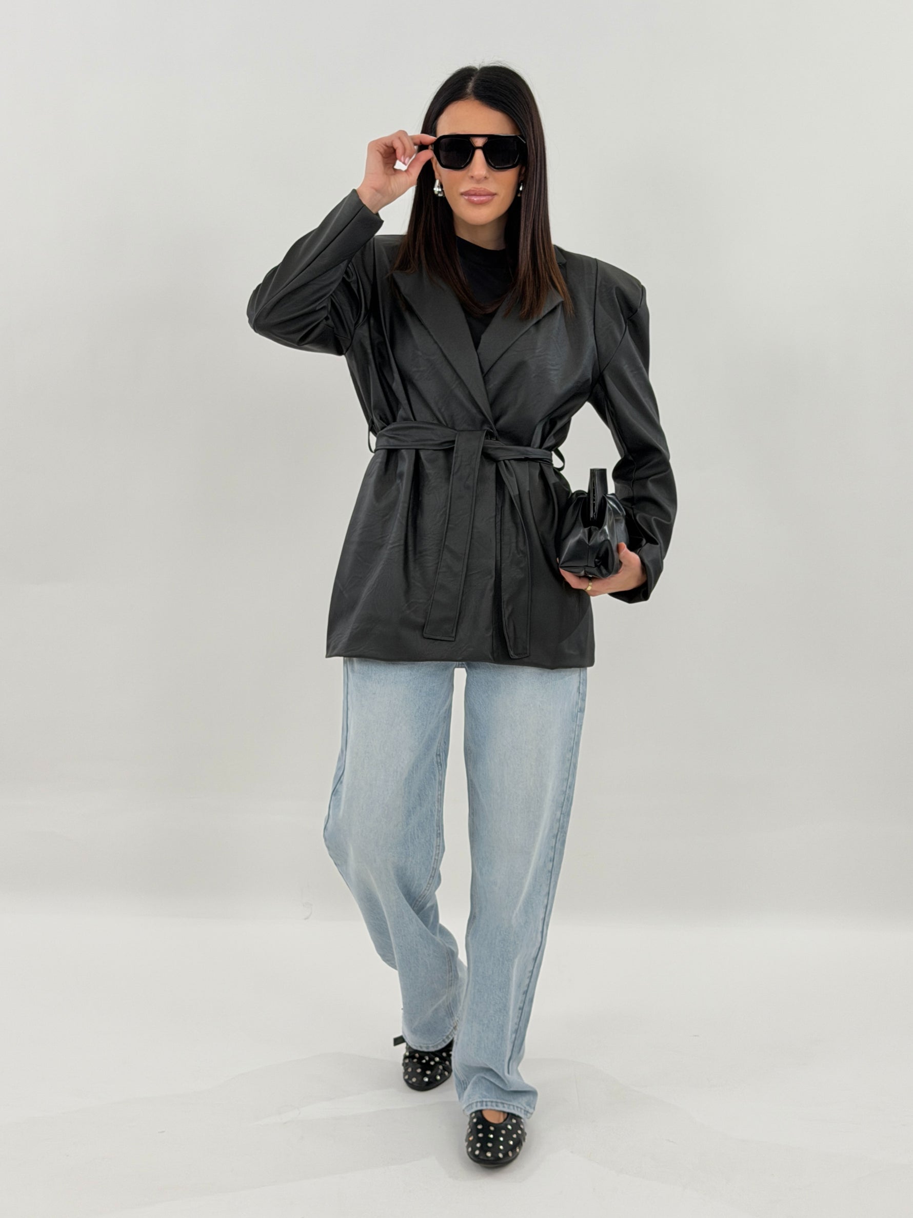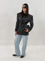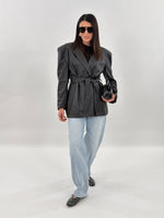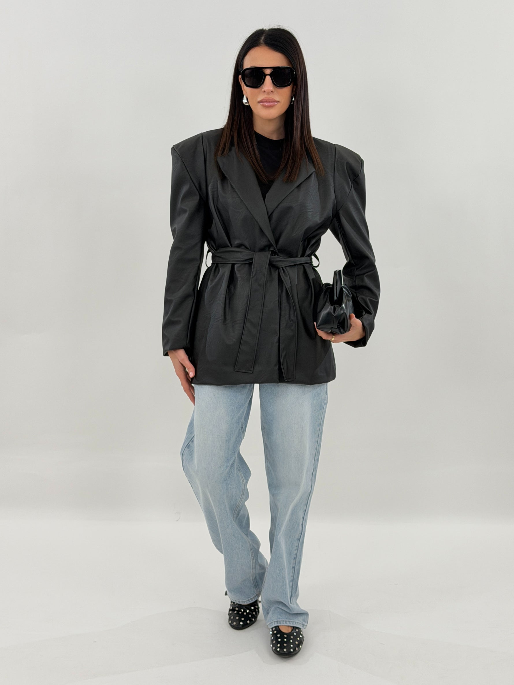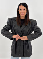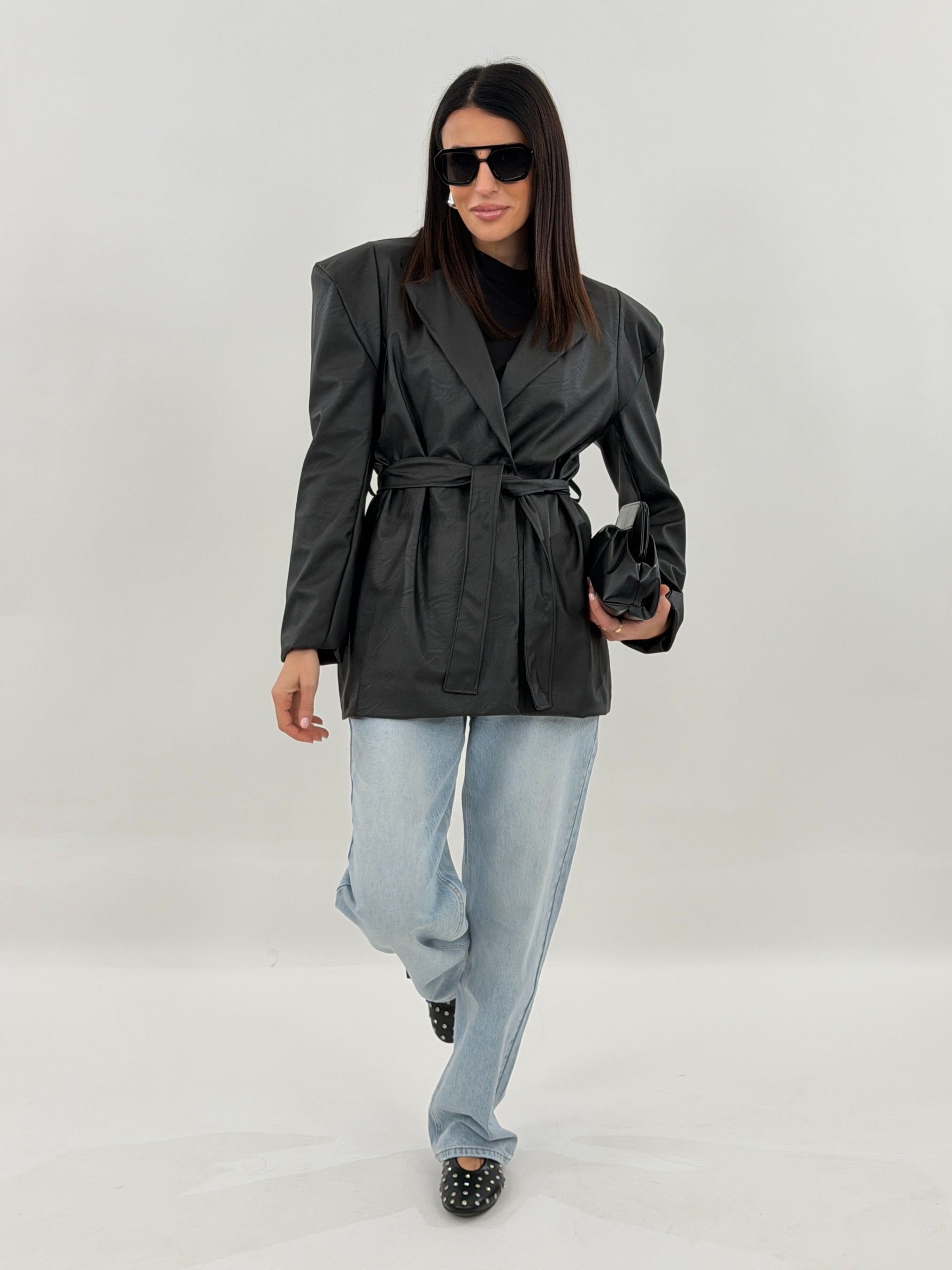 Giacca in ecopelle modello doppio petto, con tasche frontali con maniche lunghe con spallina imbottita. Chiusura con bottone frontale e cintura da annodare in vita.