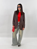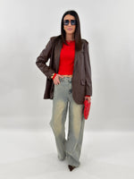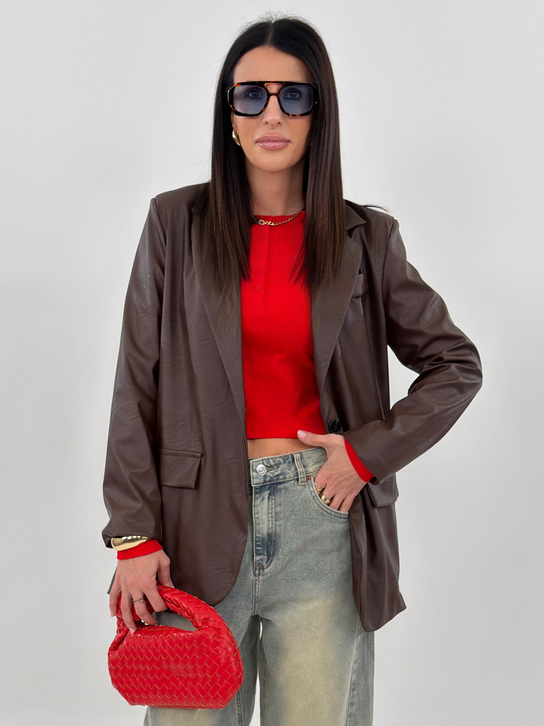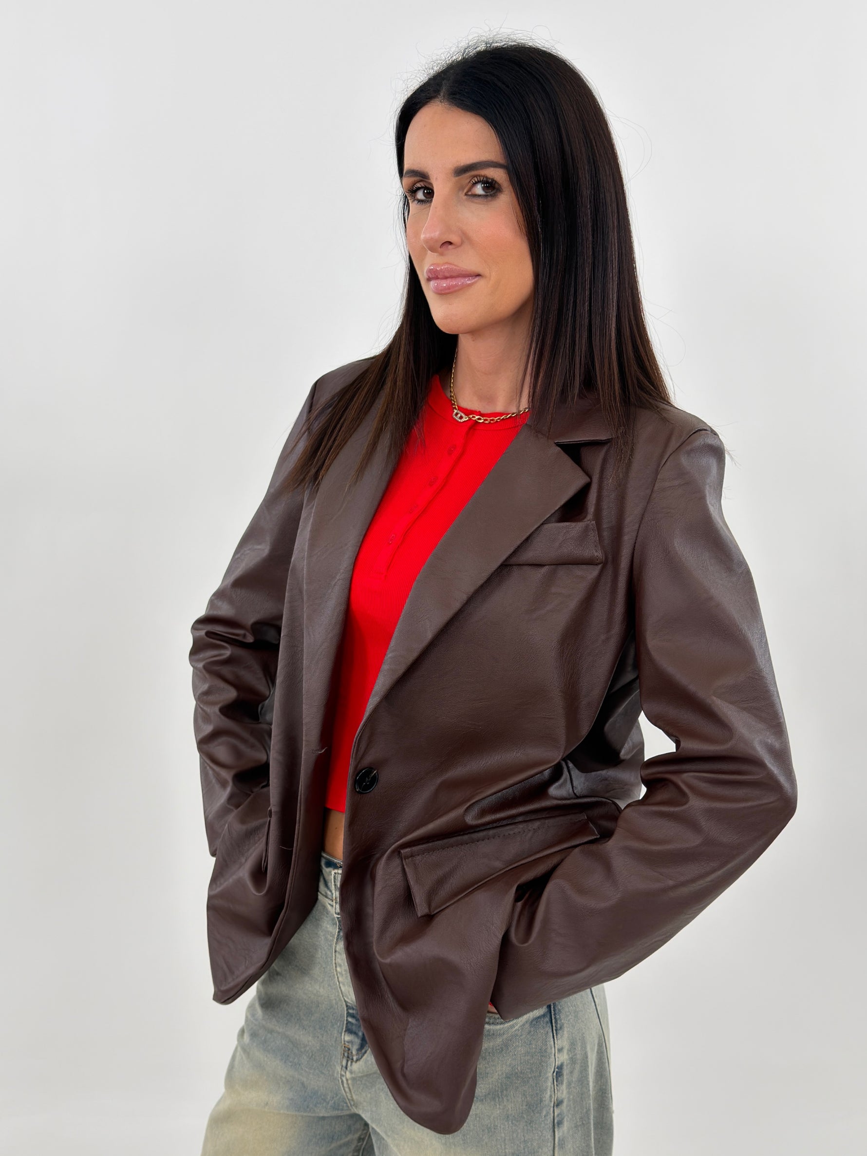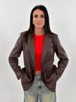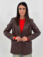 Giacca modello oversize monopetto in tessuto ecopelle. Presenta tasche frontali con patta, tasca sul petto e manica lunga con spallina imbottita. Chiusura con bottone.