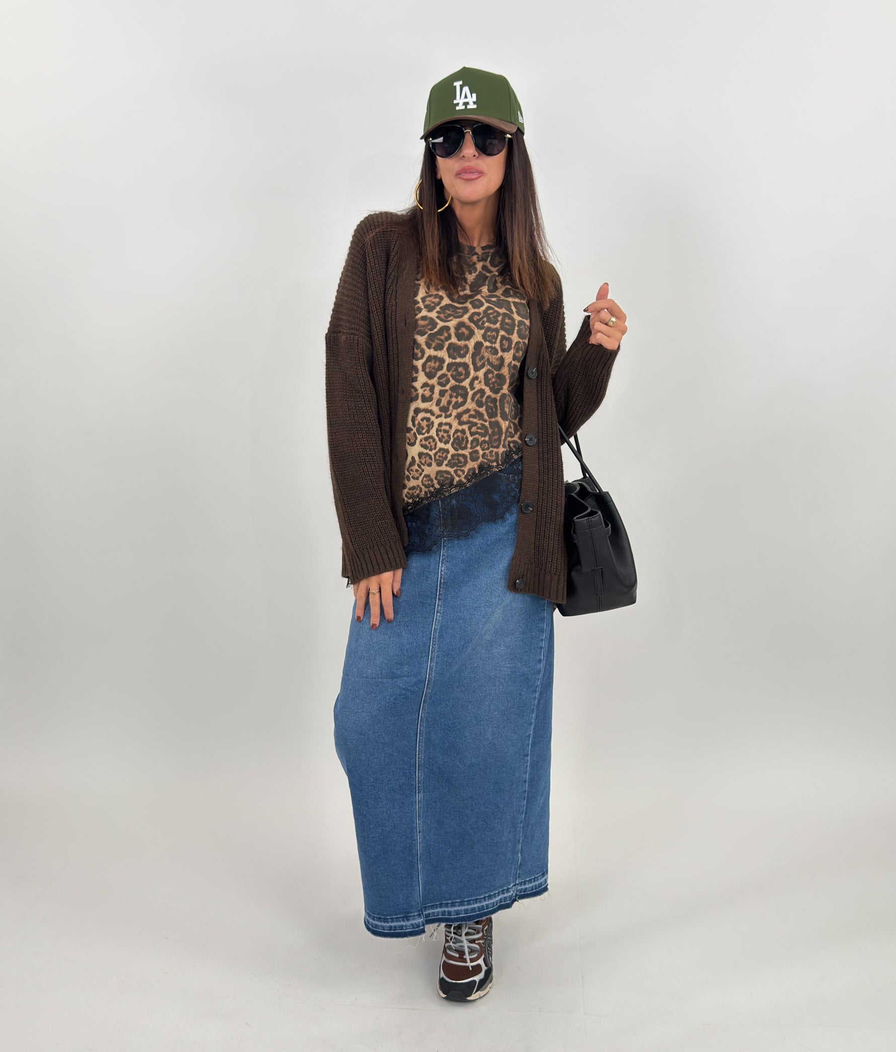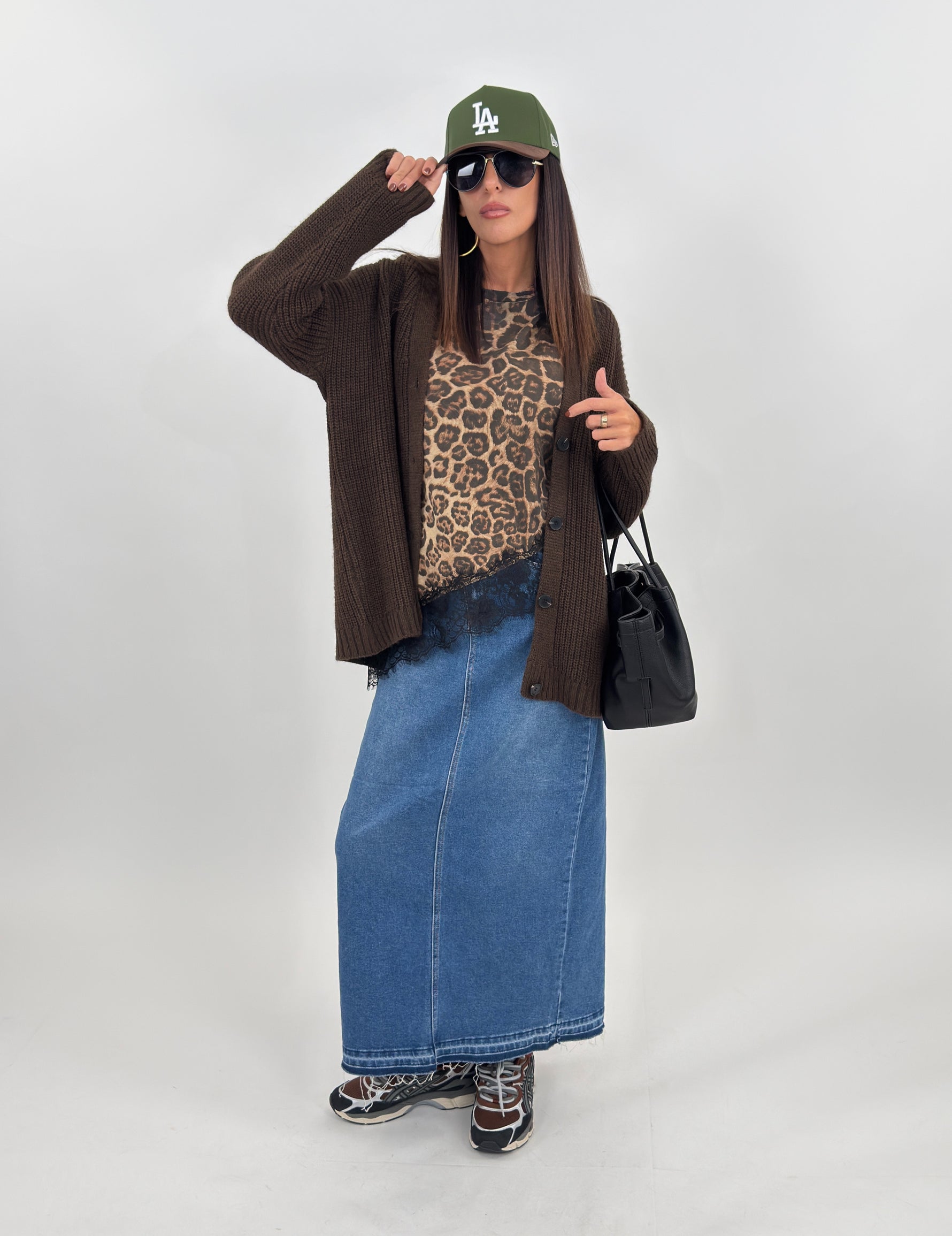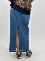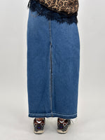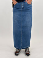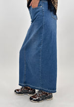 Gonna lunga in denim, modello cinque tasche con spacco sul retro. Chiusura con zip e bottone. Dettaglio orlo leggermente sfrangiato.
