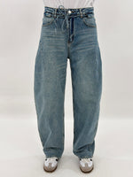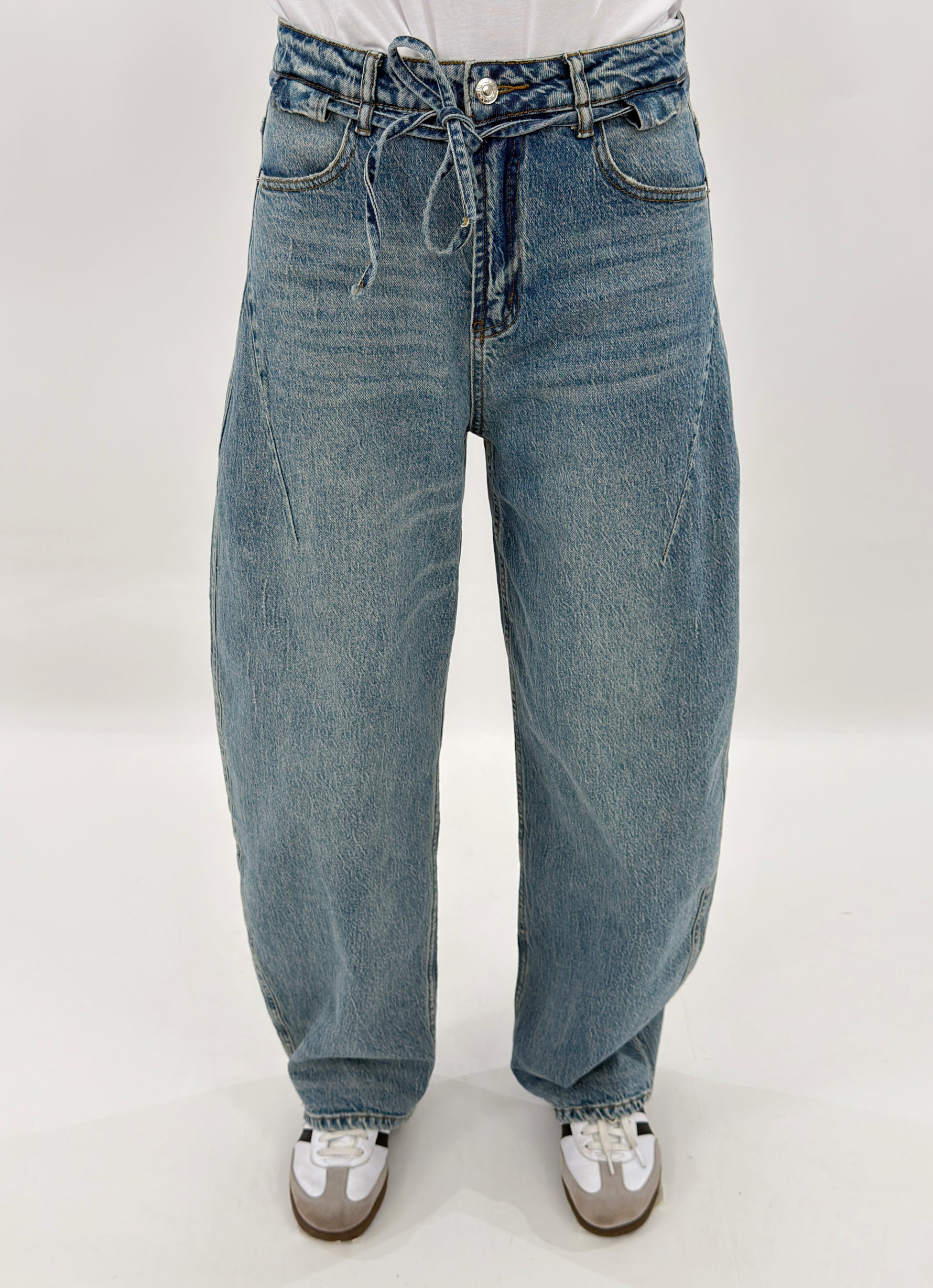 Jeans in denim sabbiato modello balloon. Chiusura con zip e bottone. Pasanti e cinturina inclusa.