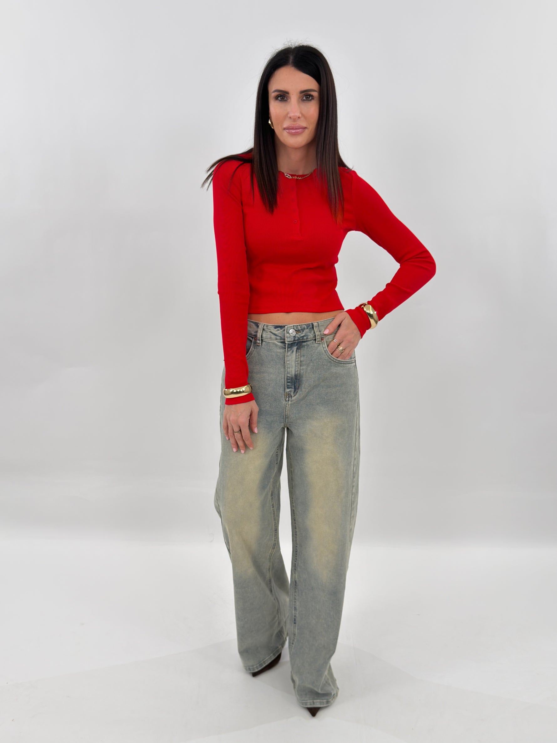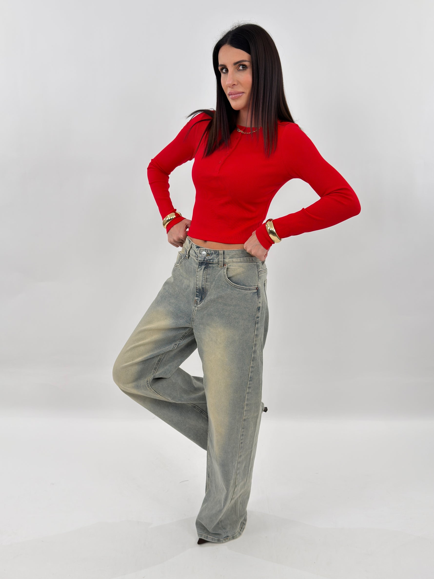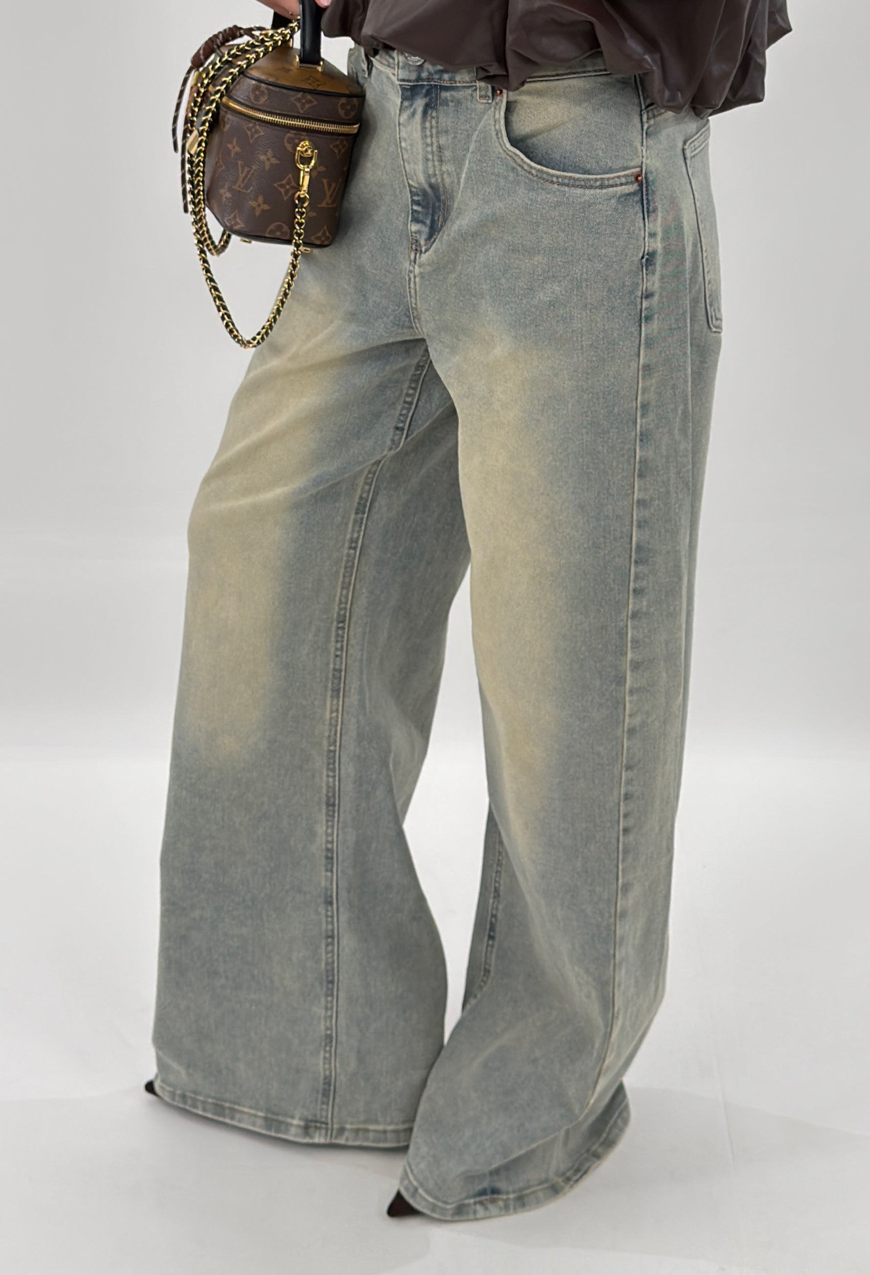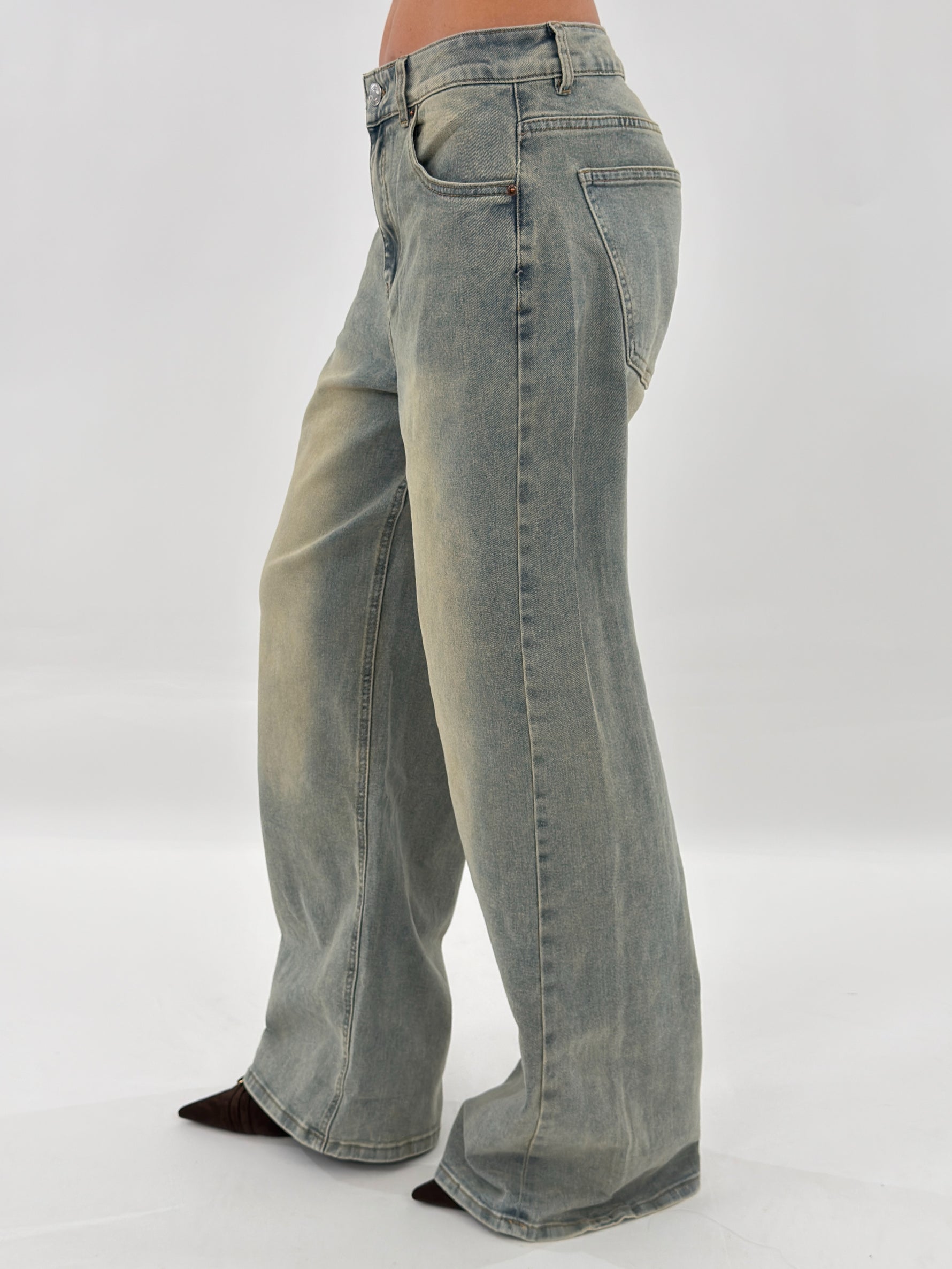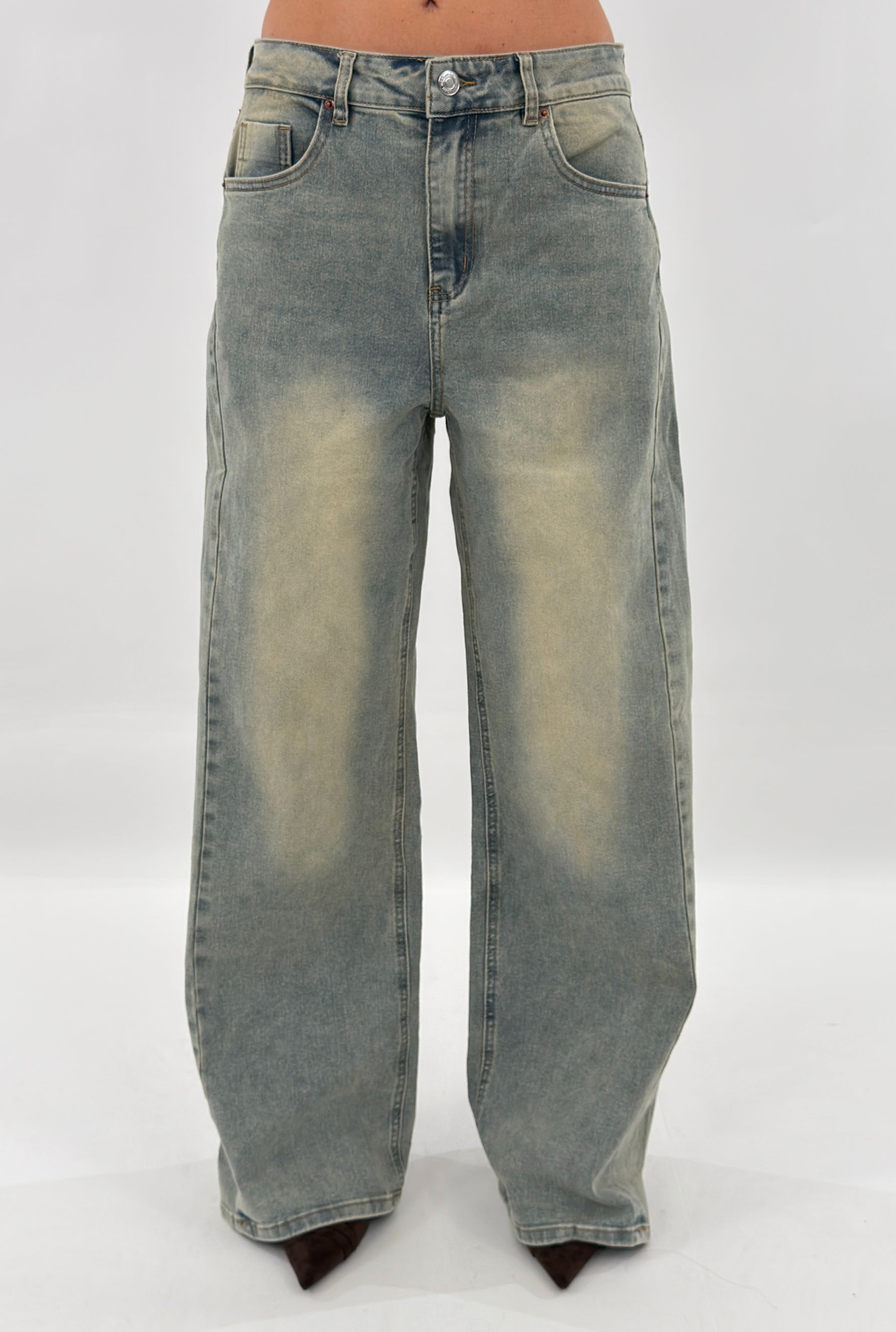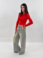 Jeans in denim sabbiato modello wide baggy, cinque tasche. Chiusura con zip e bottone.