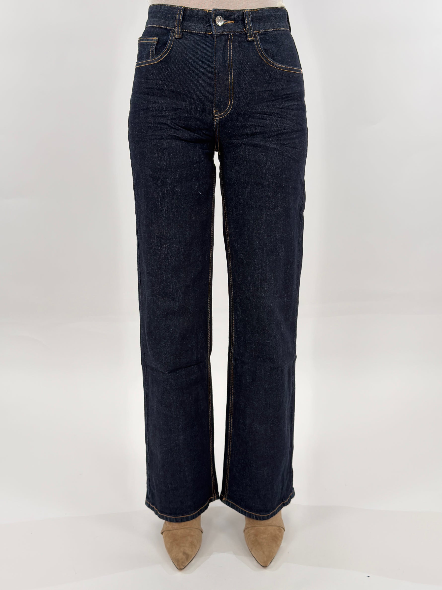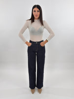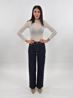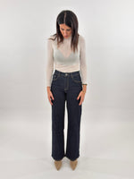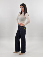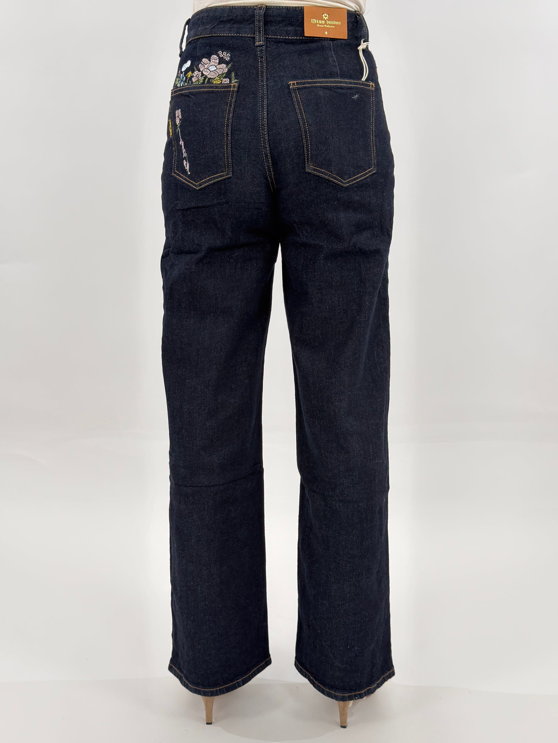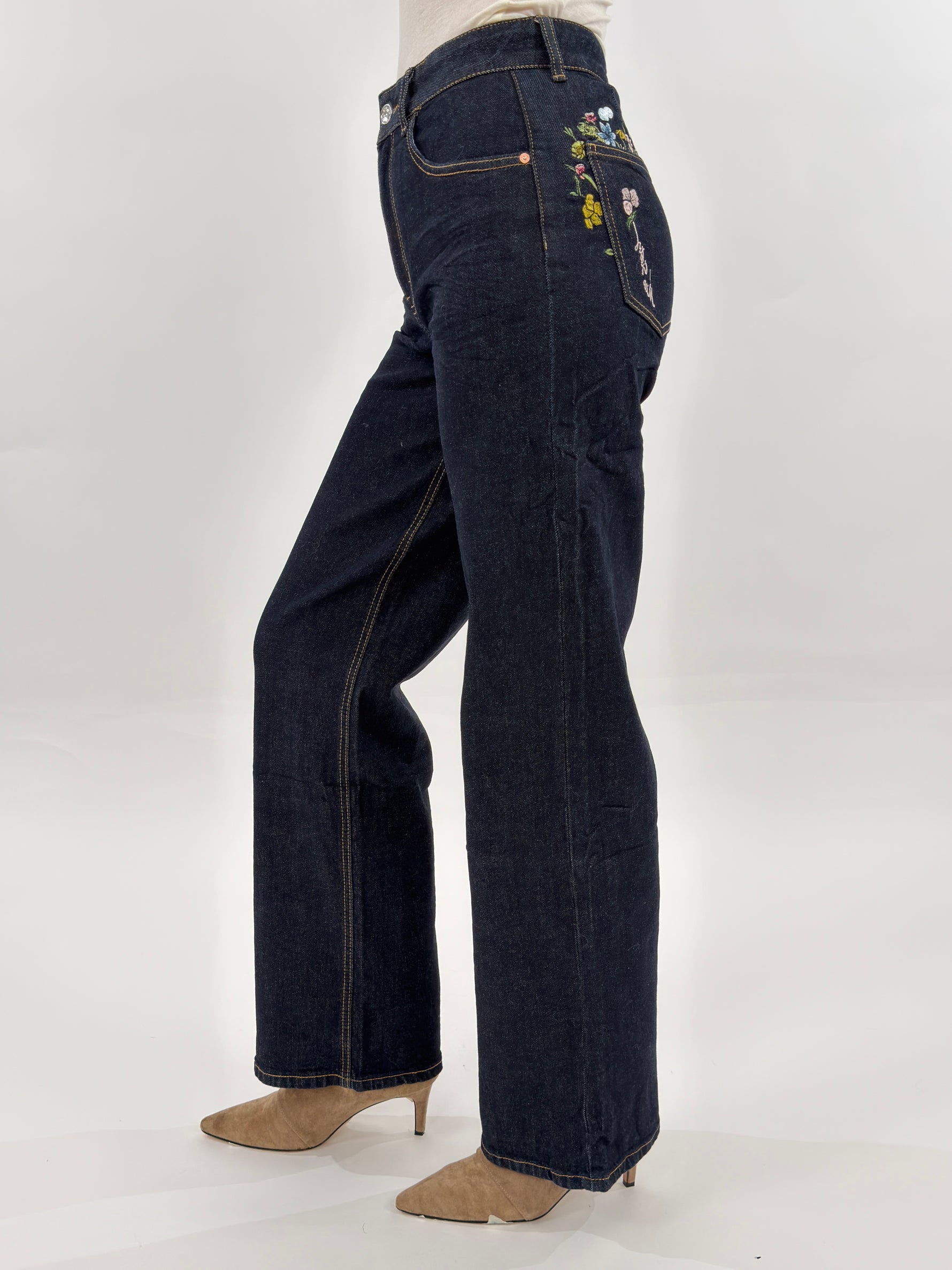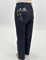 Jeans in denim blu scuro modello wide leg cinque tasche. Presenta un ricamo floreale colorato su una tasca posteriore. Chiusura con zip e bottone.