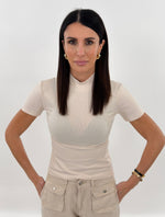 Maglia a mezzo collo e mezza manica nella trama a coste.