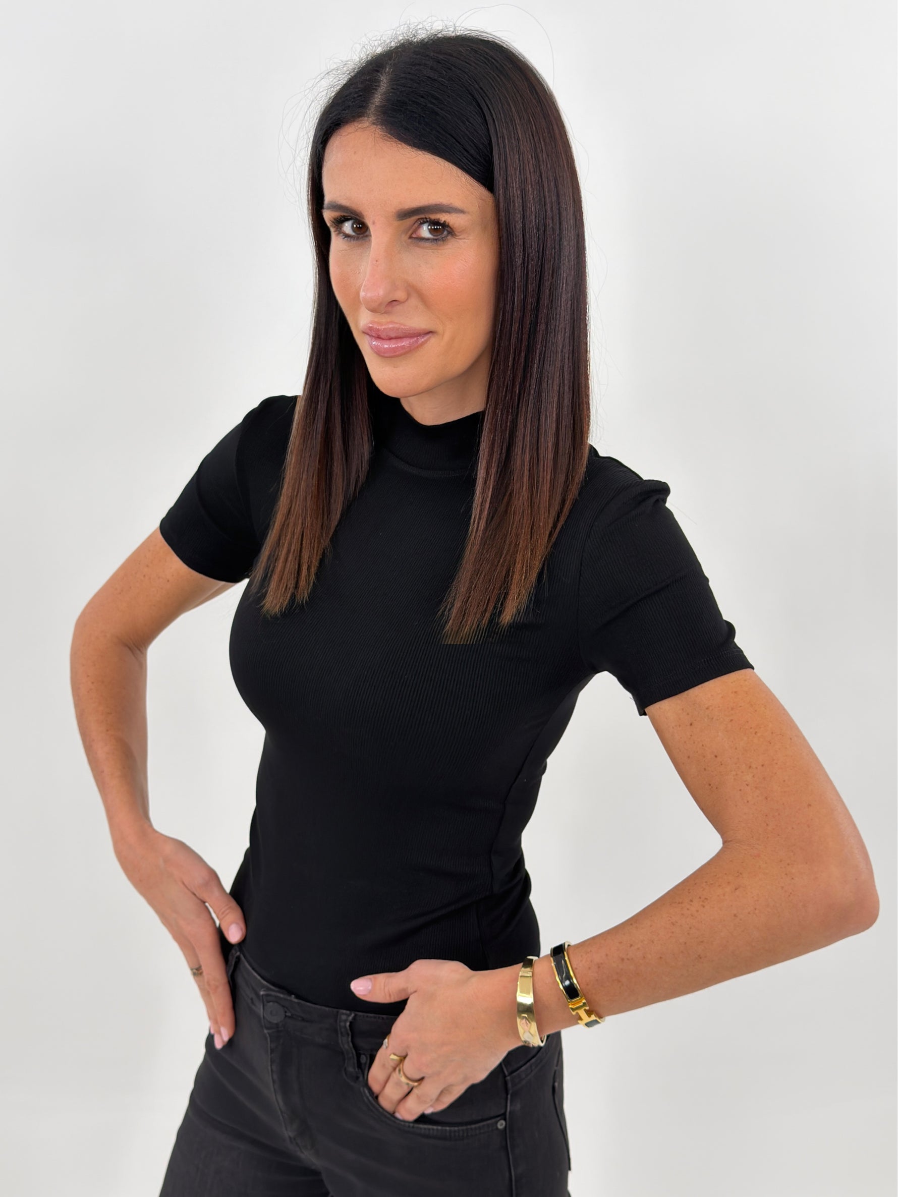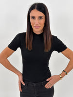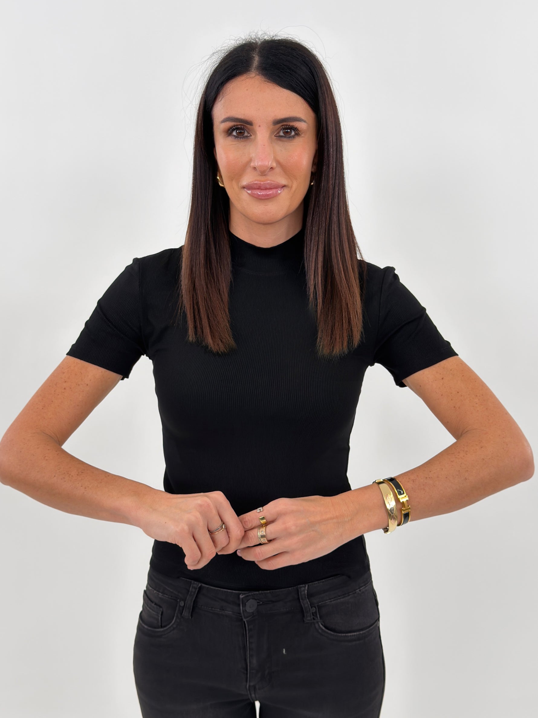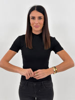 Maglia a mezzo collo e mezza manica nella trama a coste.