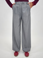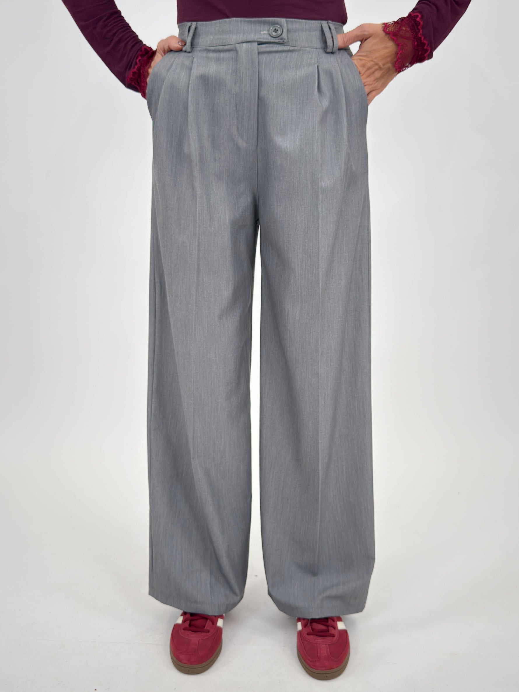 Pantalone a gamba larga con pinces sul davanti e tasche laterali. Bustino con elastico sul retro e chiusura con bottone e zip.