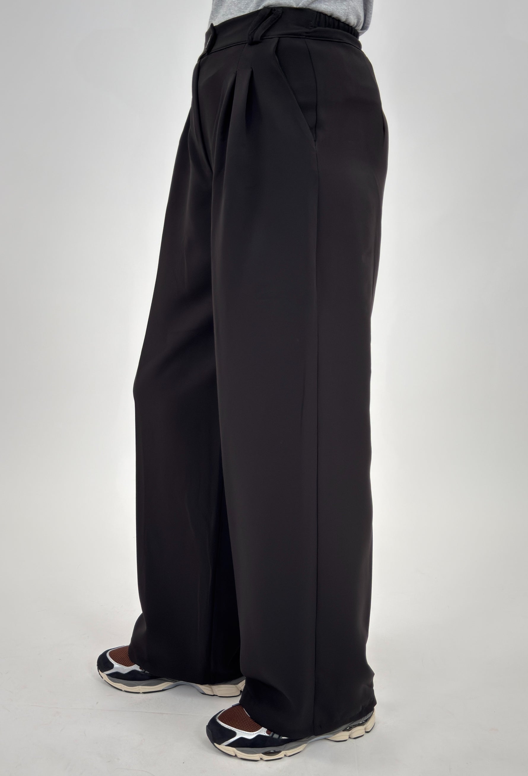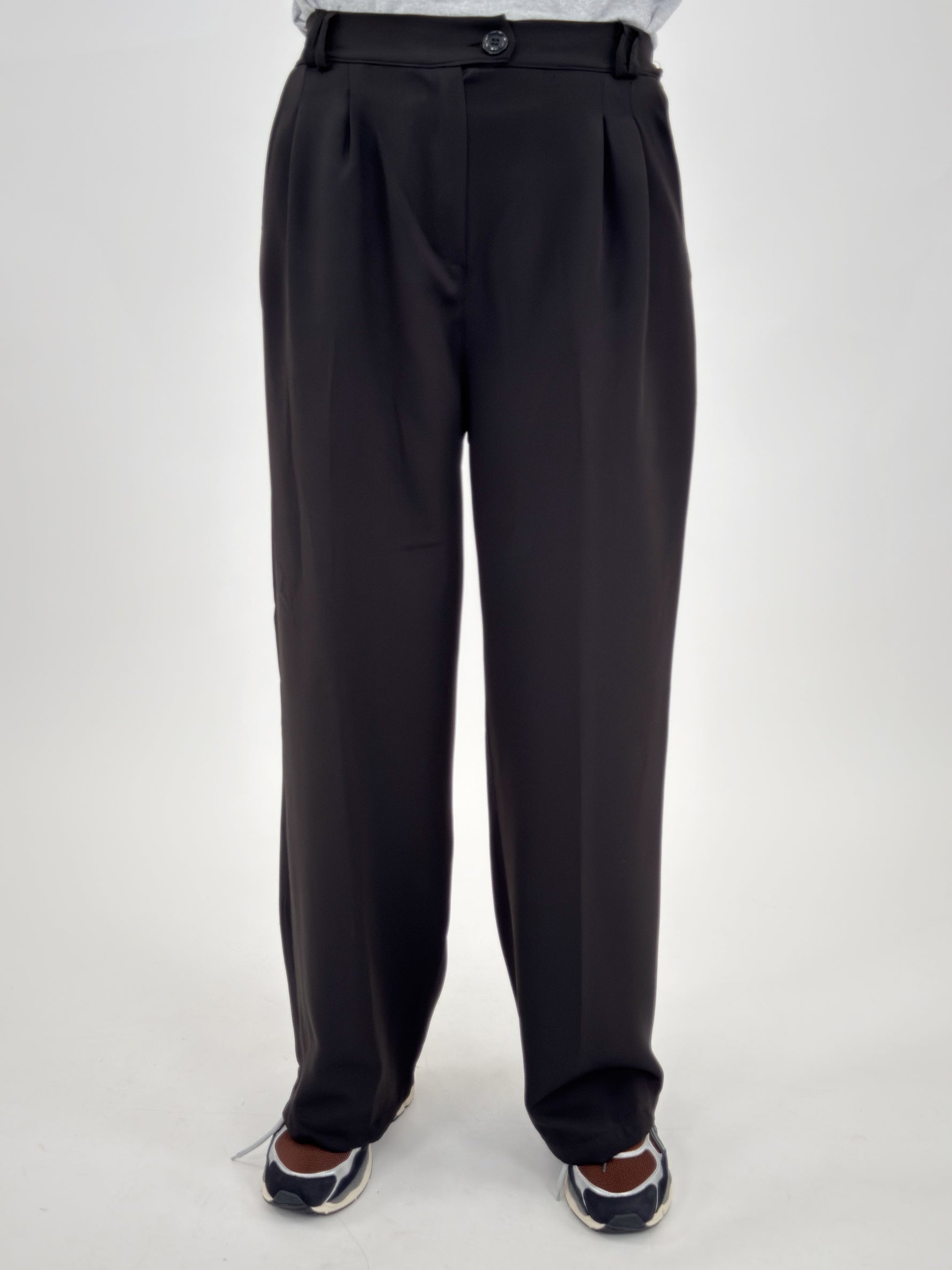 Pantalone a gamba larga con pinces sul davanti e tasche laterali. Bustino con elastico sul retro e chiusura con bottone e zip.
