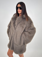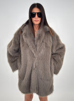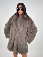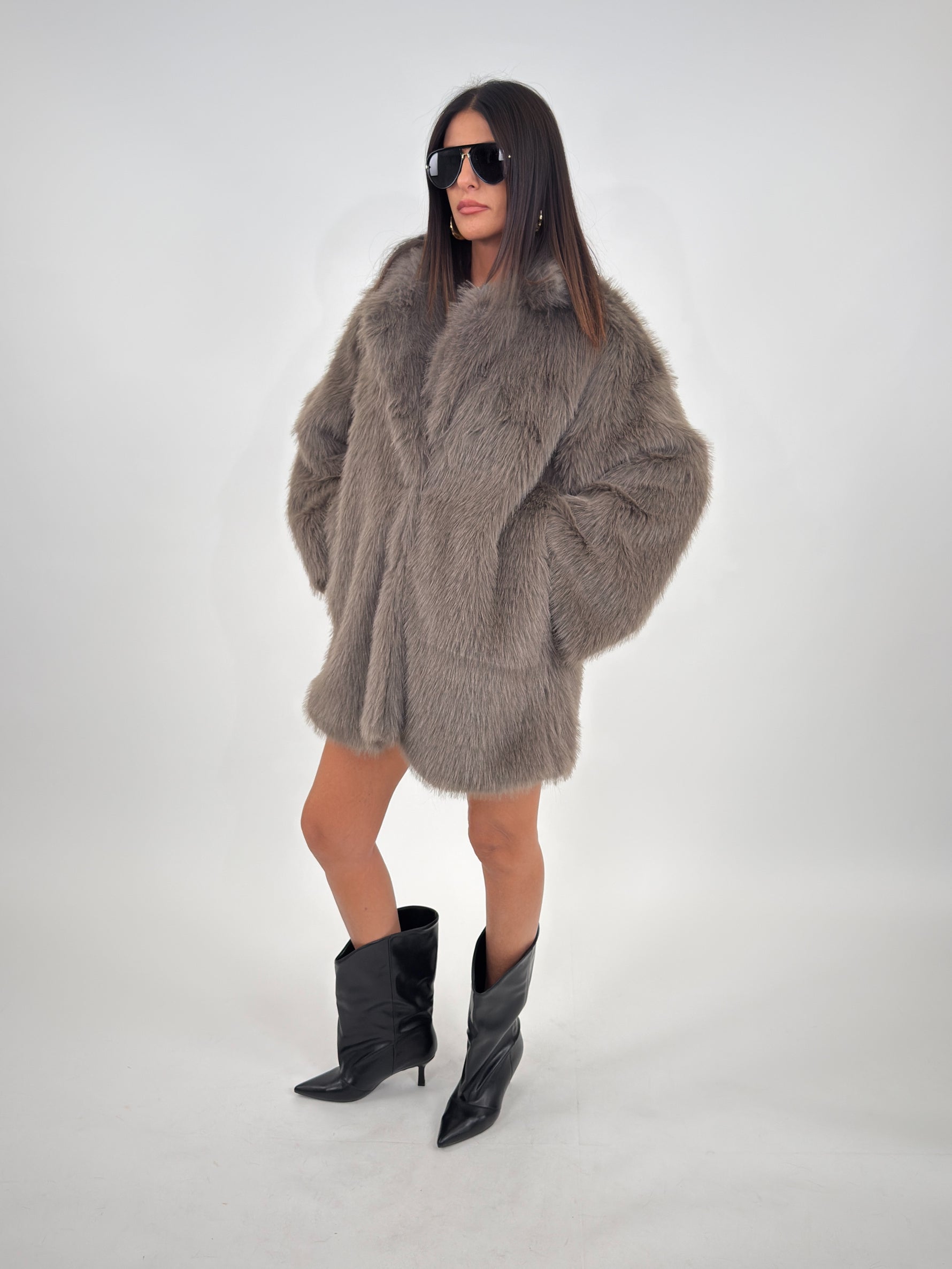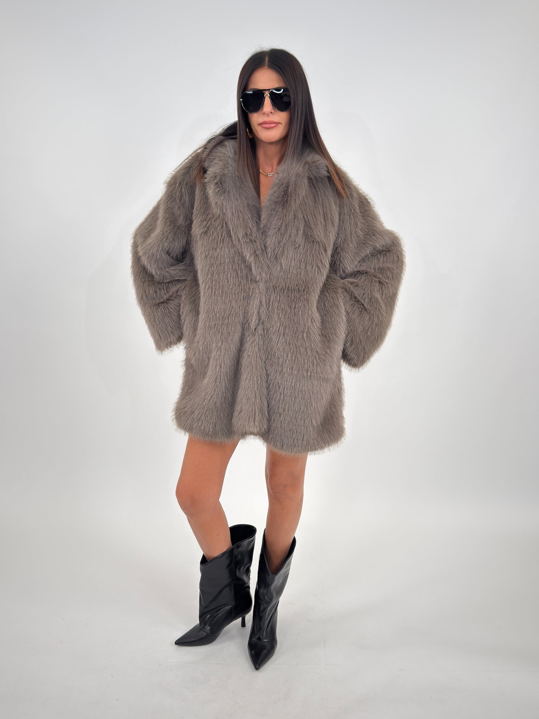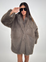Cappotto in pelliccia sintetica targato LUMINA, con collo a revers e fodera interna. Chiusura frontale con bottoni a pressione, maniche lunghe e tasche laterali.
