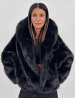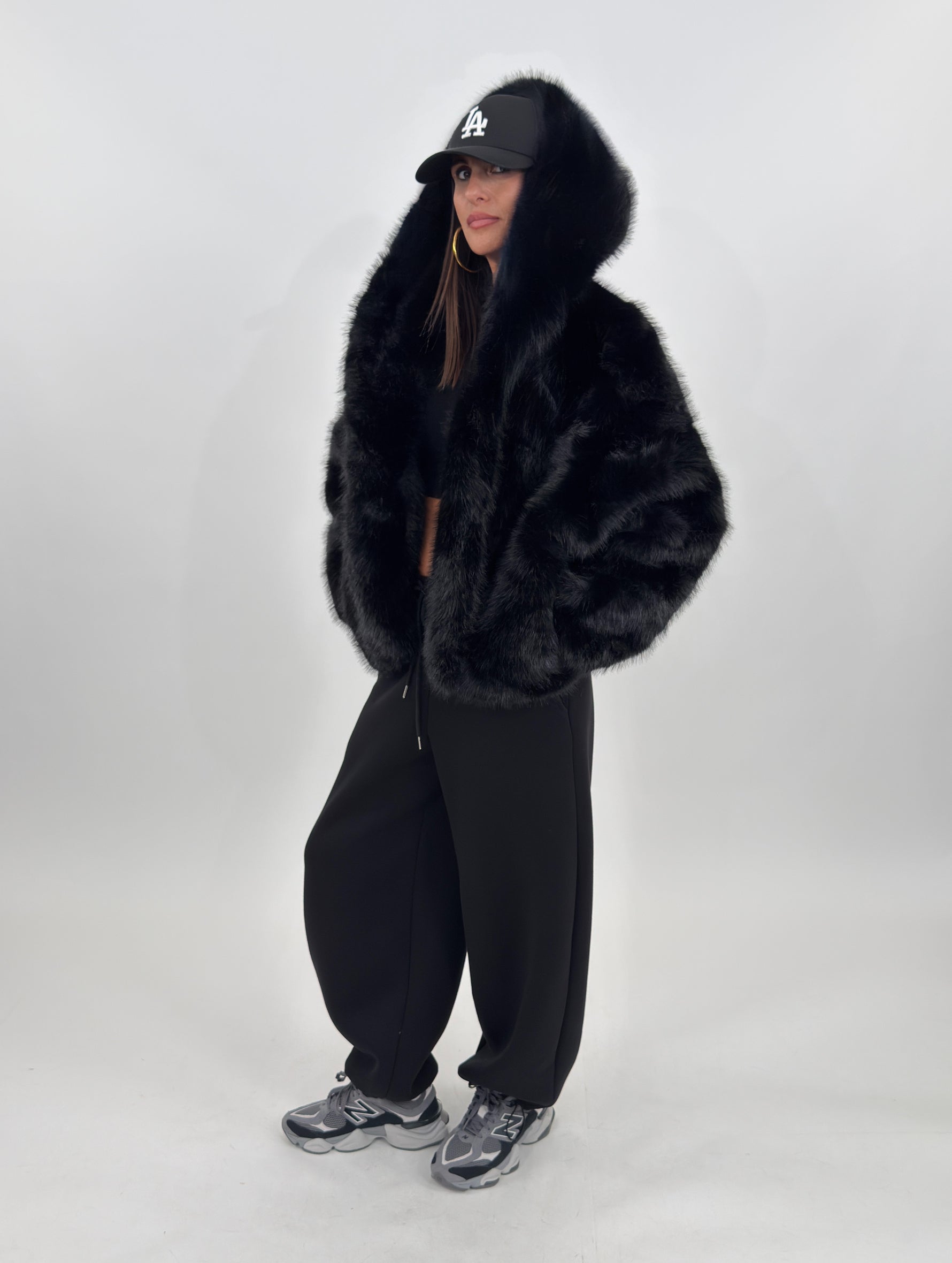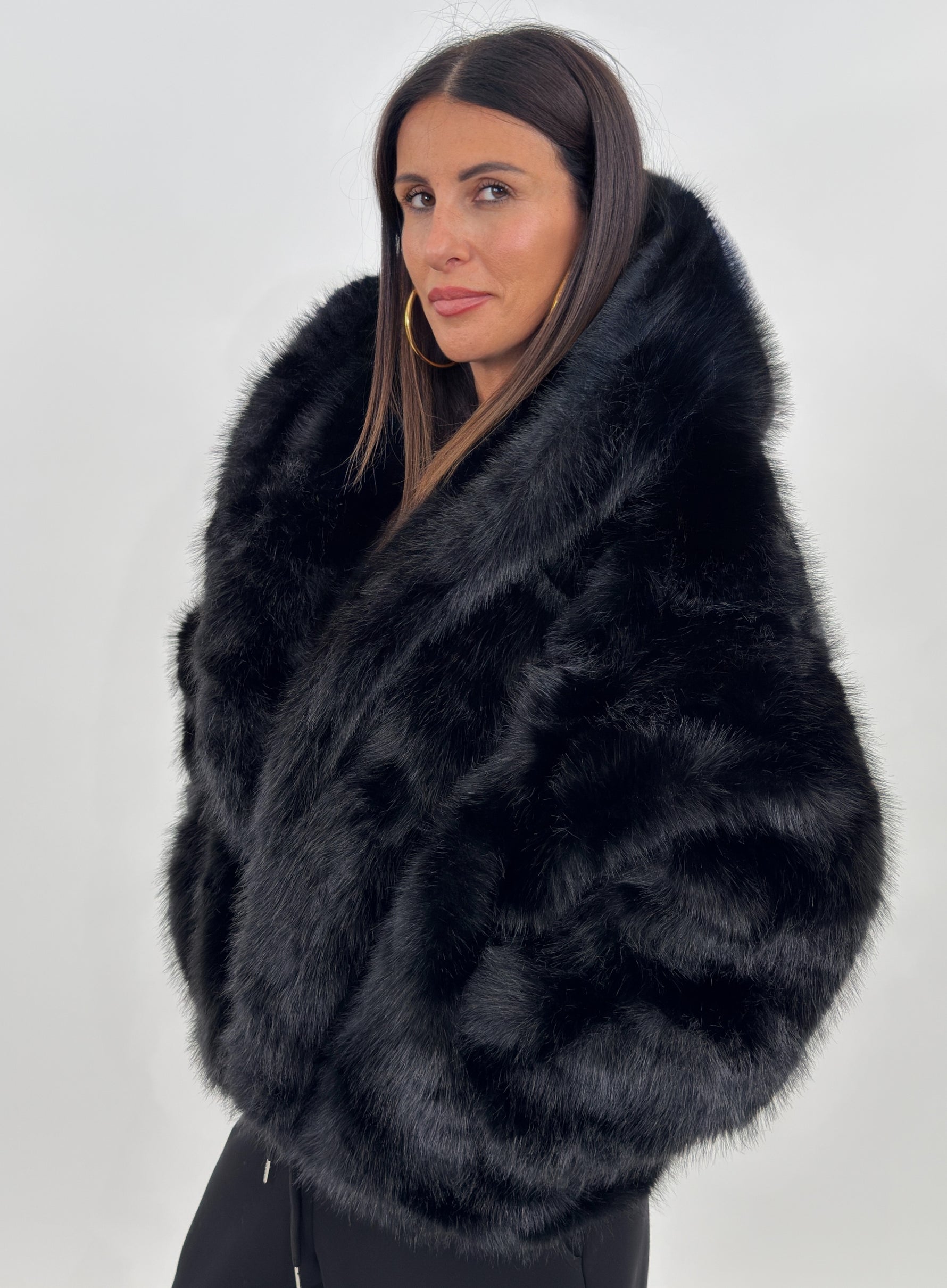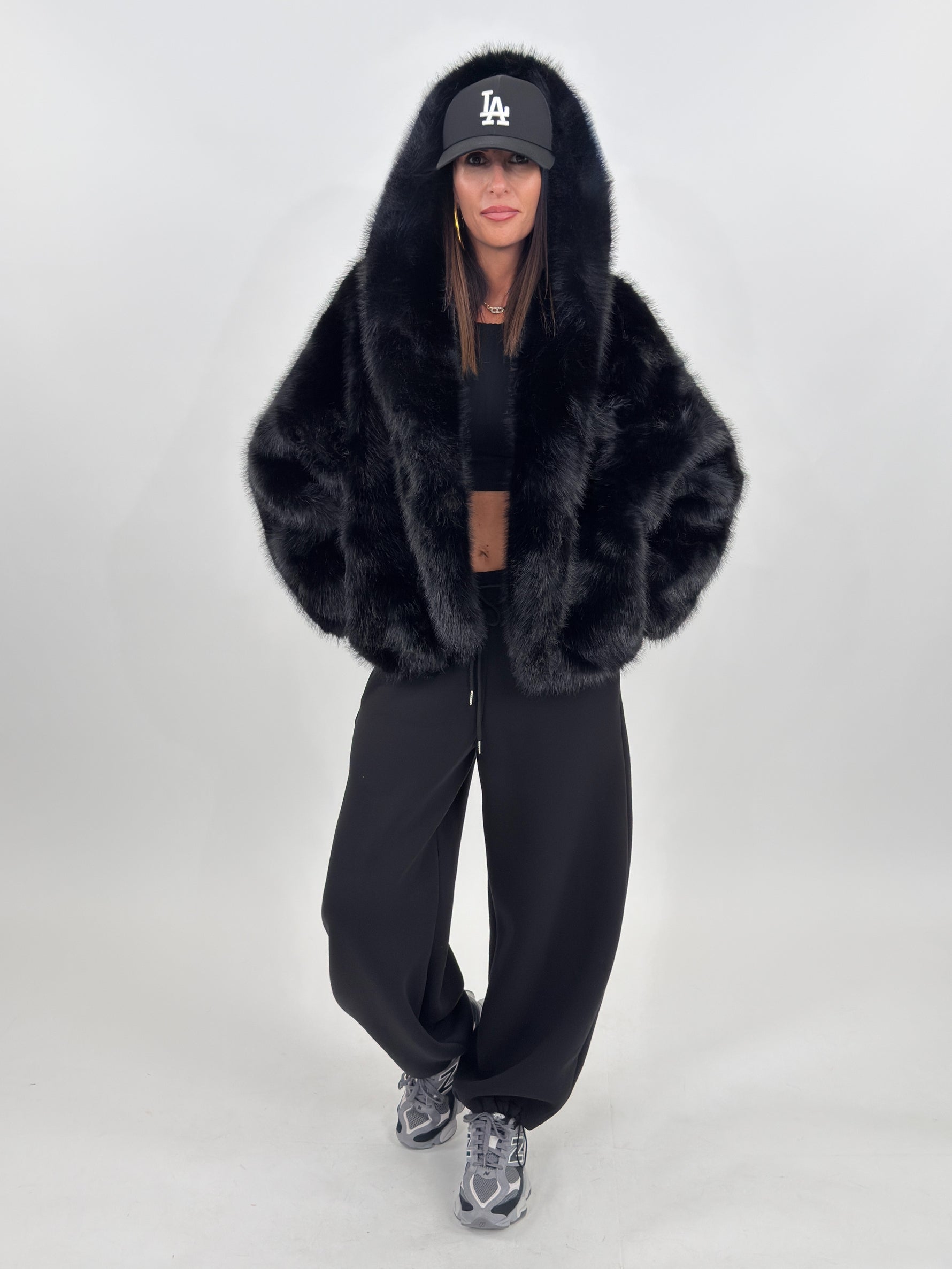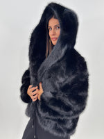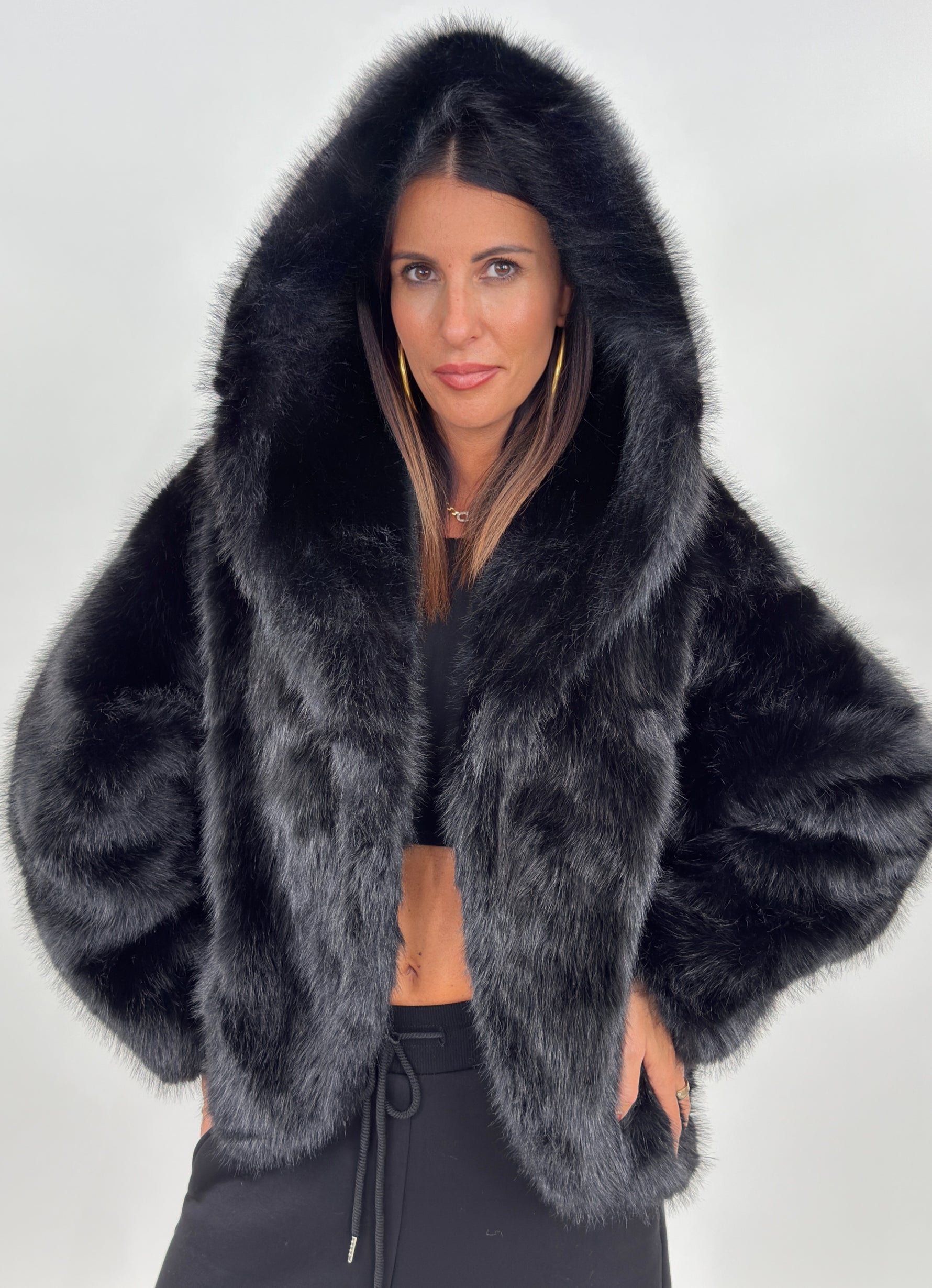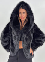 Pelliccia sintetica modello corto con cappuccio. Maniche lunghe e tasche laterali.