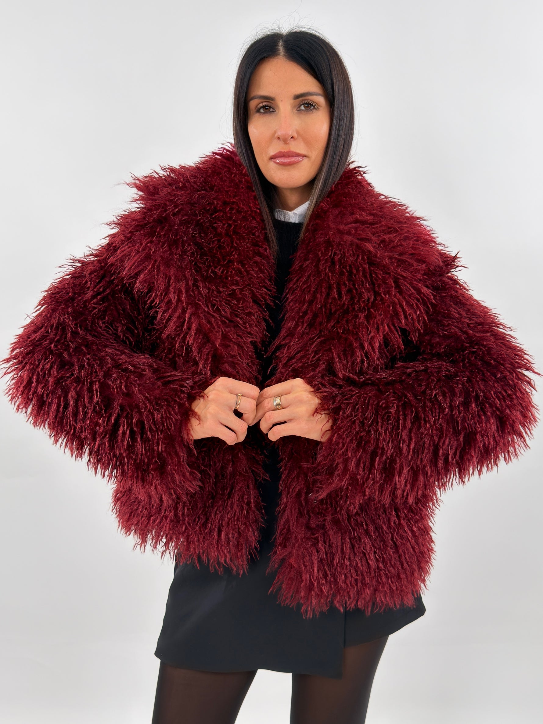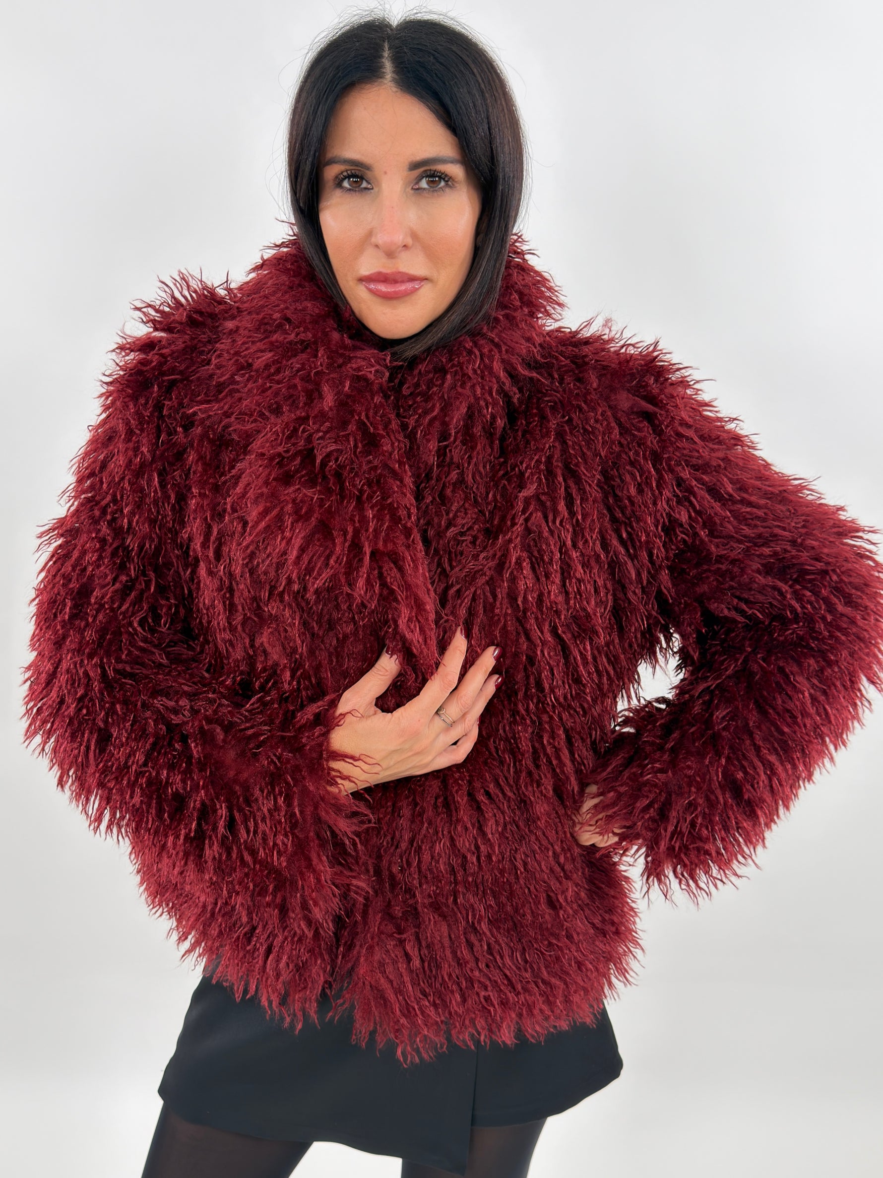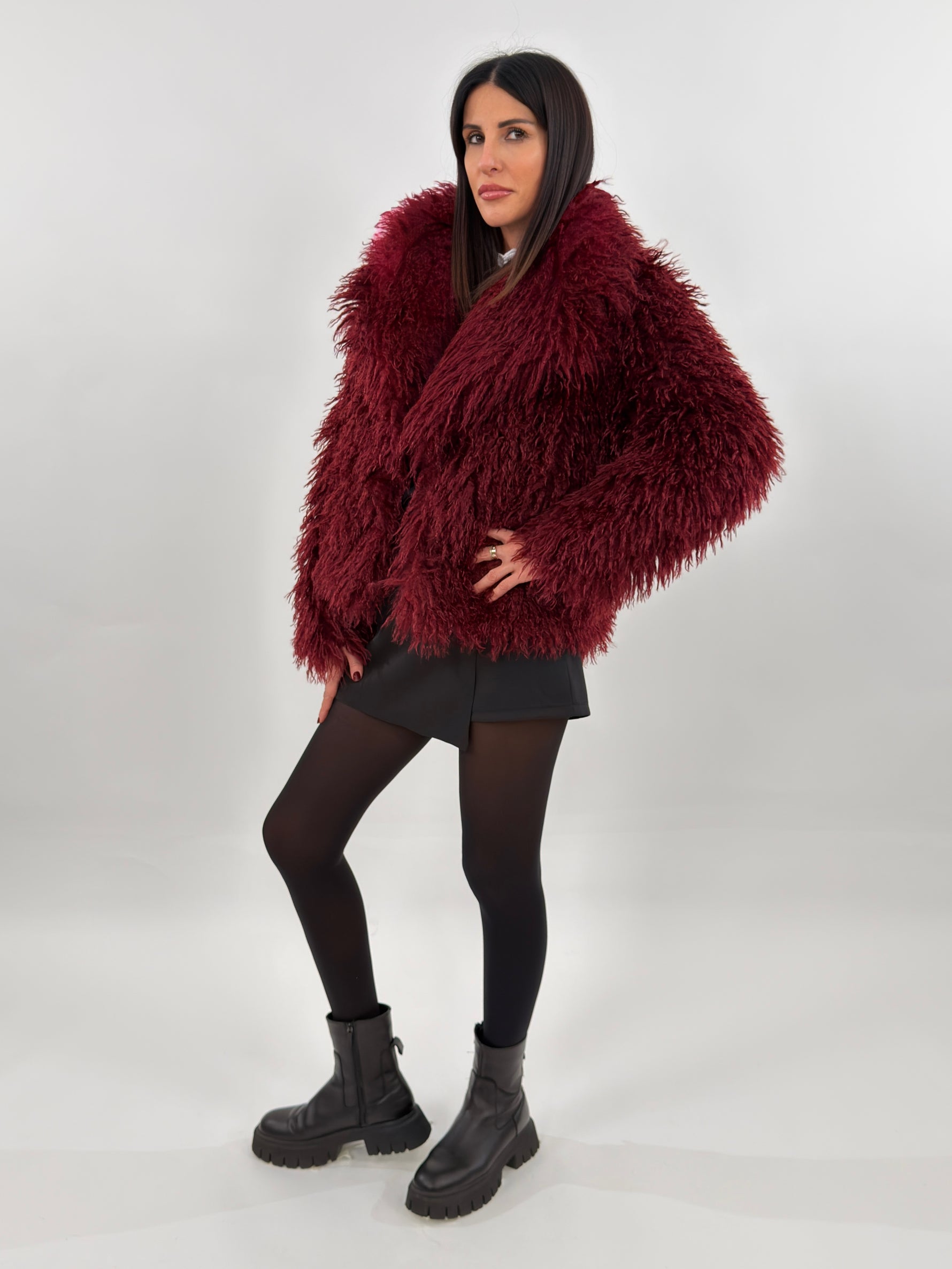 Pelliccia sintetica modello corto con collo a revers. Maniche lunghe e tasche laterali. Fodera interna. Chiusura con bottoni a pressione.