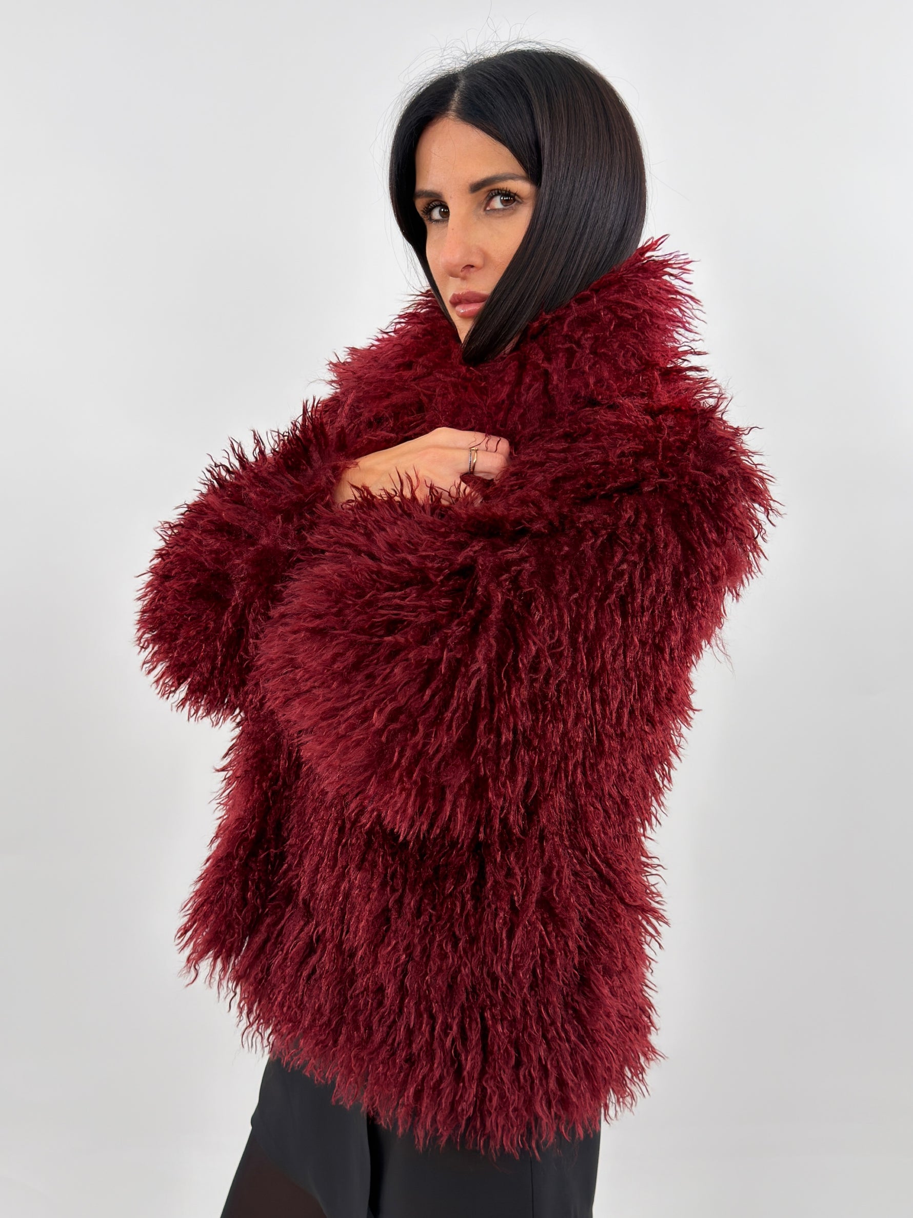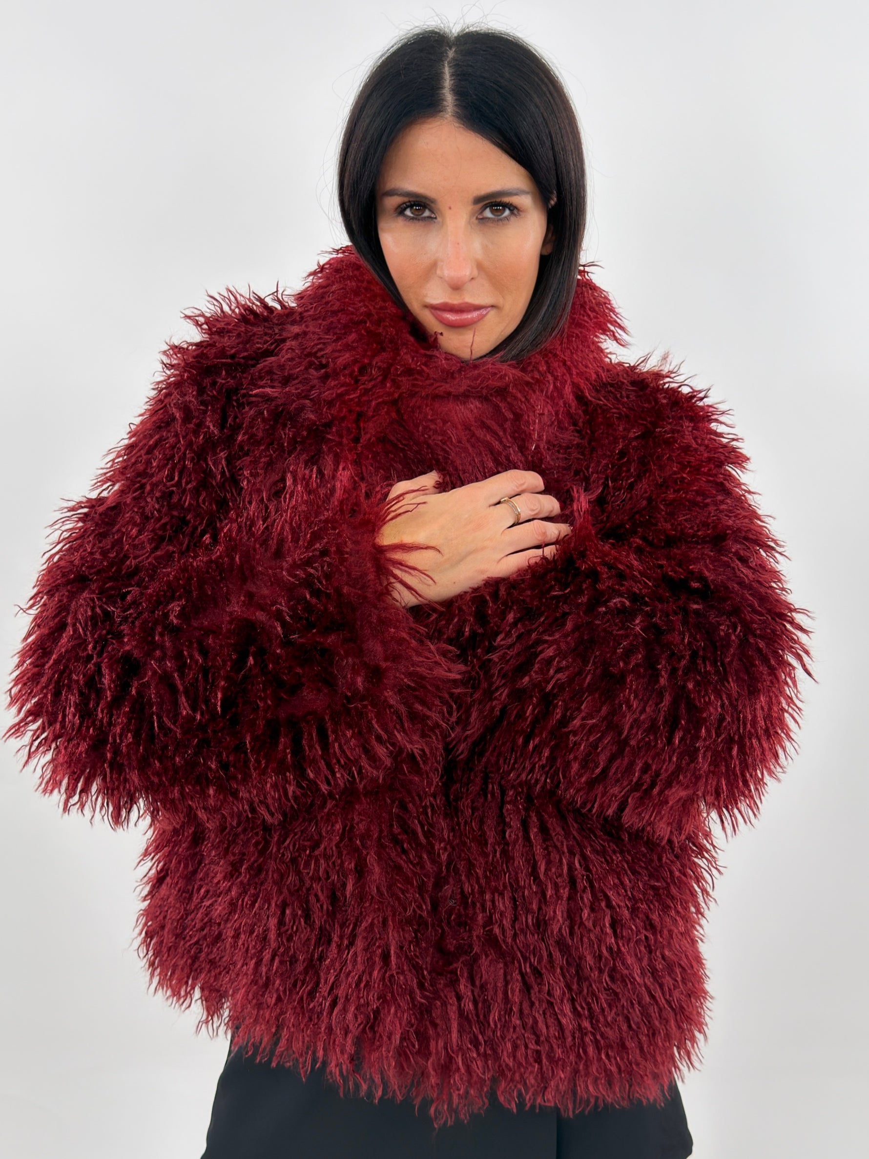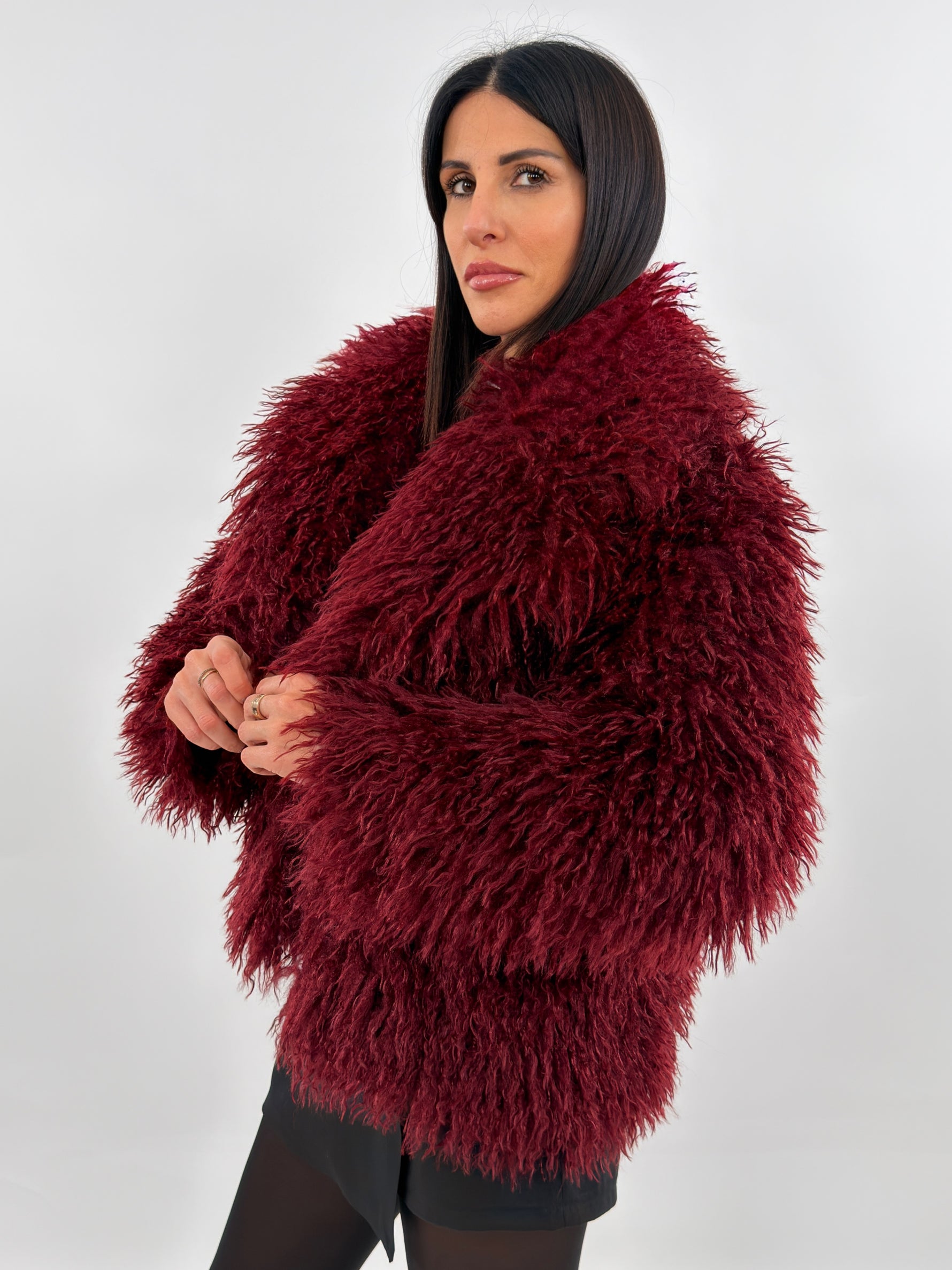 Pelliccia sintetica modello corto con collo a revers. Maniche lunghe e tasche laterali. Fodera interna. Chiusura con bottoni a pressione.