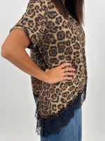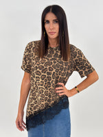 T-shirt targata LUMINA, modello girocollo nella stampa animalier. Taglio asimmetrico sul fondo e dettaglio orlo in pizzo.