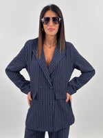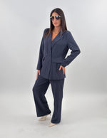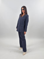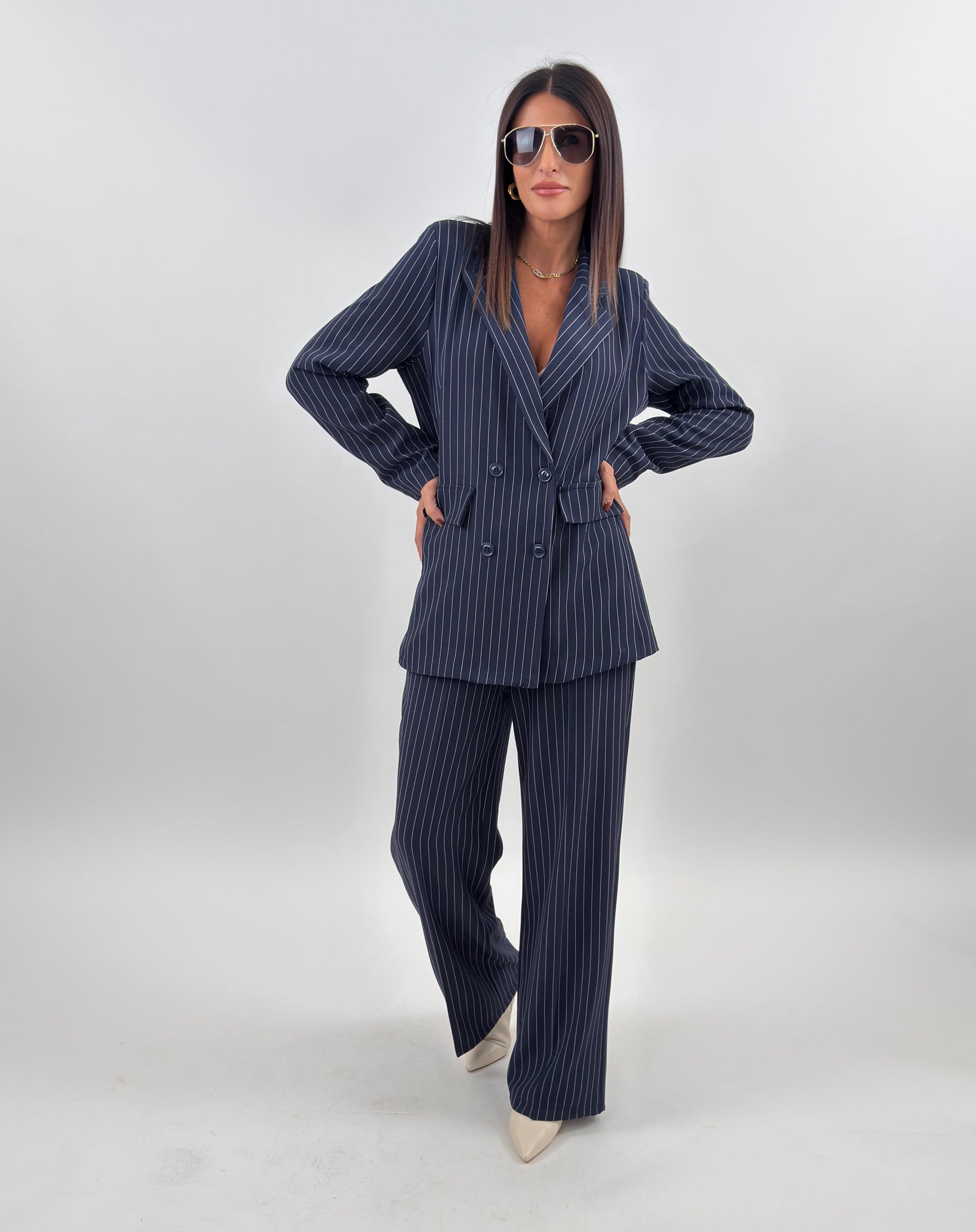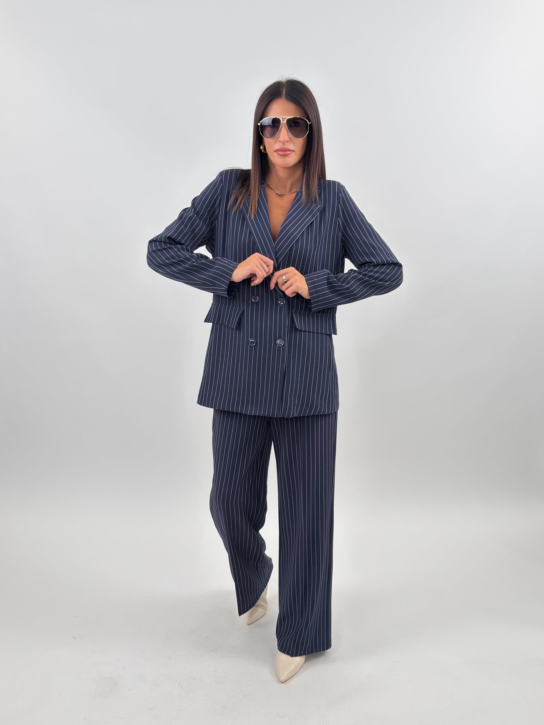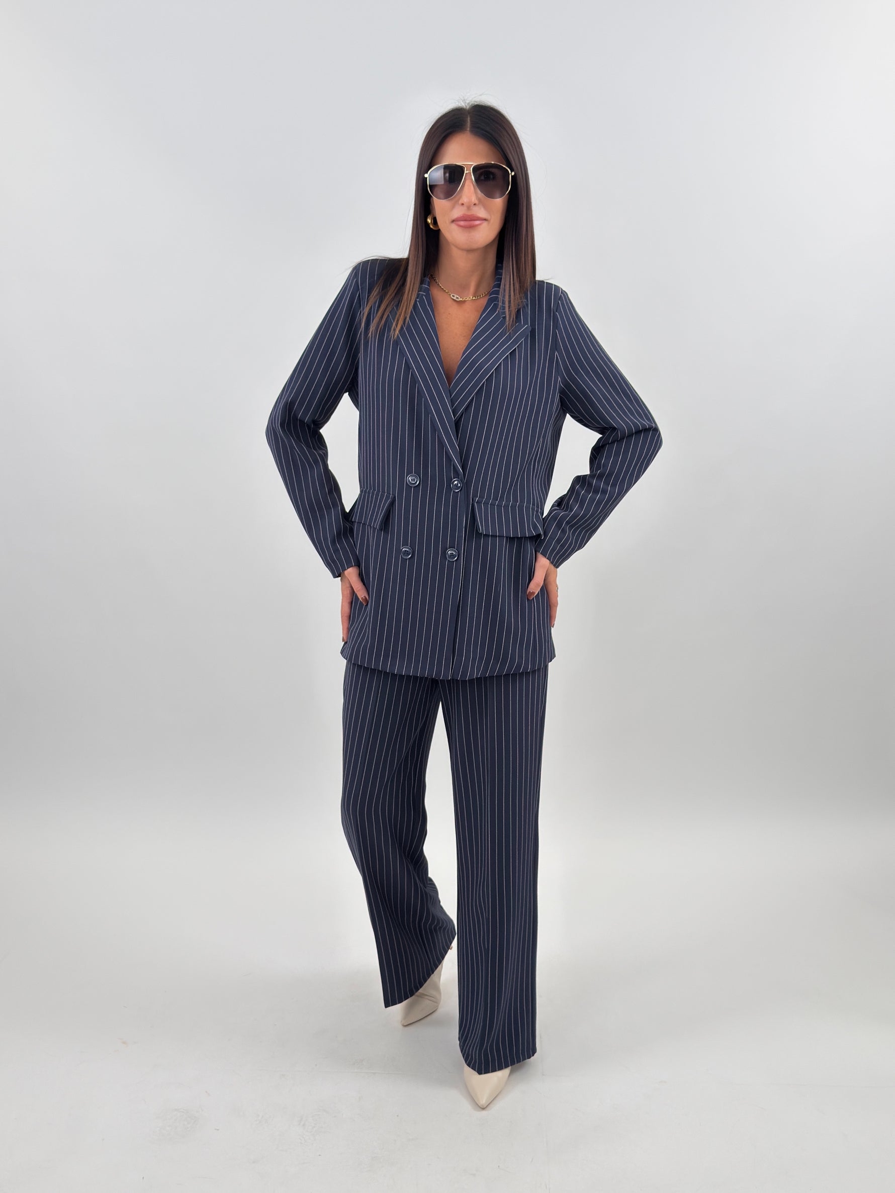 Tailleur nella trama gessata composto da giacca modello doppio petto, tasche frontali con patta e maniche lunghe con spalline imbottite. Pantalone a gamba larga con bustino elastico sul retro e chiusura con zip e bottone.