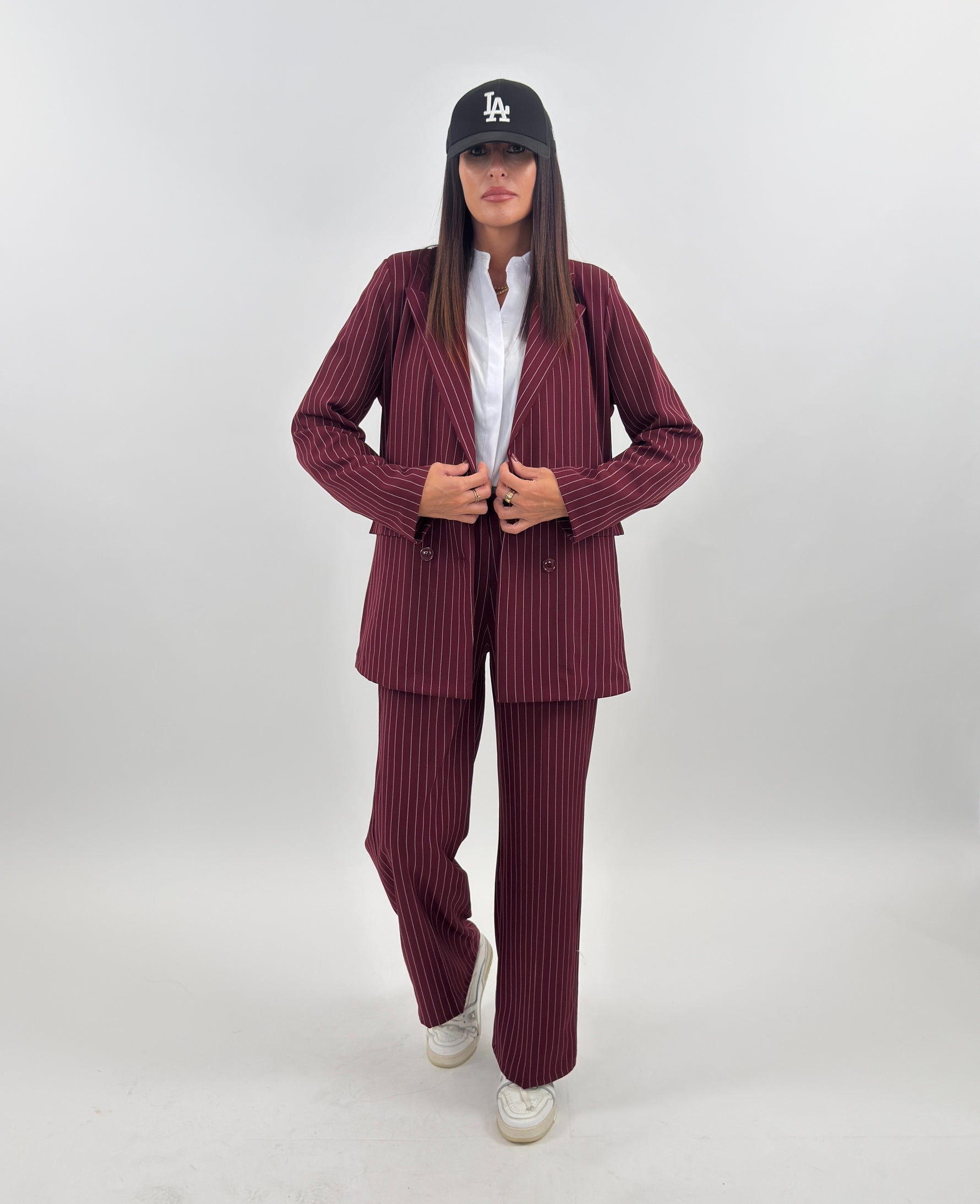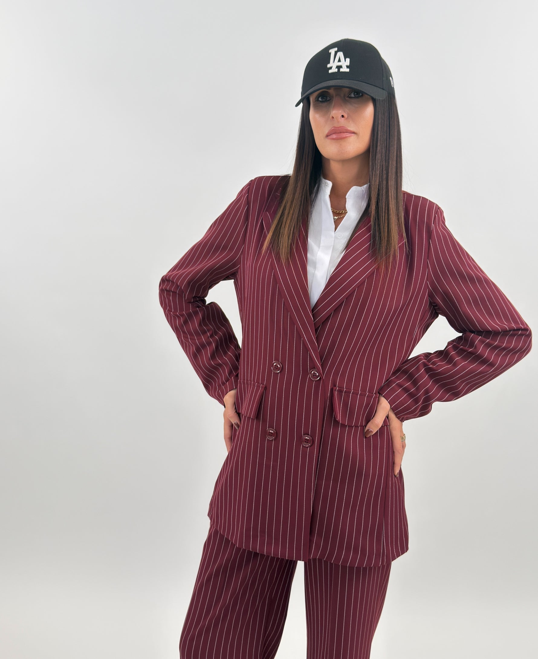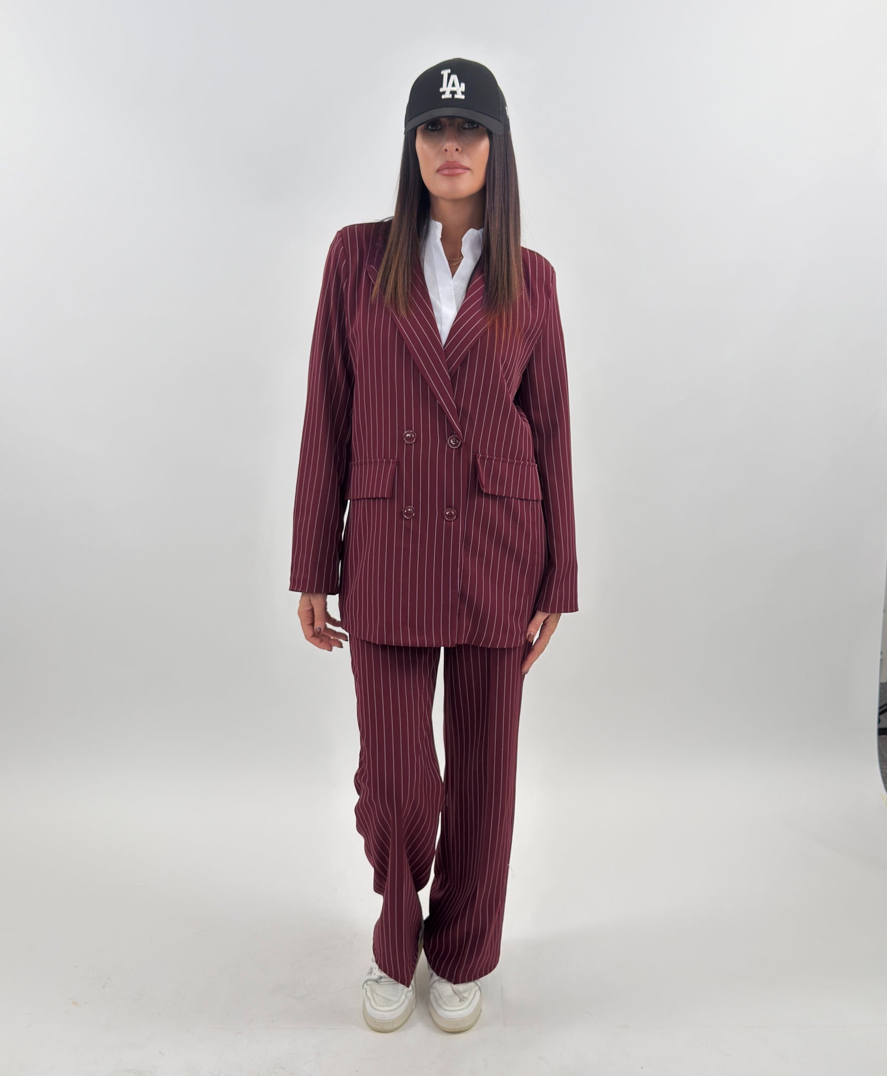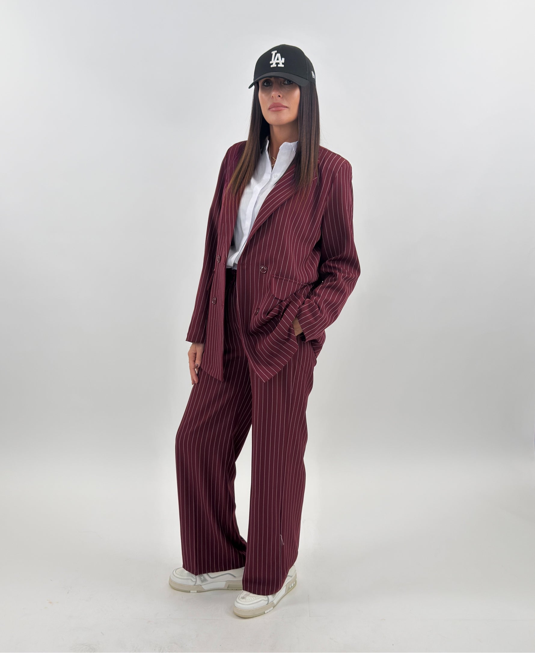 Tailleur nella trama gessata composto da giacca modello doppio petto, tasche frontali con patta e maniche lunghe con spalline imbottite. Pantalone a gamba larga con bustino elastico sul retro e chiusura con zip e bottone.