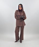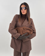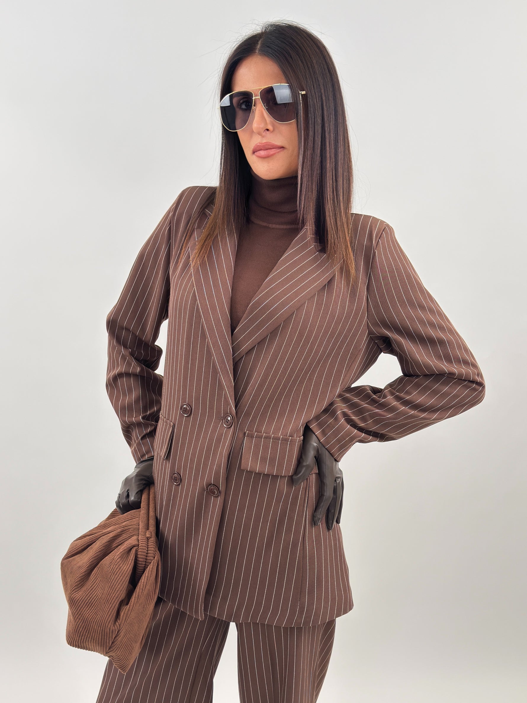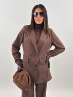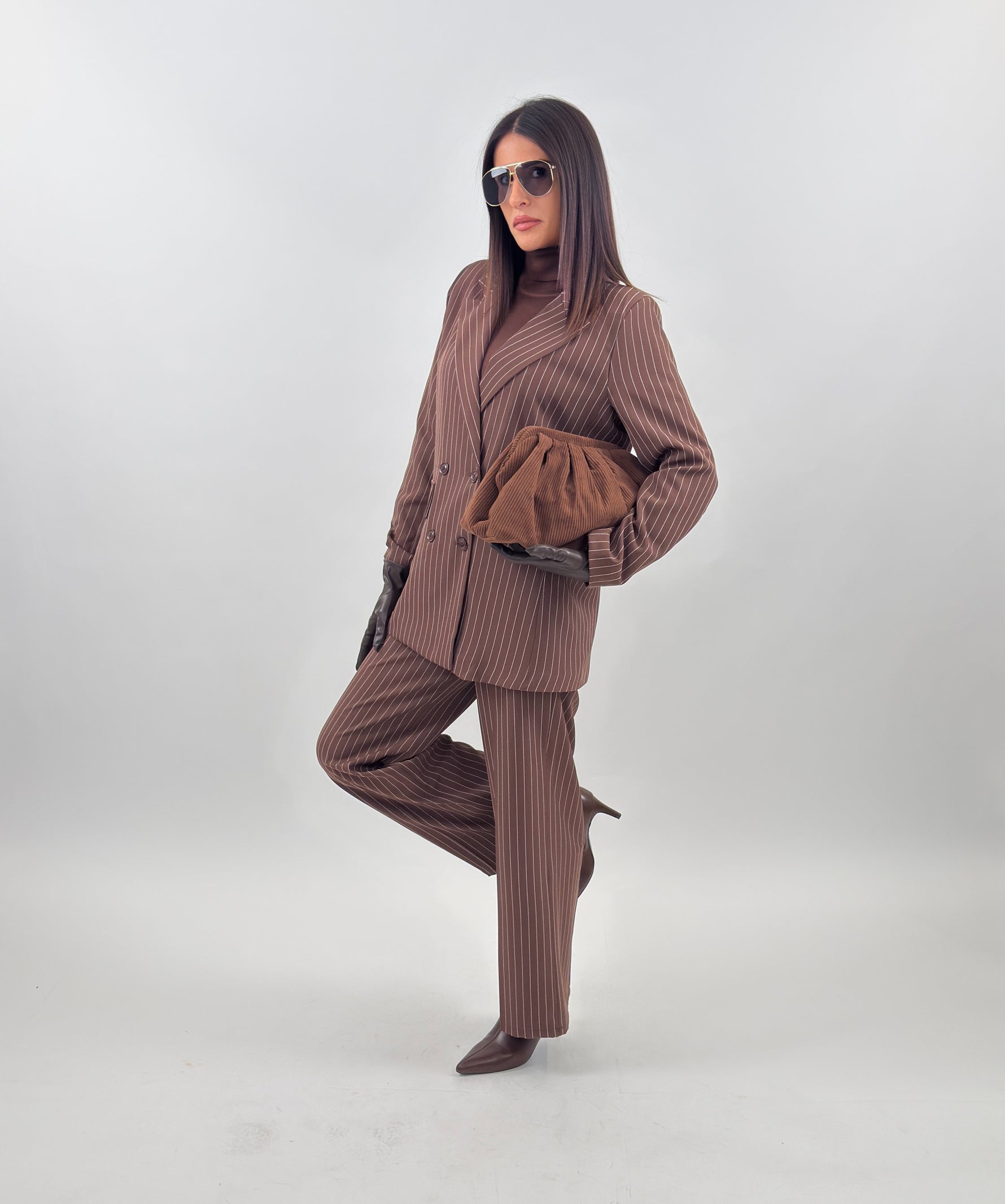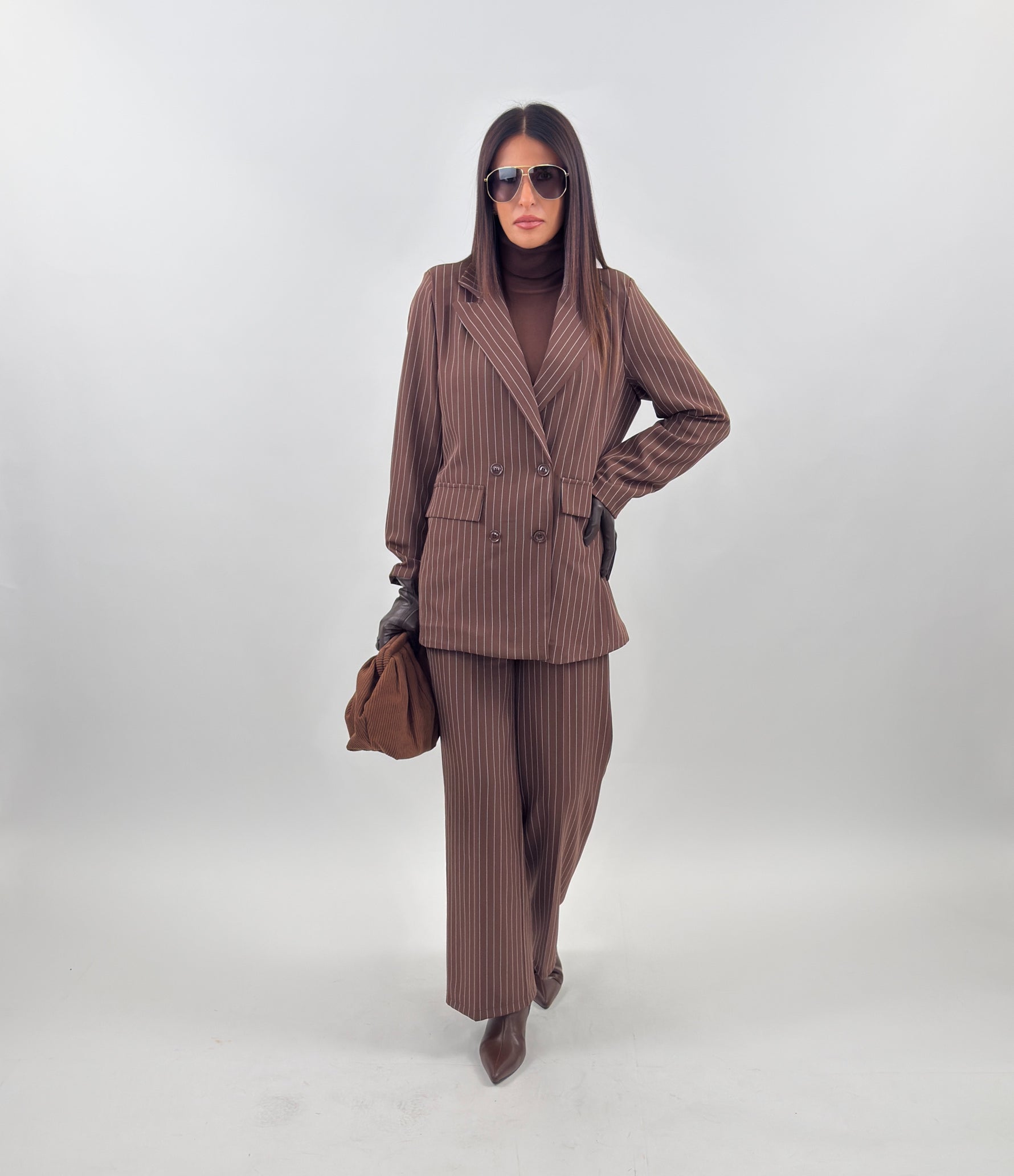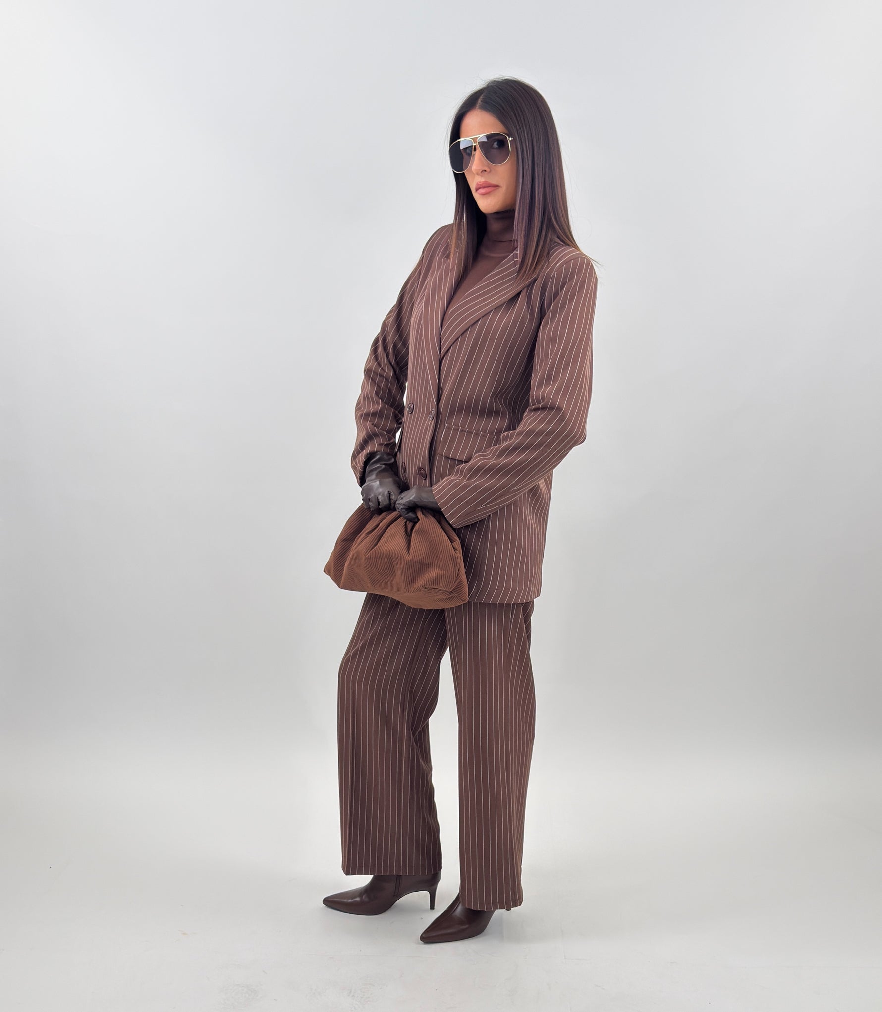 Tailleur nella trama gessata composto da giacca modello doppio petto, tasche frontali con patta e maniche lunghe con spalline imbottite. Pantalone a gamba larga con bustino elastico sul retro e chiusura con zip e bottone.