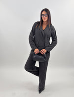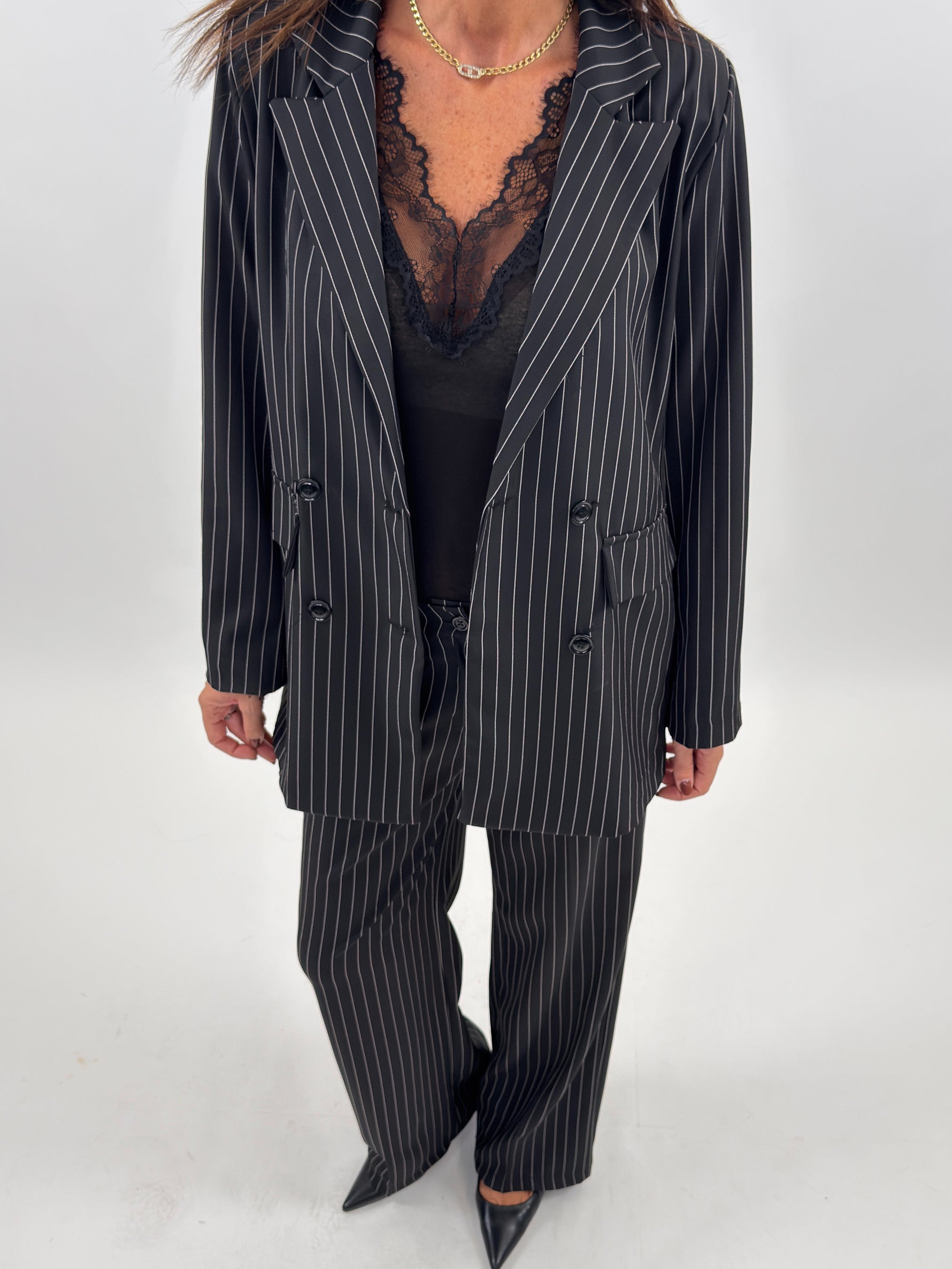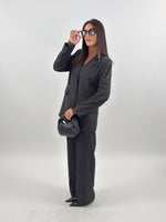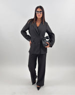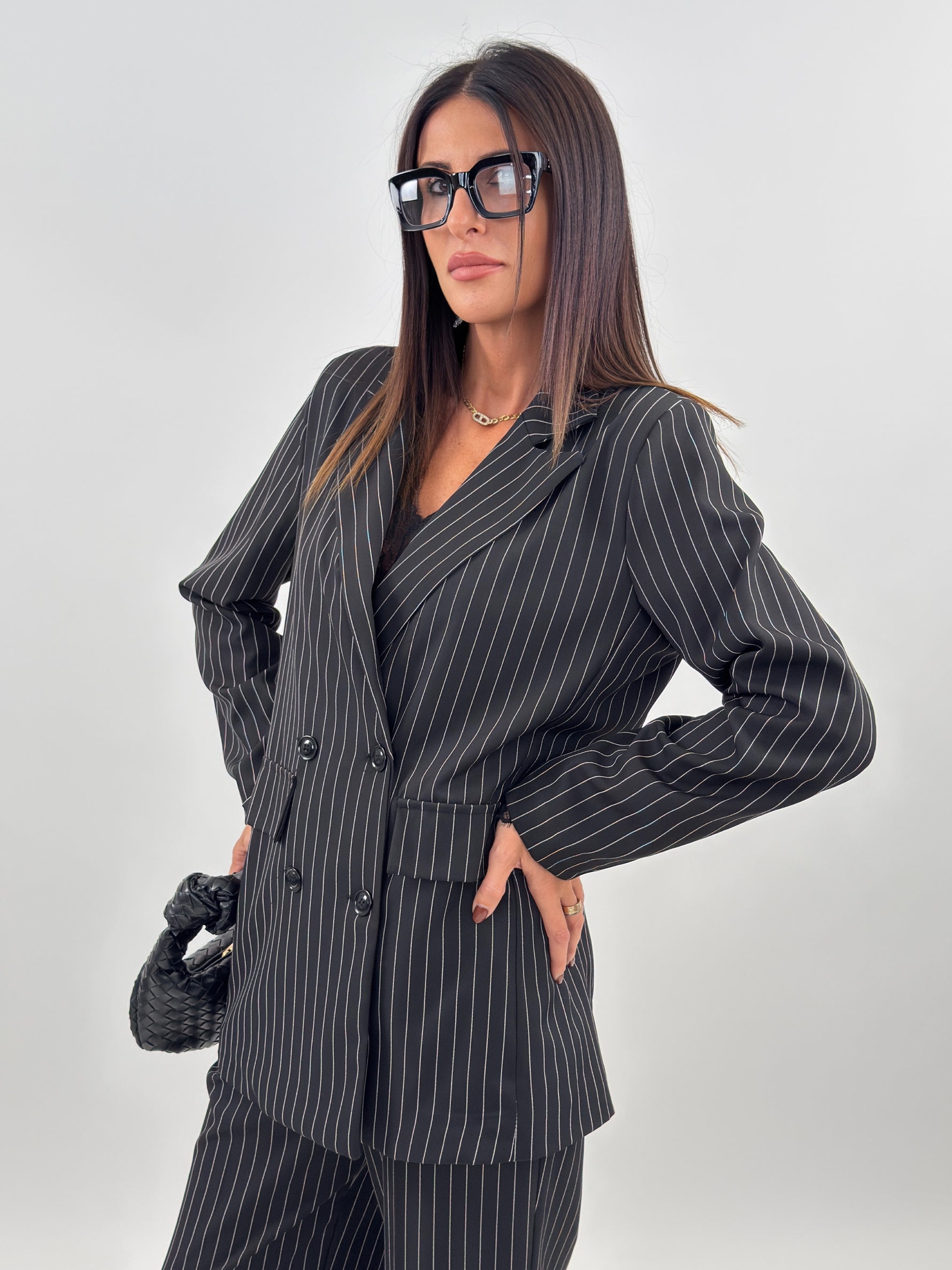 Tailleur nella trama gessata composto da giacca modello doppio petto, tasche frontali con patta e maniche lunghe con spalline imbottite. Pantalone a gamba larga con bustino elastico sul retro e chiusura con zip e bottone.