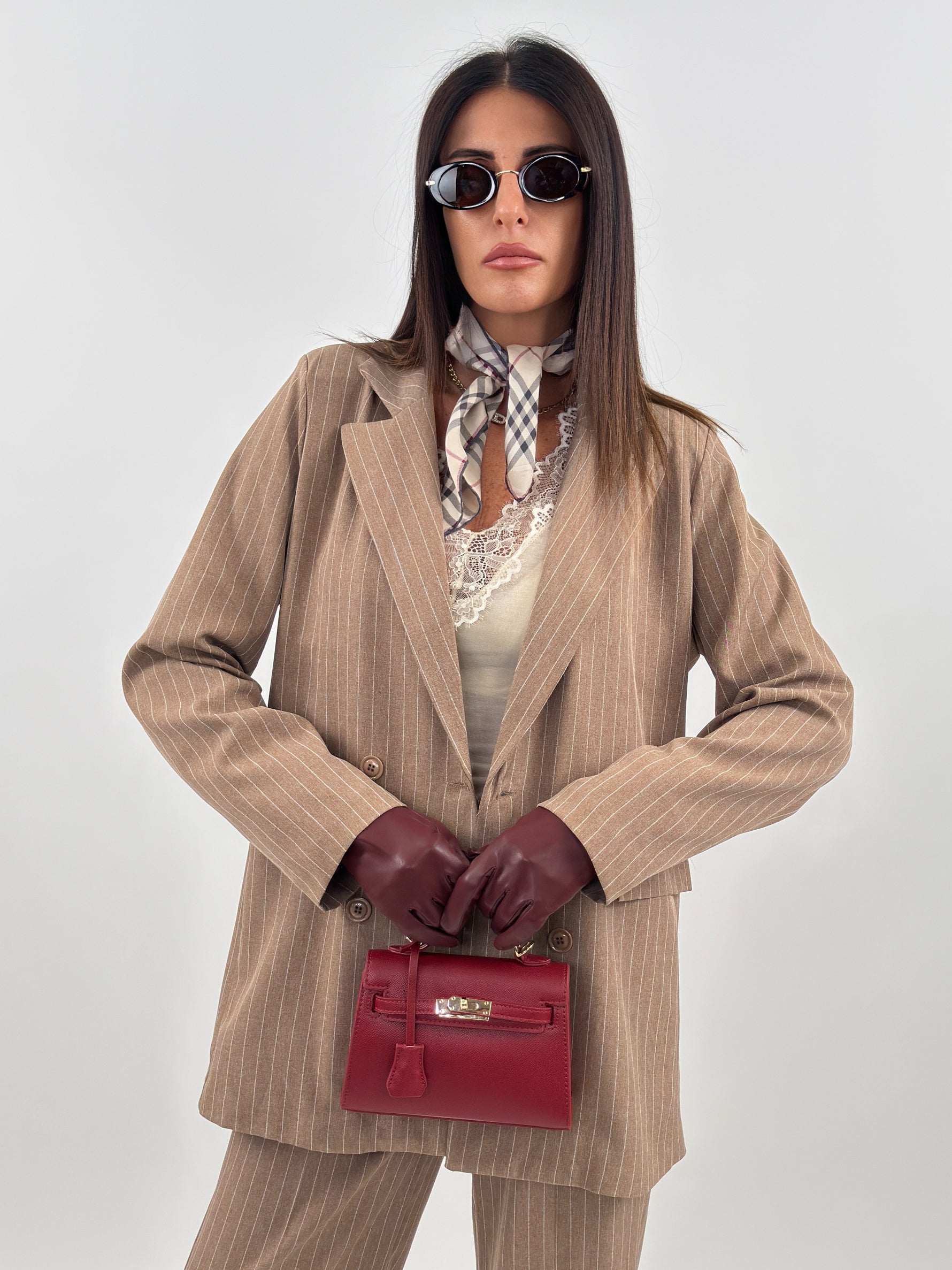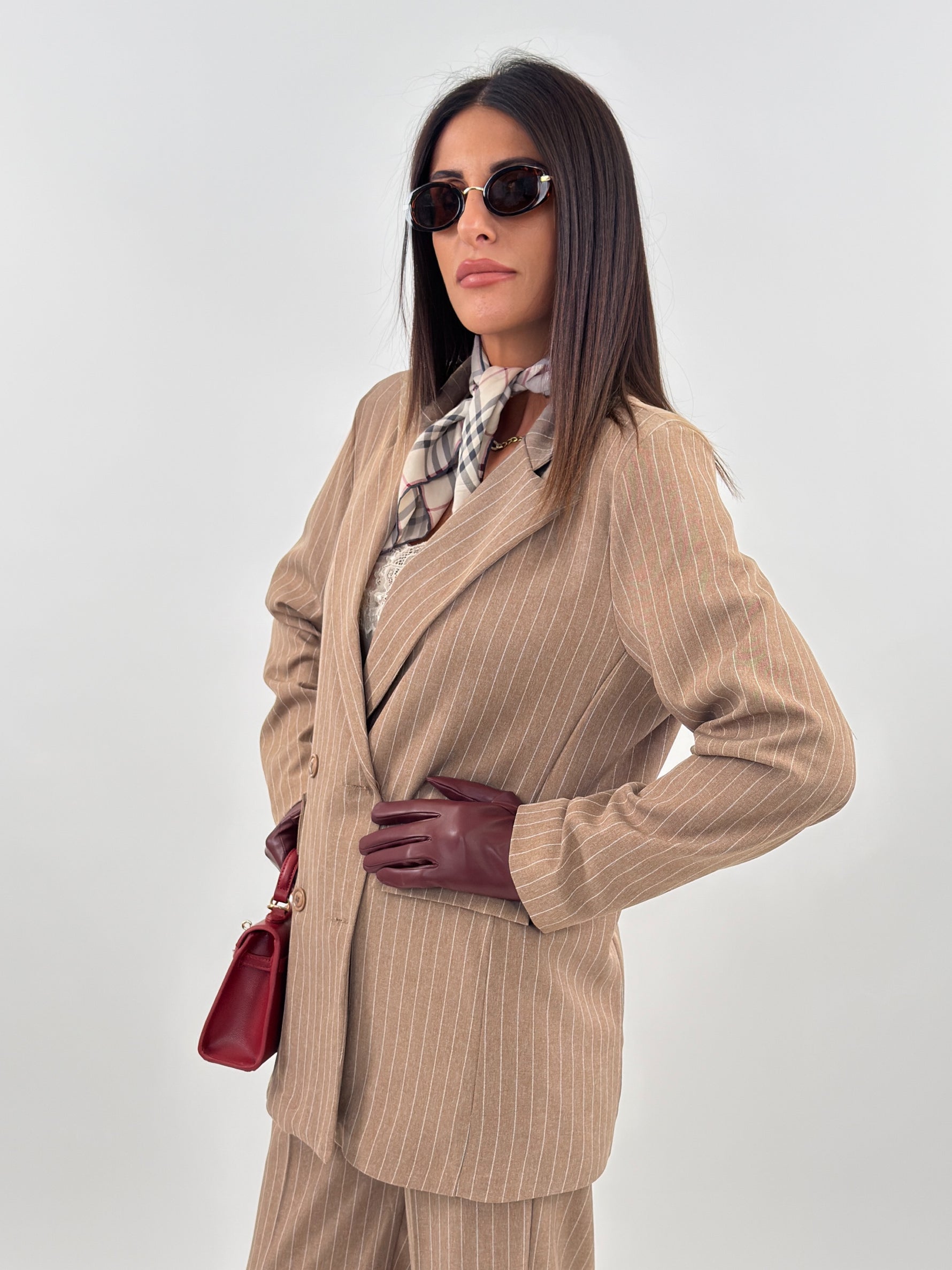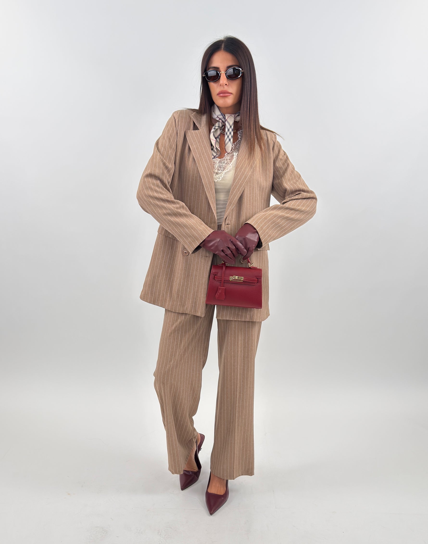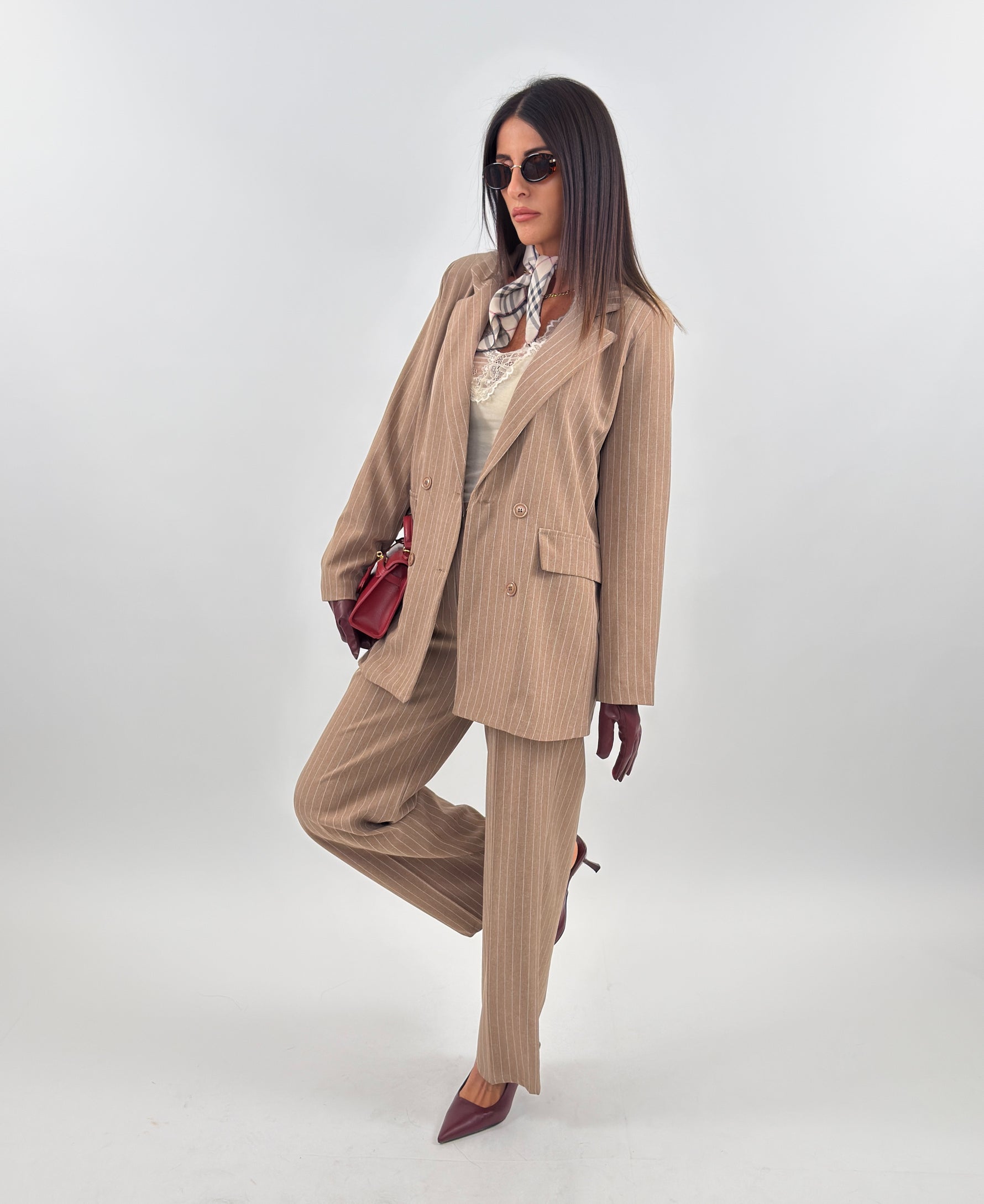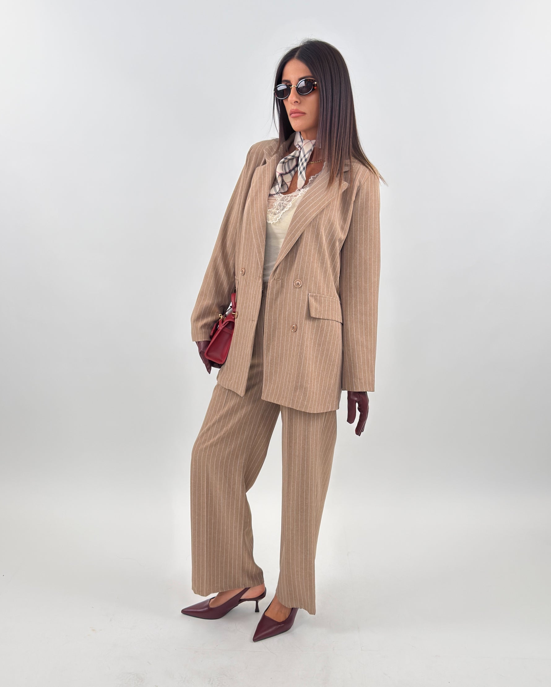 Tailleur nella trama gessata composto da giacca modello doppio petto, tasche frontali con patta e maniche lunghe con spalline imbottite. Pantalone a gamba larga con bustino elastico sul retro e chiusura con zip e bottone.