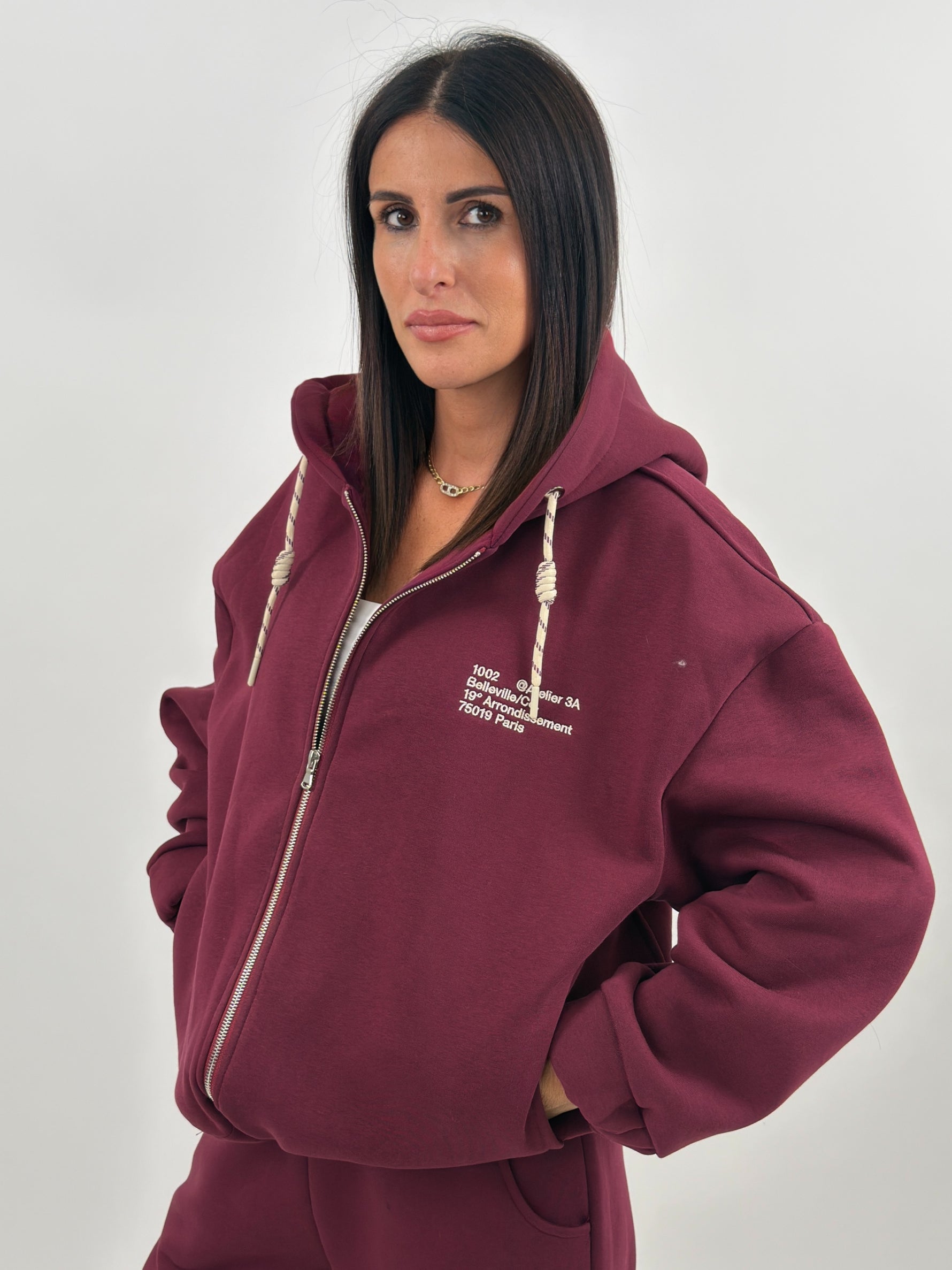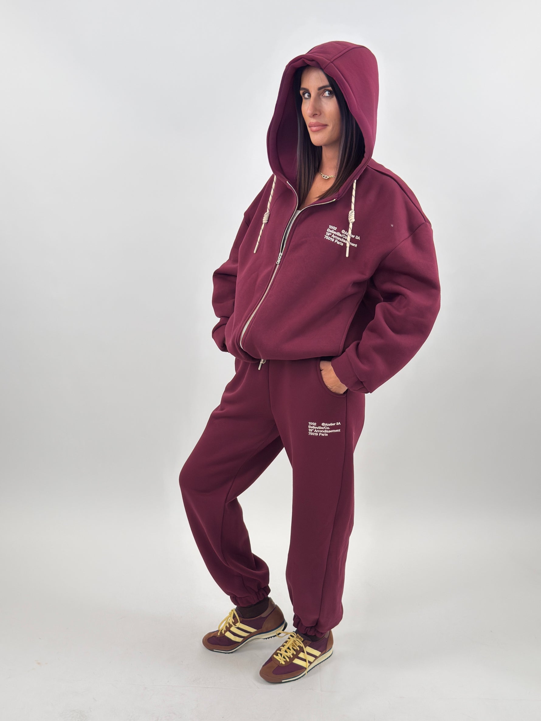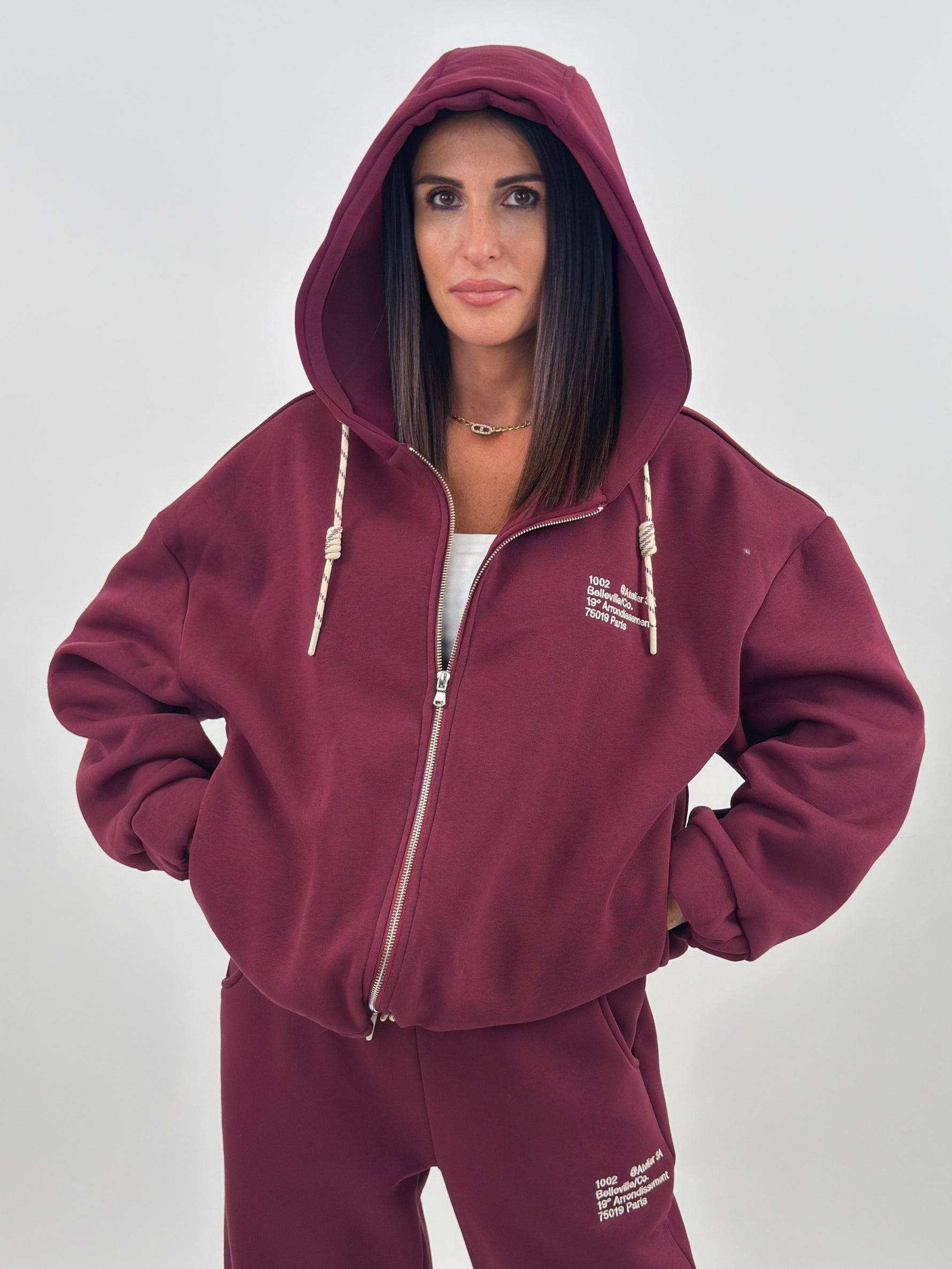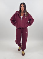Tuta Athletics by Lumina, modello felpato, composta da felpa con cappuccio, tasche laterali e chiusura frontale con zip e stampa ricamata . Maniche lunghe con spalle cadenti e fondo elastico. Pantalone modello jogger con tasche laterali. Bustino elastico in vita e laccetti regolabili.
