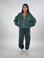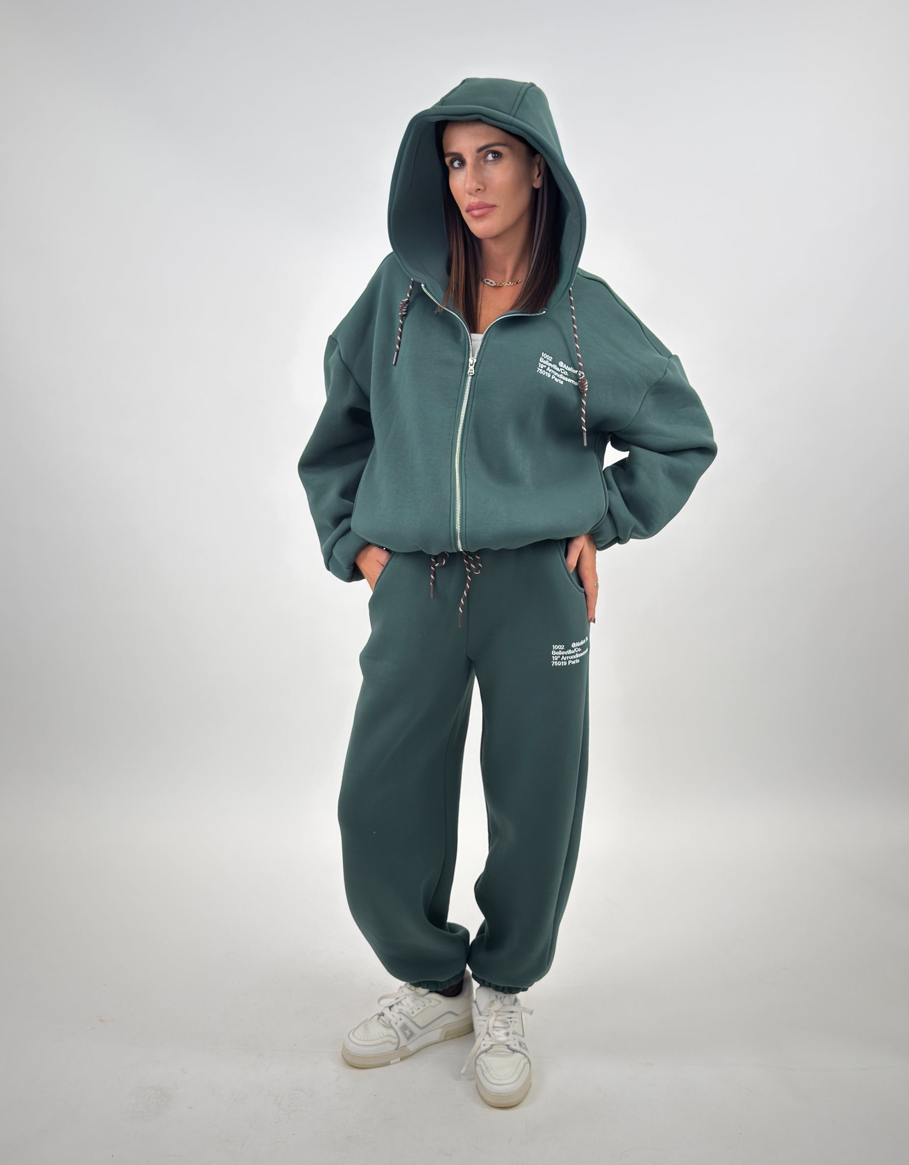Tuta Athletics by Lumina, modello felpato, composta da felpa con cappuccio, tasche laterali e chiusura frontale con zip e stampa ricamata . Maniche lunghe con spalle cadenti e fondo elastico. Pantalone modello jogger con tasche laterali. Bustino elastico in vita e laccetti regolabili.