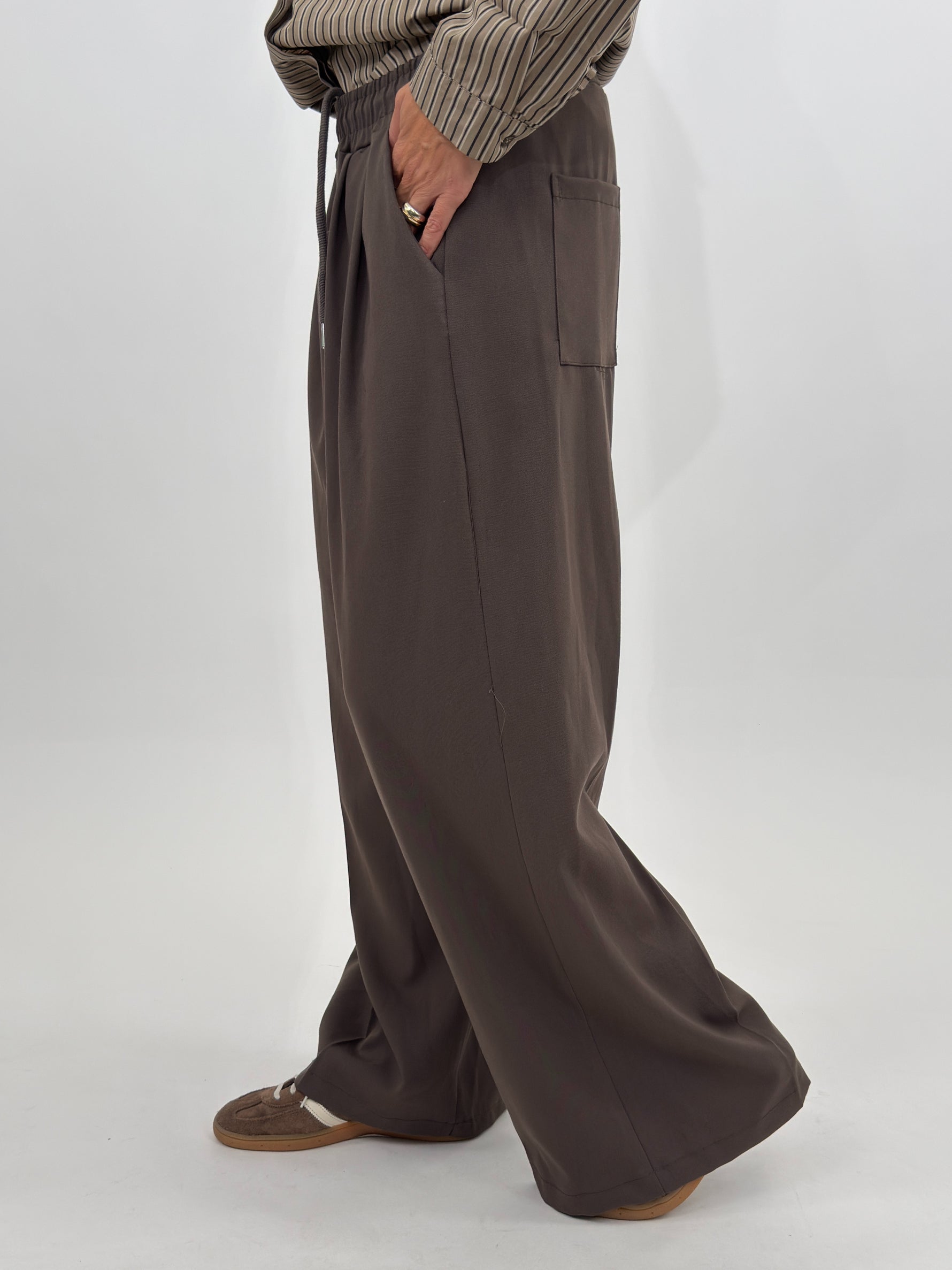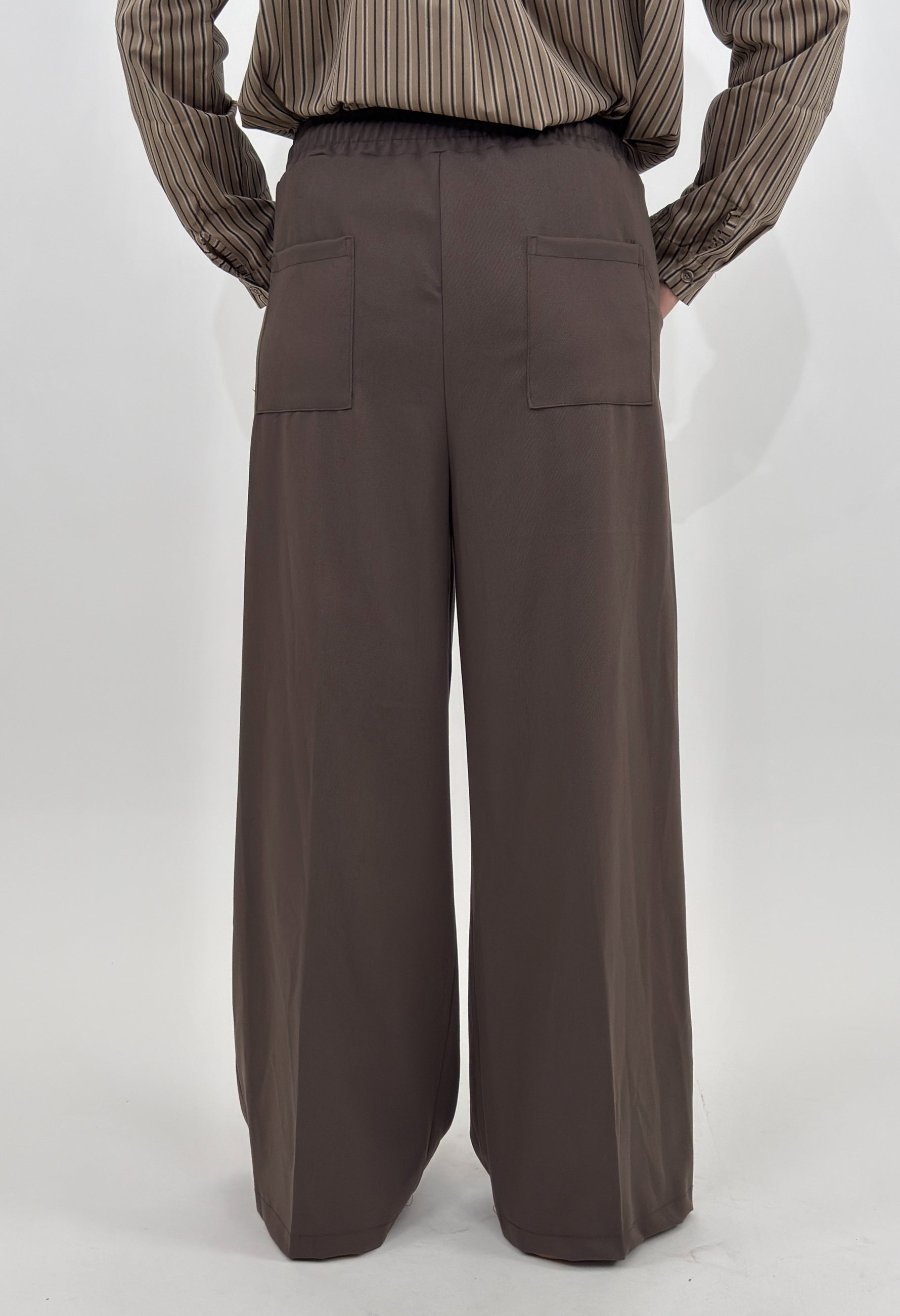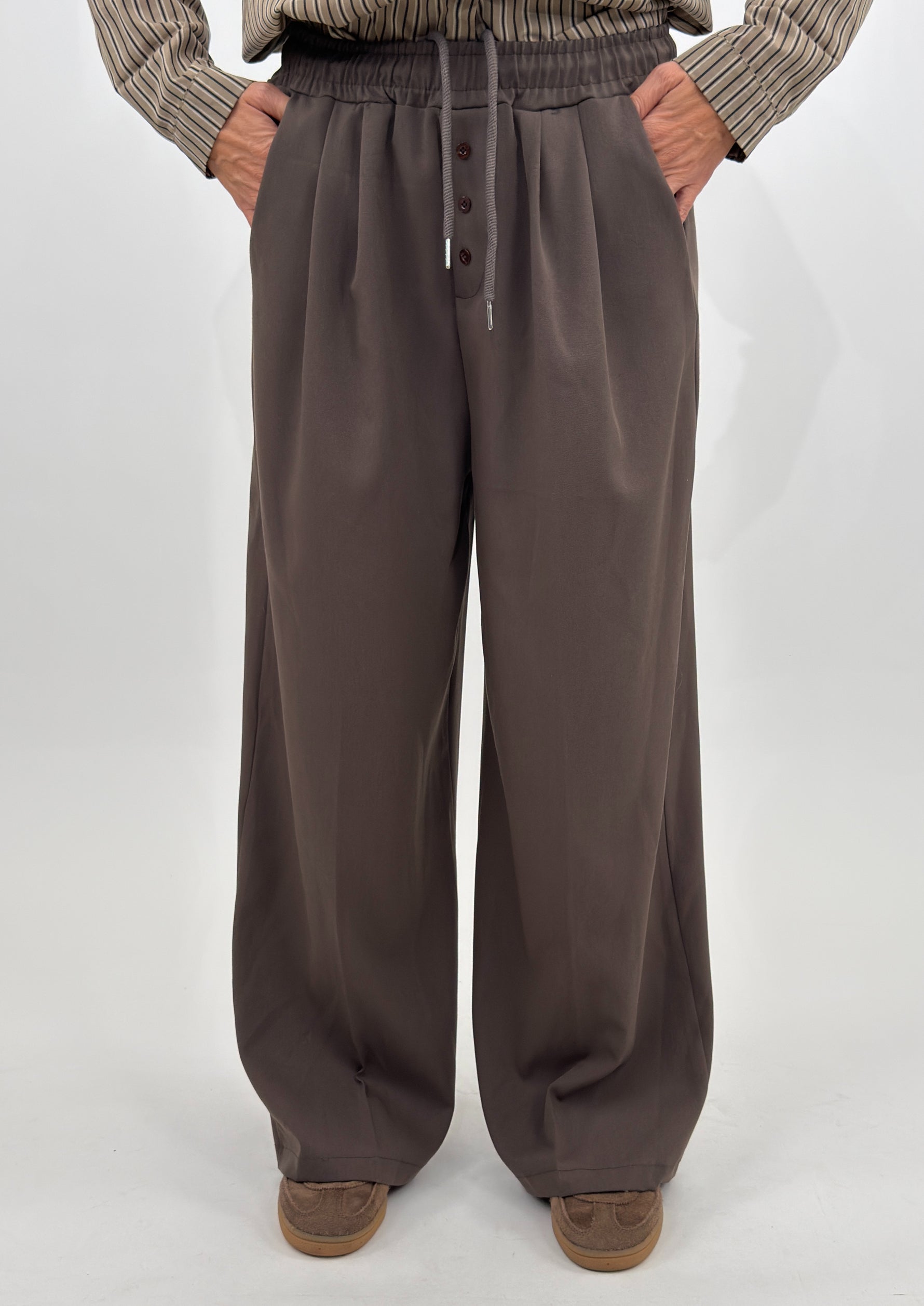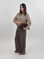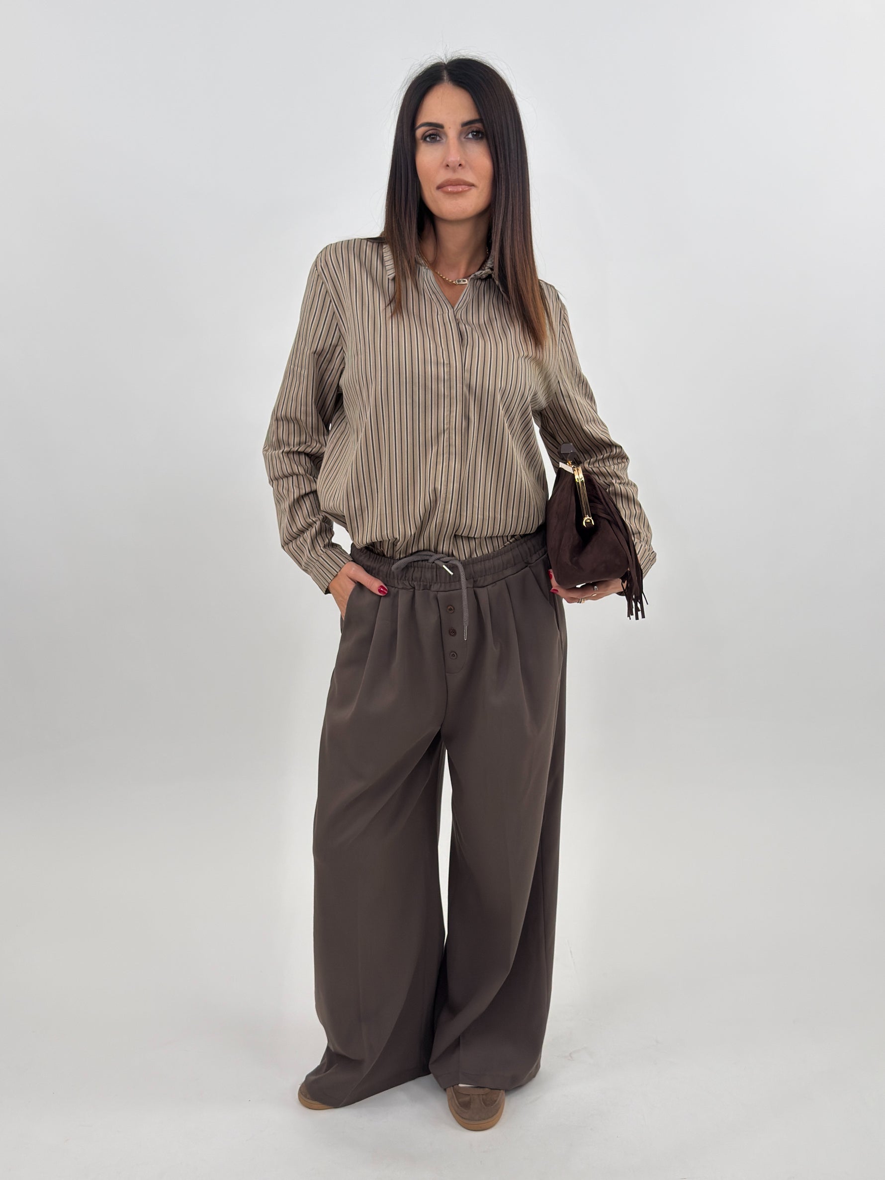 Pantalone modello a gamba larga con tasche laterali e pinces sul davanti. Bustino con elastico in vita e laccetti regolabili. Finti bottoncini sul davanti.