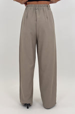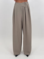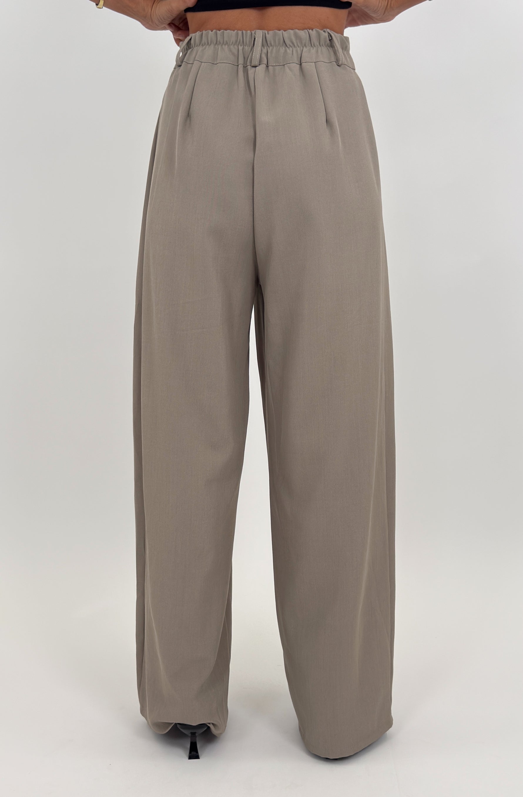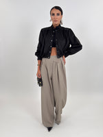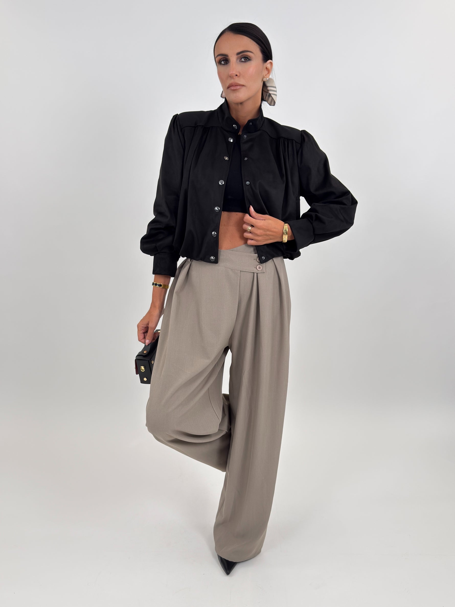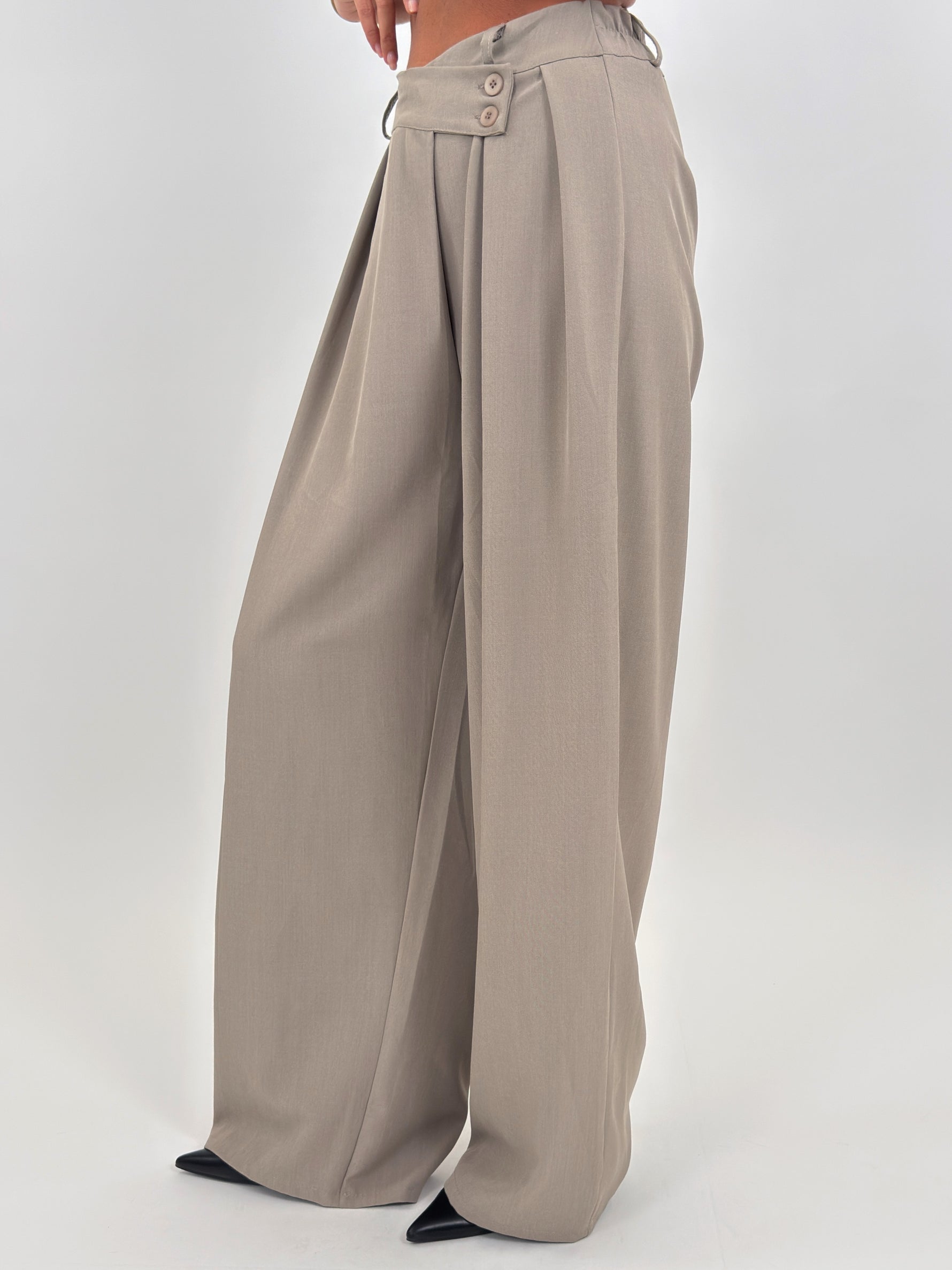 Pantalone a gamba larga con pinces sul davanti. Bustino con elastico sul retro e chiusura asimmetrica con due bottoni sul lato sinistro e zip.