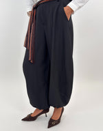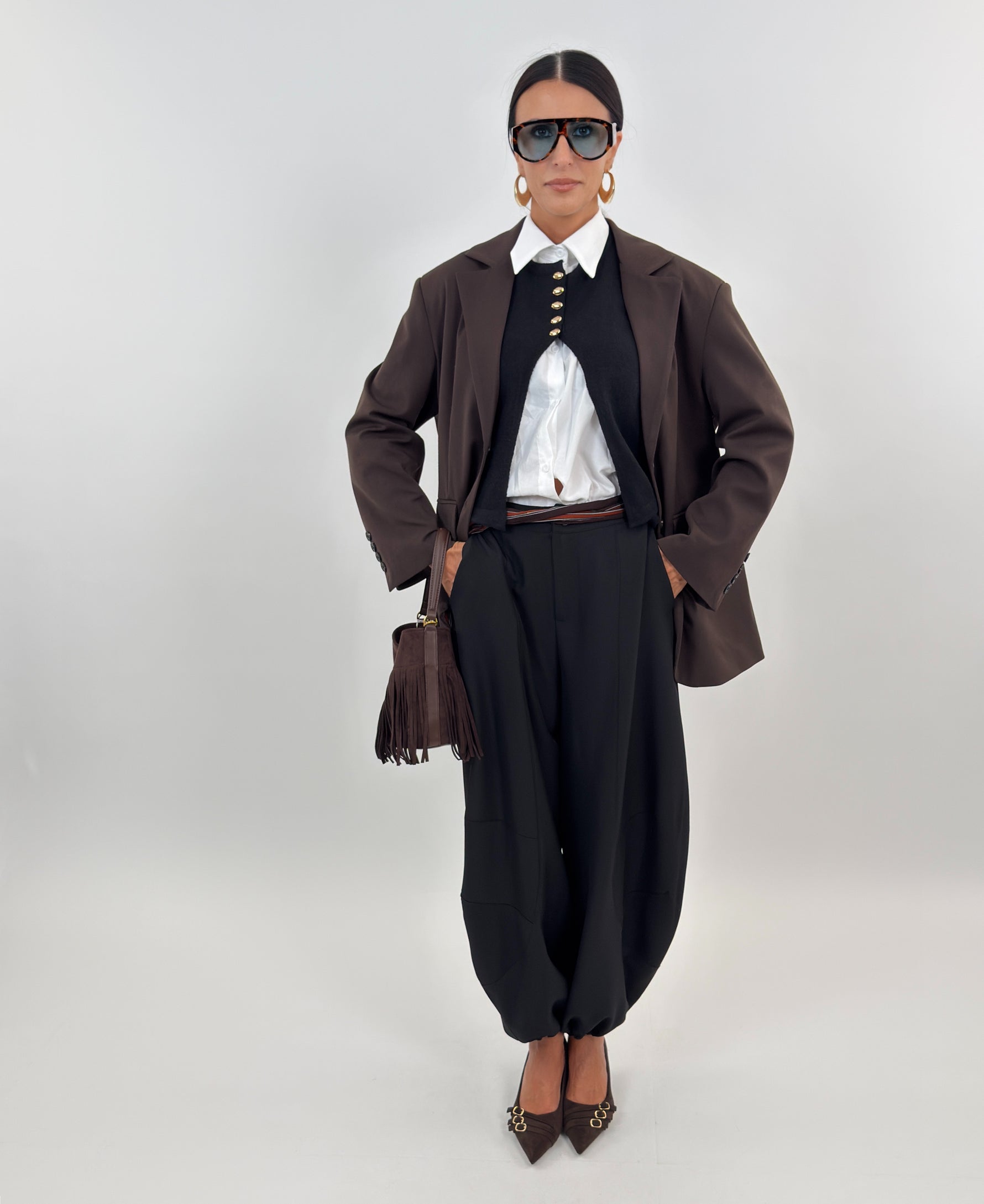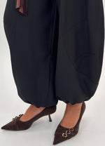 Pantalone a gamba larga, modello balloon con tasche laterali. Bustino con cintura inclusa, elastico sul retro e chiusura frontale con zip e bottone. Fondo arricciato con laccetto regolabile.