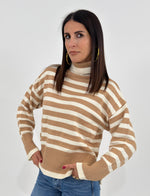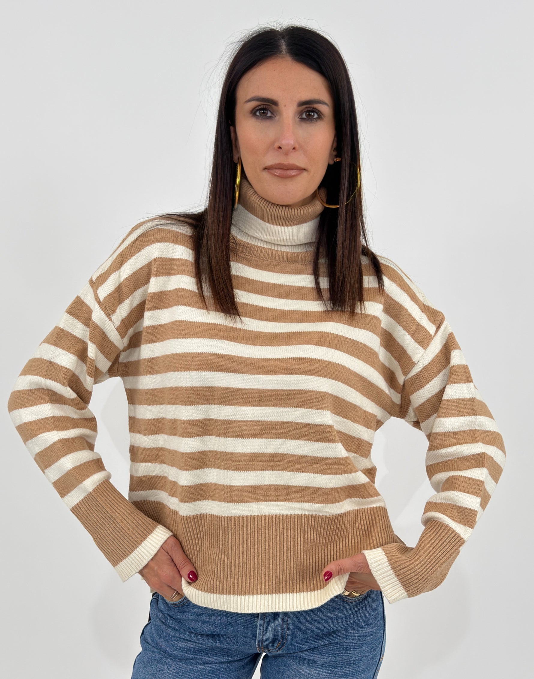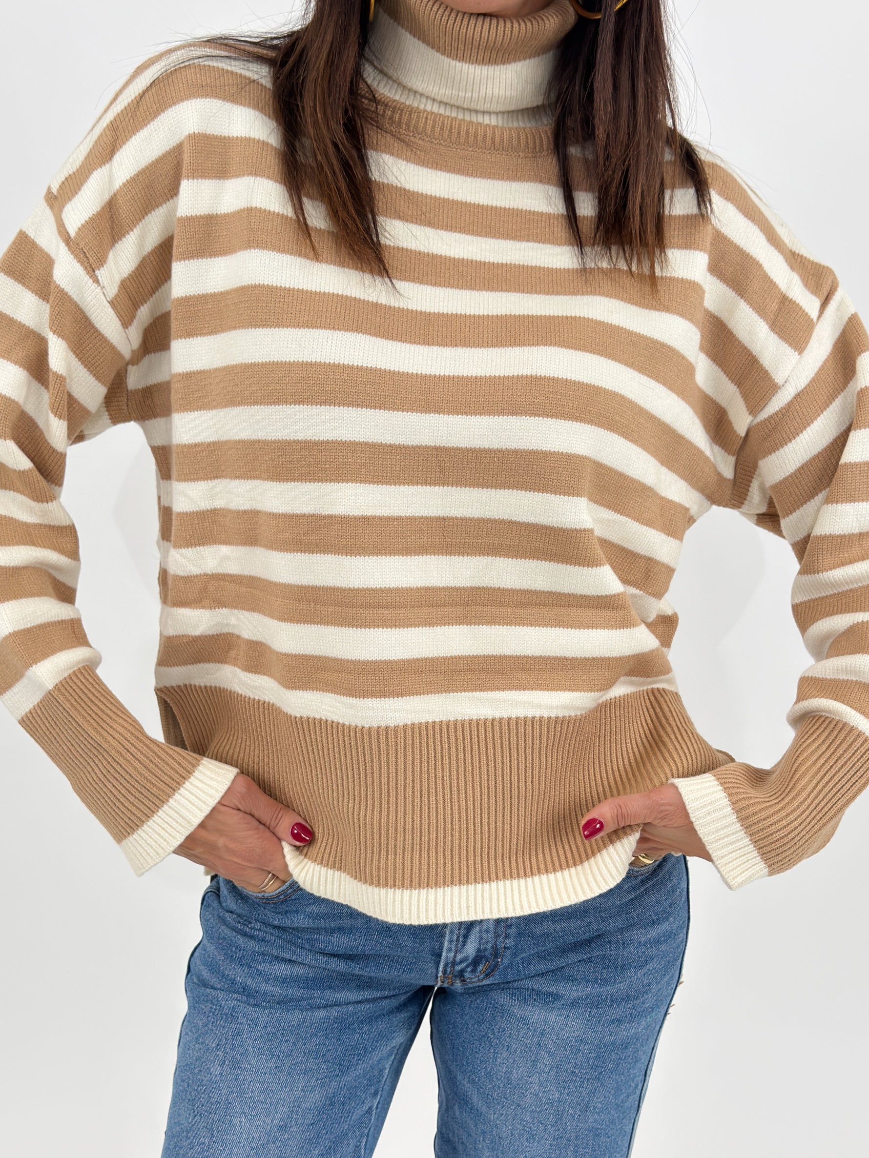 Dolcevita con motivo a righe orizzontali a contrasto di colore. Maniche lunghe con spalle cadenti e polsino finale a coste. Spacchetti laterali.